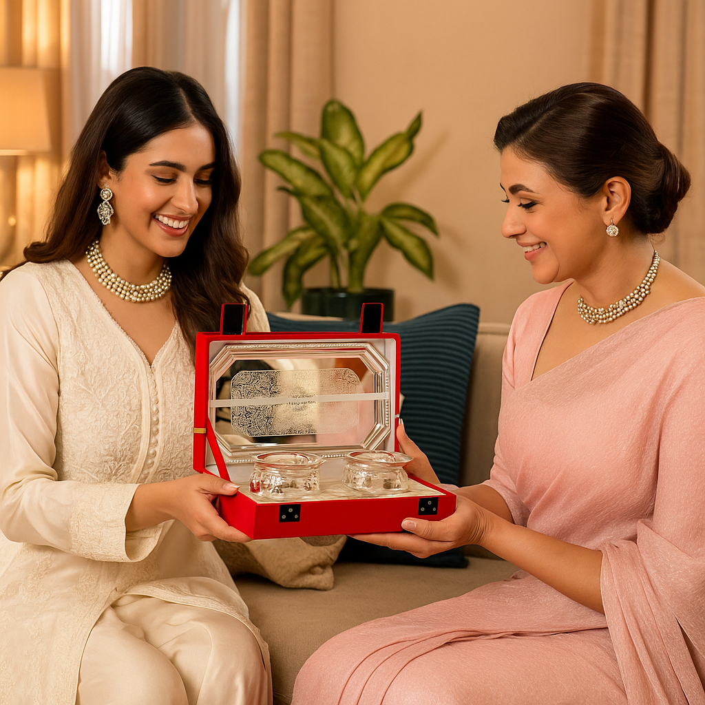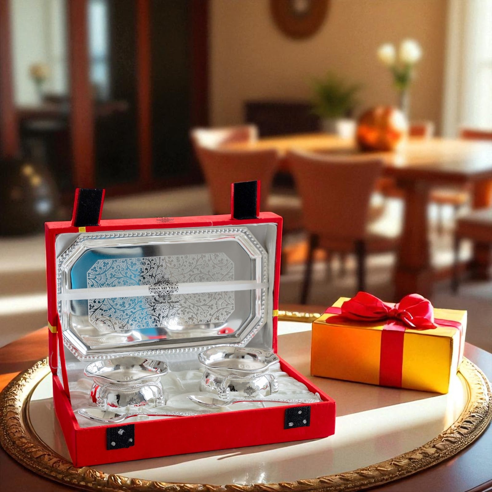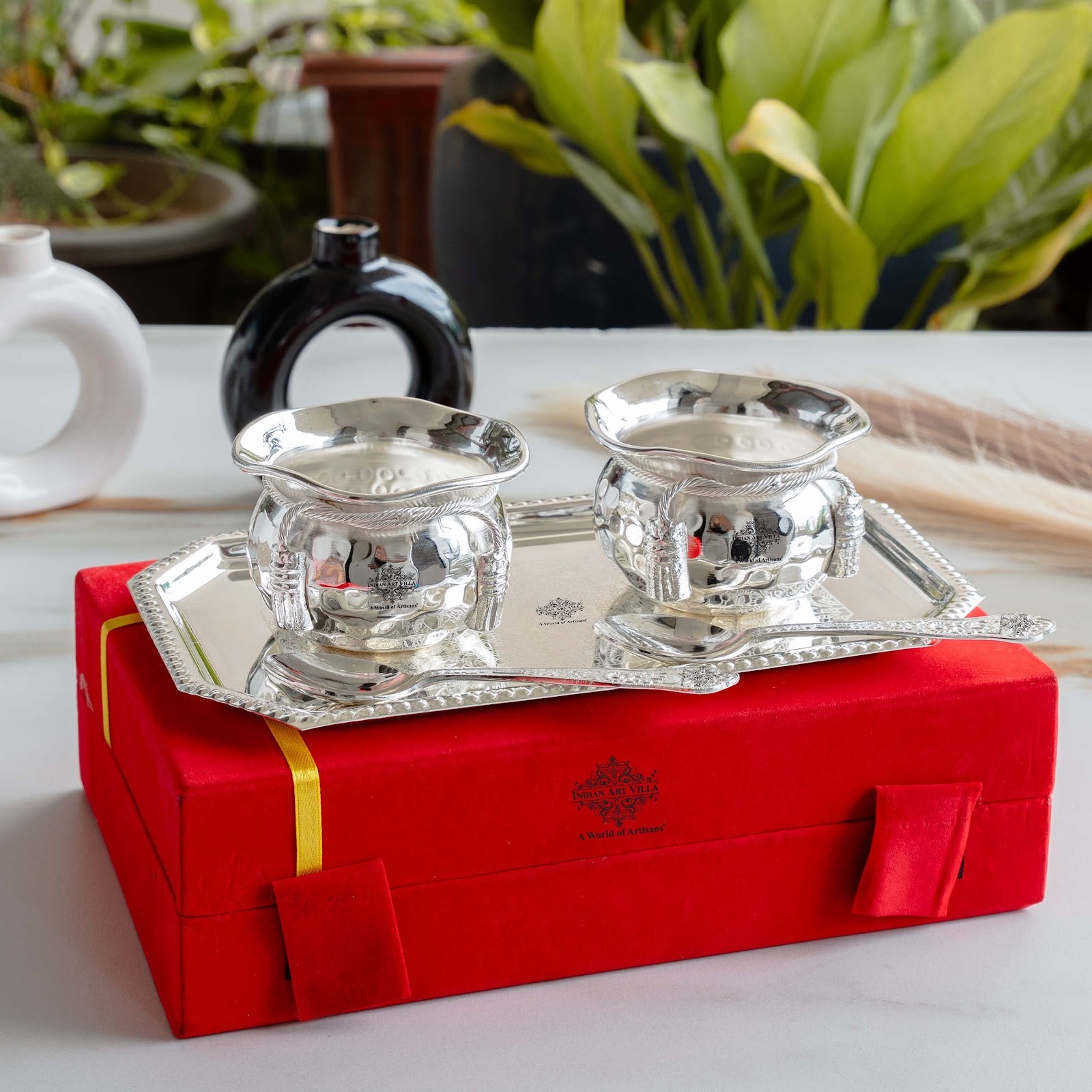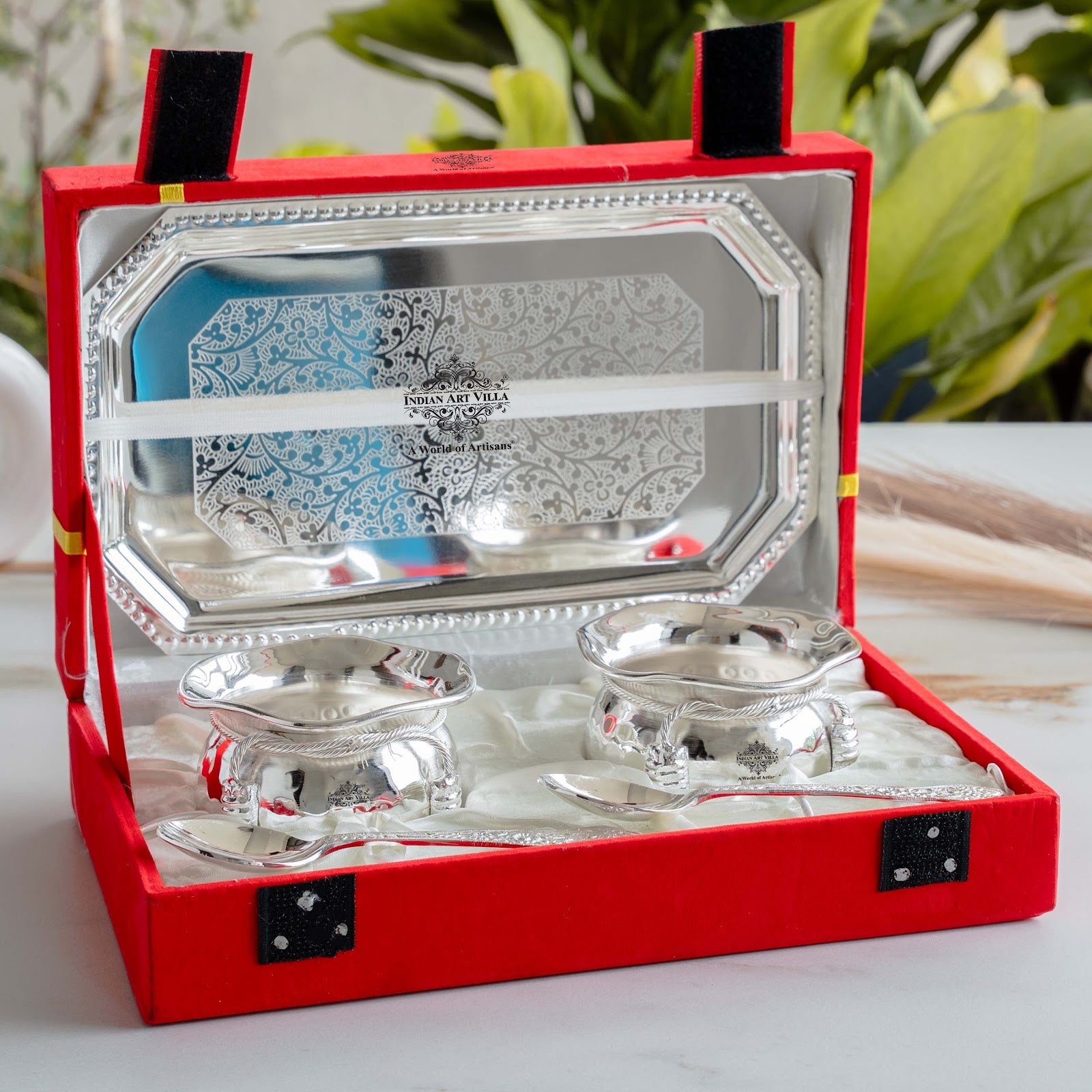 Premium Silver Plating: Entire set — bowls, tray, and spoons — is plated with pure silver, delivering a luminous shine and luxurious feel suitable for formal and festive occasions.