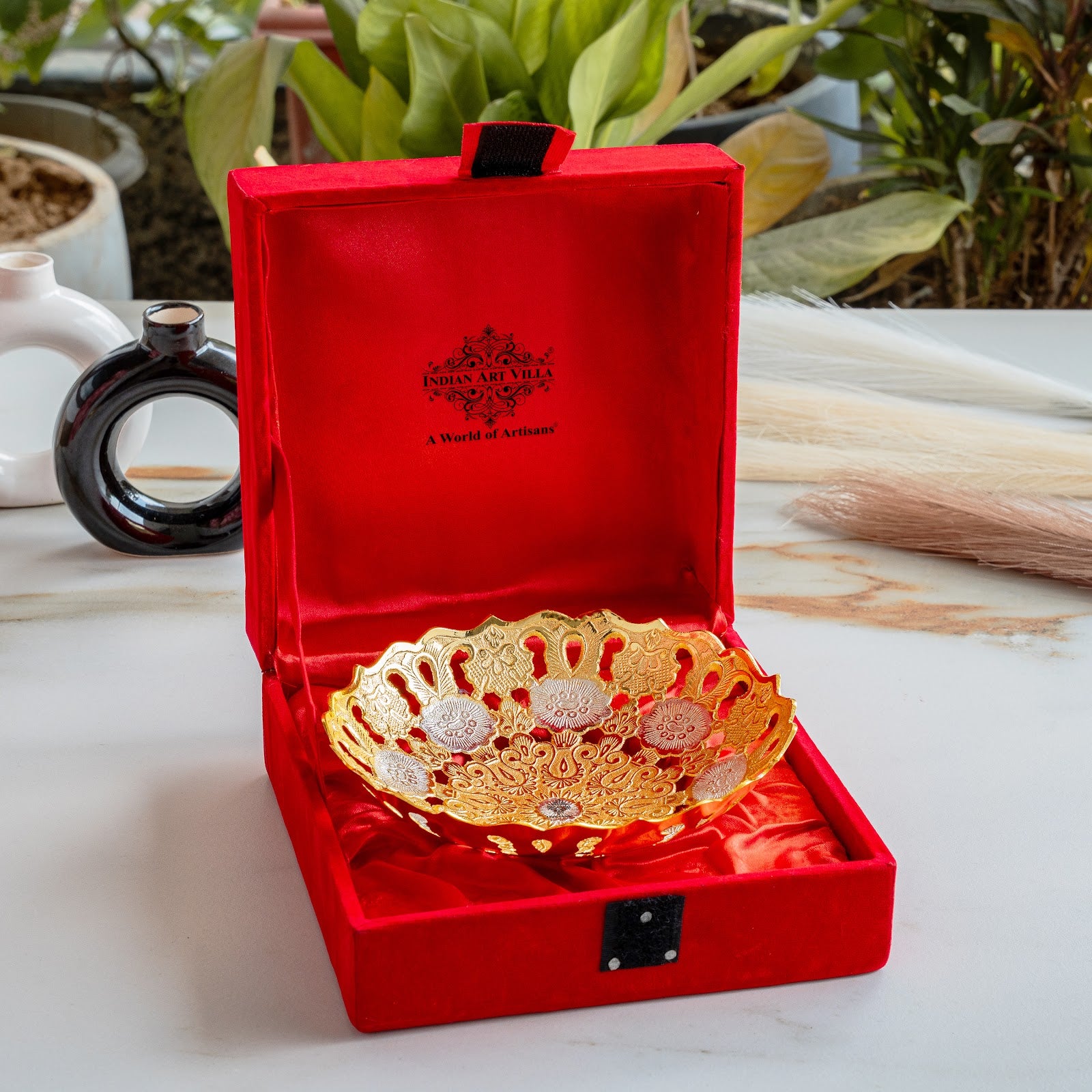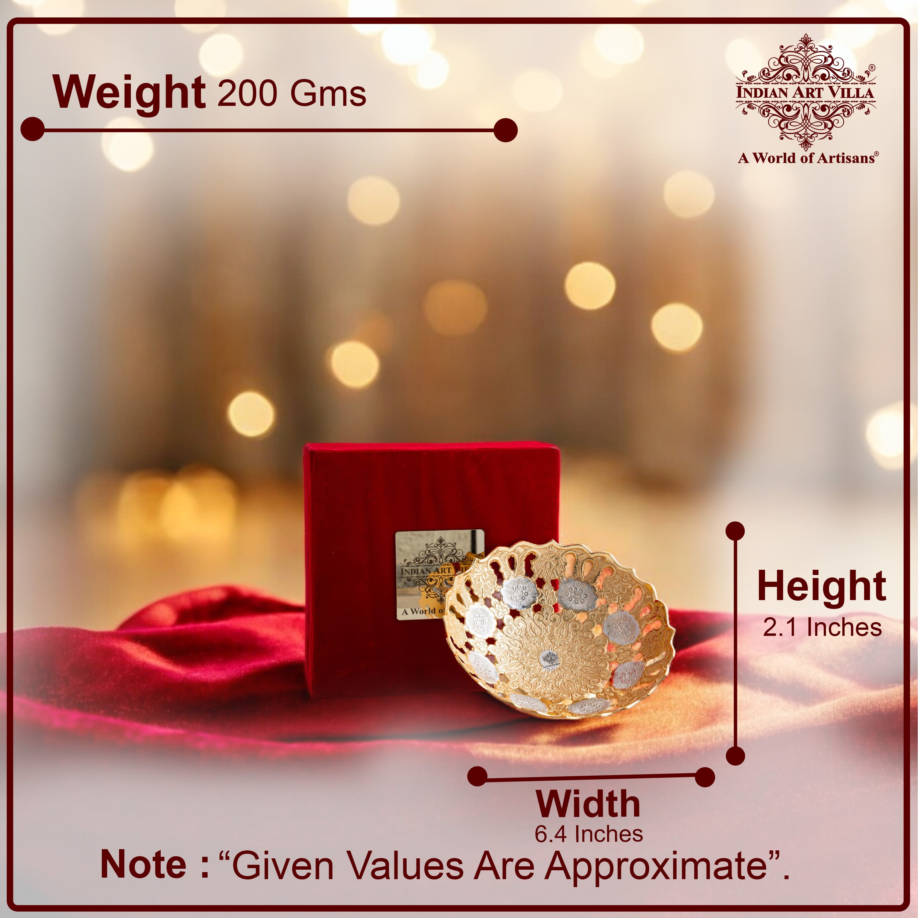 Indian Art Villa Silver & Gold Plated Designer Bowl, a masterpiece that seamlessly blends traditional craftsmanship with modern aesthetics. This stunning 6-inch bowl is a testament to the rich heritage of Indian artistry, meticulously designed to bring a touch of opulence to your home. Crafted from a durable metal base, the bowl undergoes a meticulous process of silver and gold plating, ensuring a radiant finish that not only radiates luxury but also promises longevity and resistance to tarnishing. The intricate design is inspired by traditional Indian motifs, featuring delicate patterns and embossing that reflect the country's cultural richness. Indian Art Villa Silver & Gold Plated Designer Bowl – more than just a piece of decor, it's a celebration of India's artistic legacy and a symbol of refined luxury that transforms your home into a haven of traditional opulence.