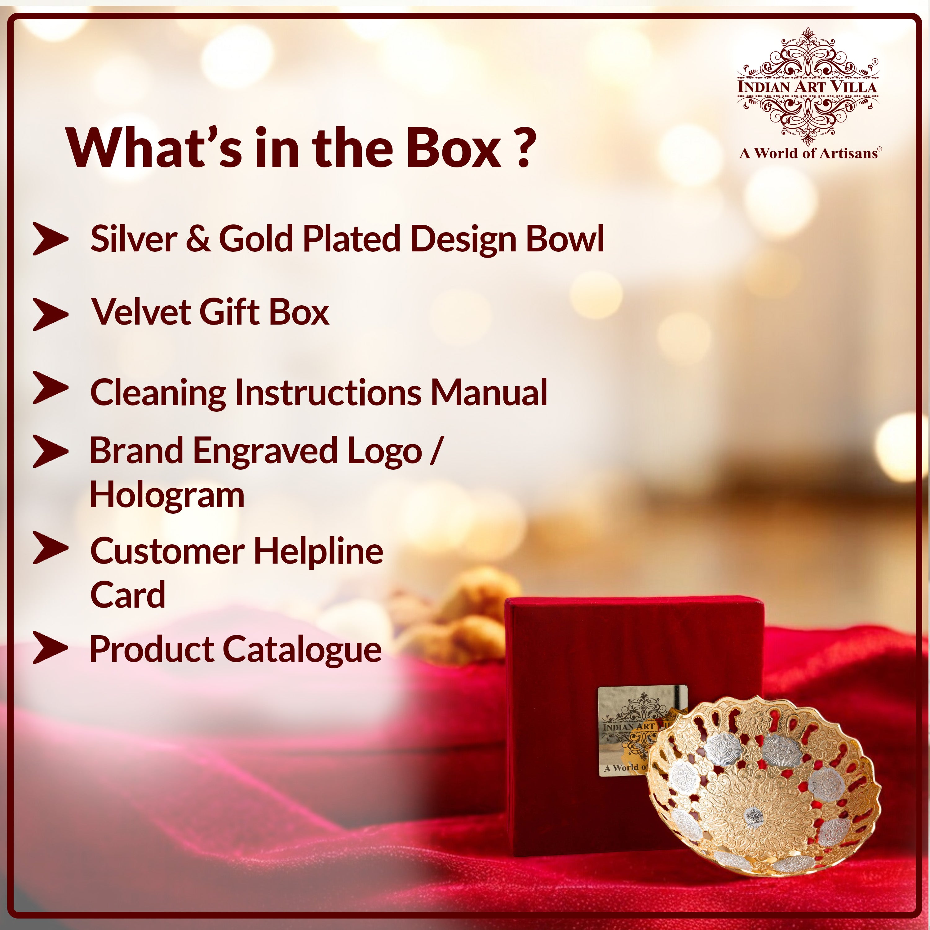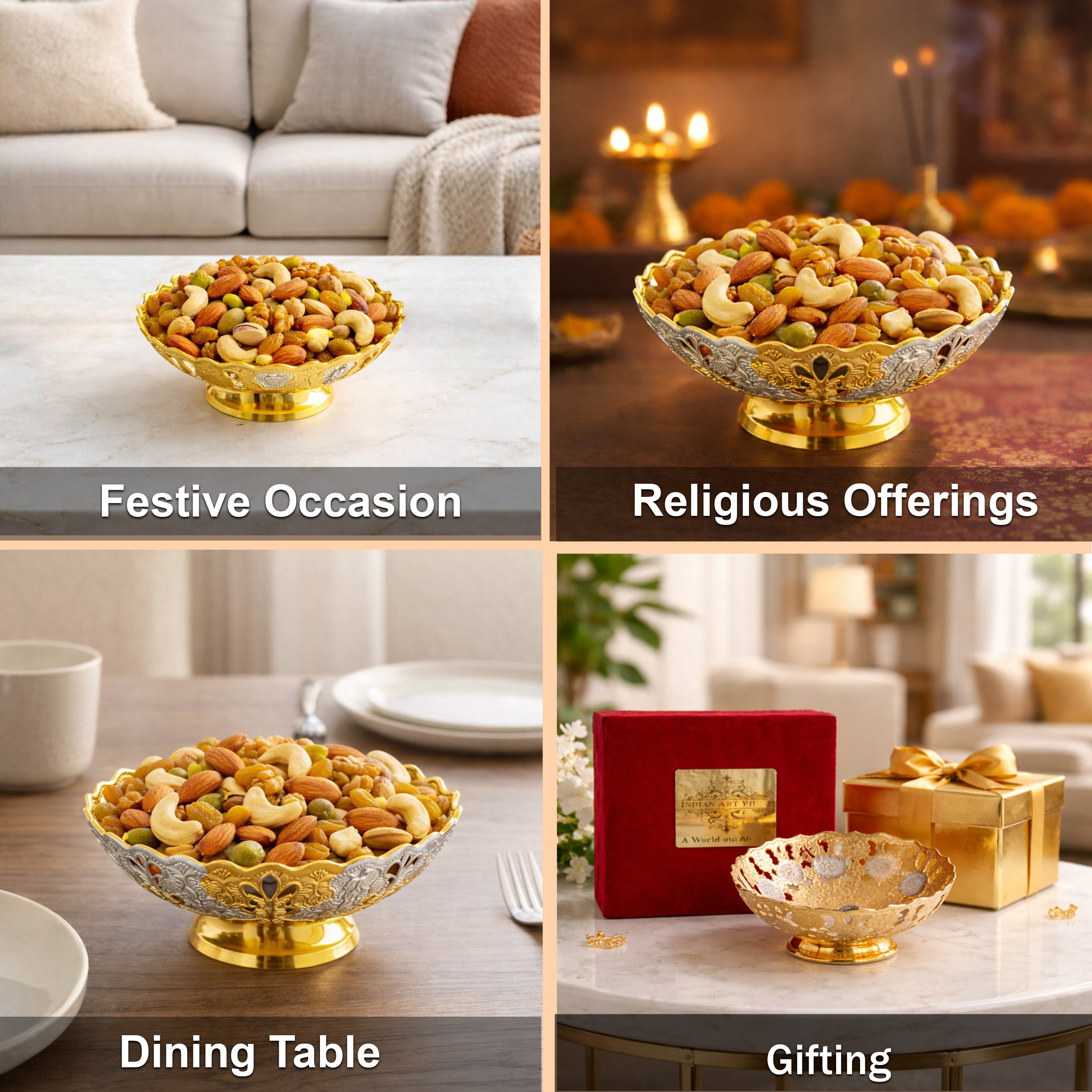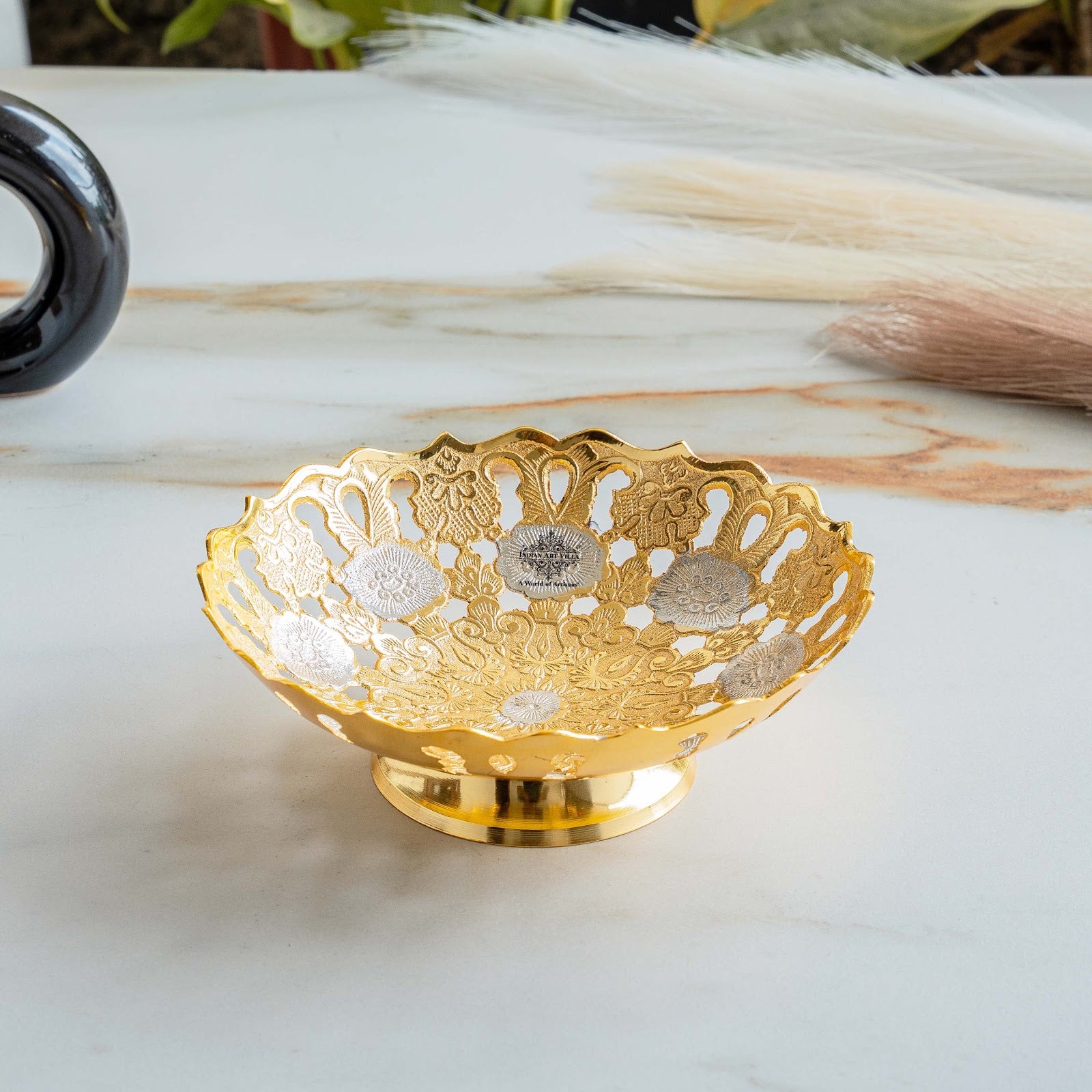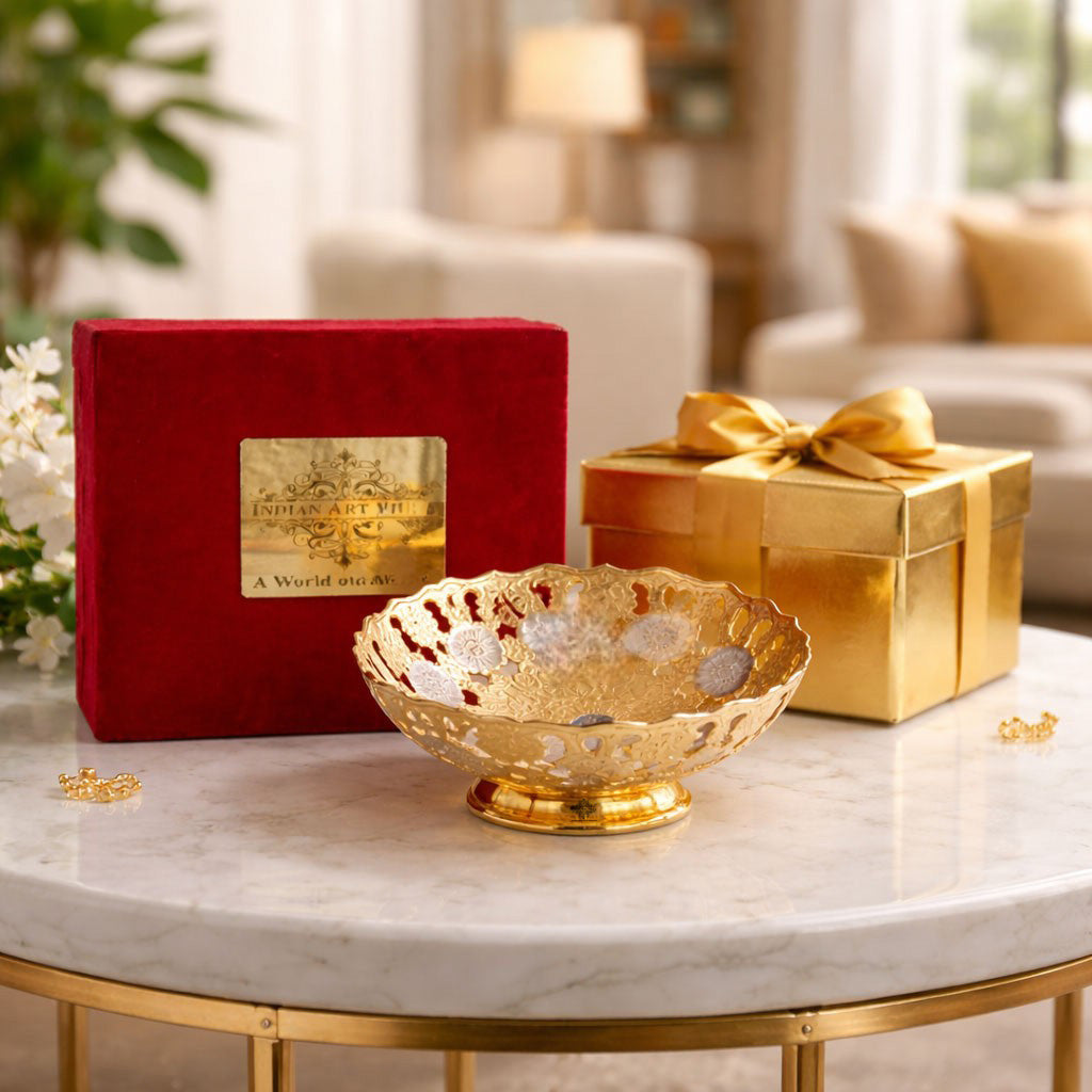 Material: The bowl is typically made from a base material, which could be brass, copper, or another metal. It is then plated with a layer of silver and gold for a luxurious look.