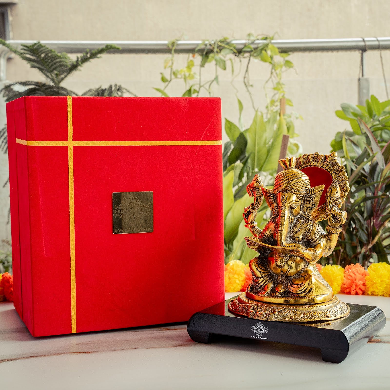Brass Finish Ganesh Ji Murti with Wooden Base & Velvet Box