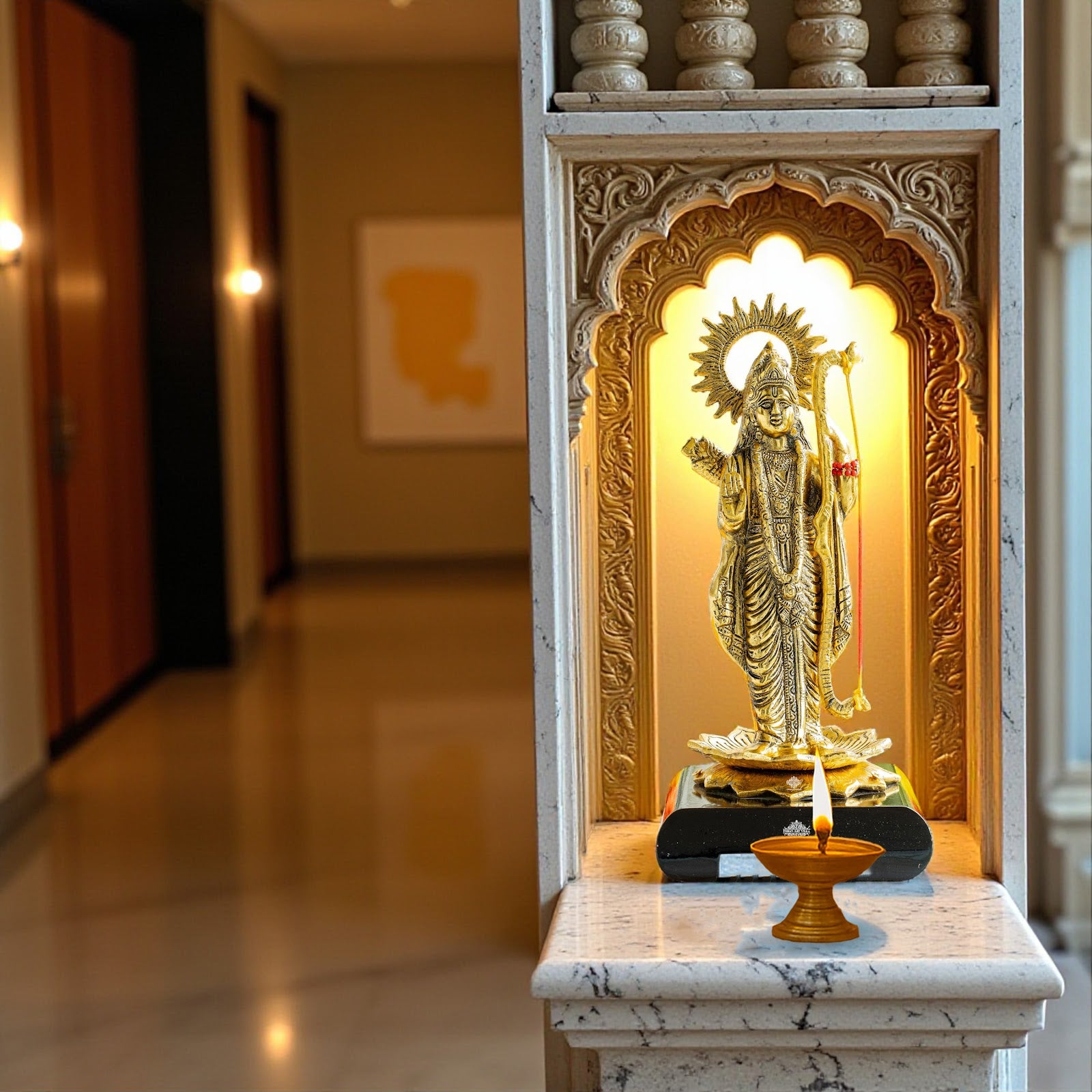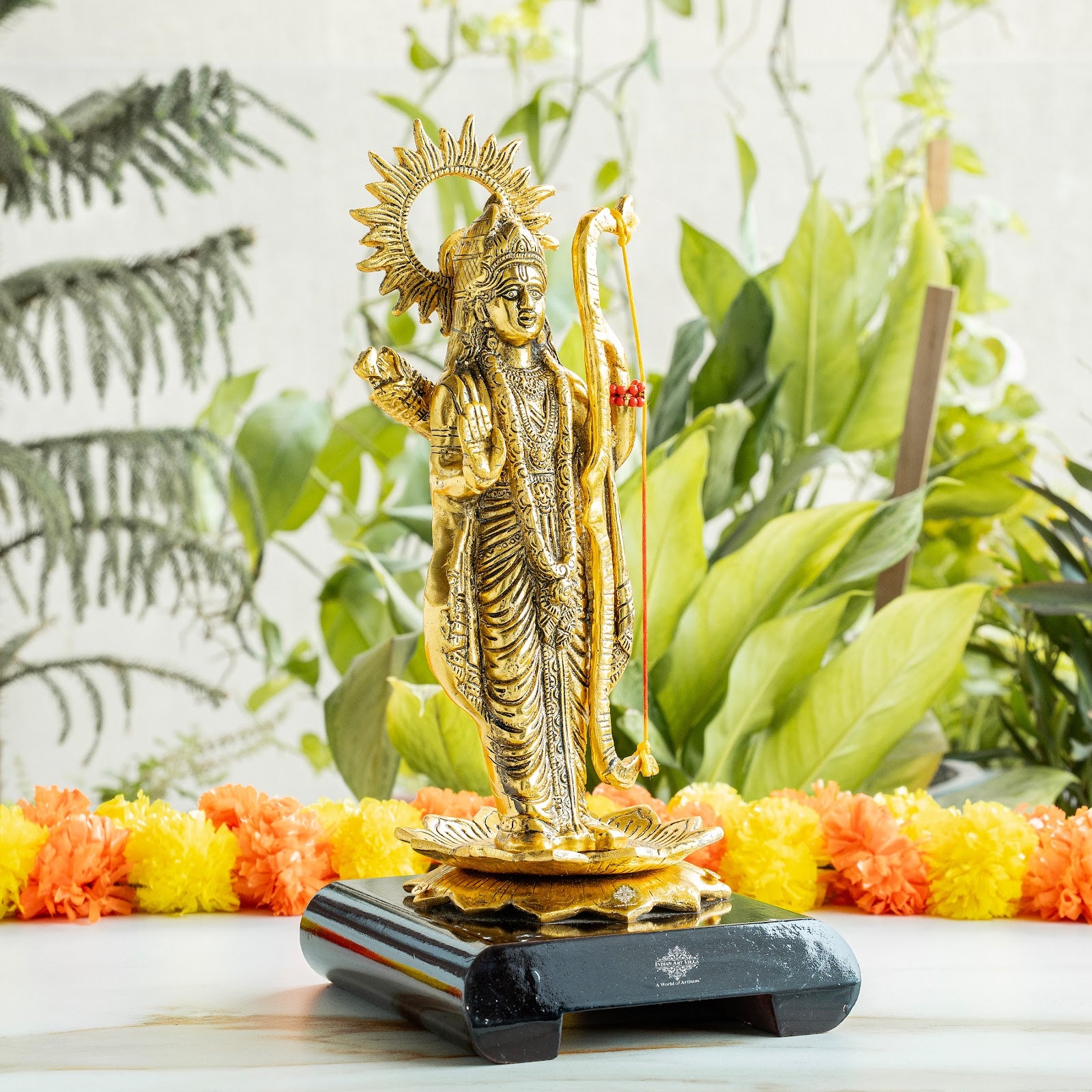 The murti depicts Lord Ram standing gracefully on a lotus platform, holding his bow and arrow – symbols of righteousness, strength, and protection. A beautifully designed halo (Prabhavali) behind his head enhances the divine aura, making it a perfect centerpiece for worship as well as décor.