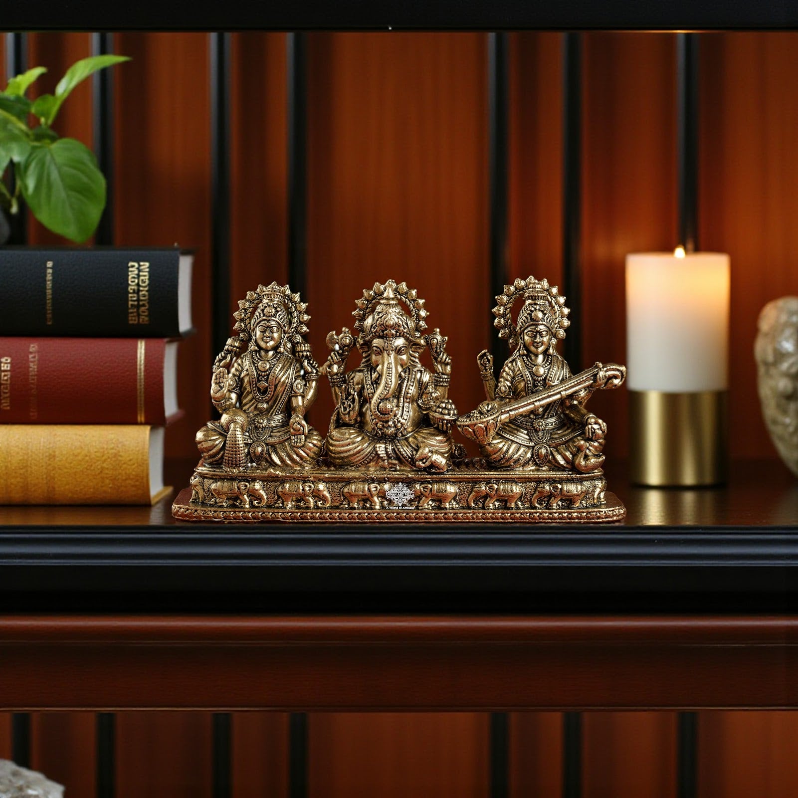• Intricate Laxmi Ji Ganesh Ji & Saraswati Ji Design: Features a detailed brass design, symbolizing prosperity and remover of obstacles.
