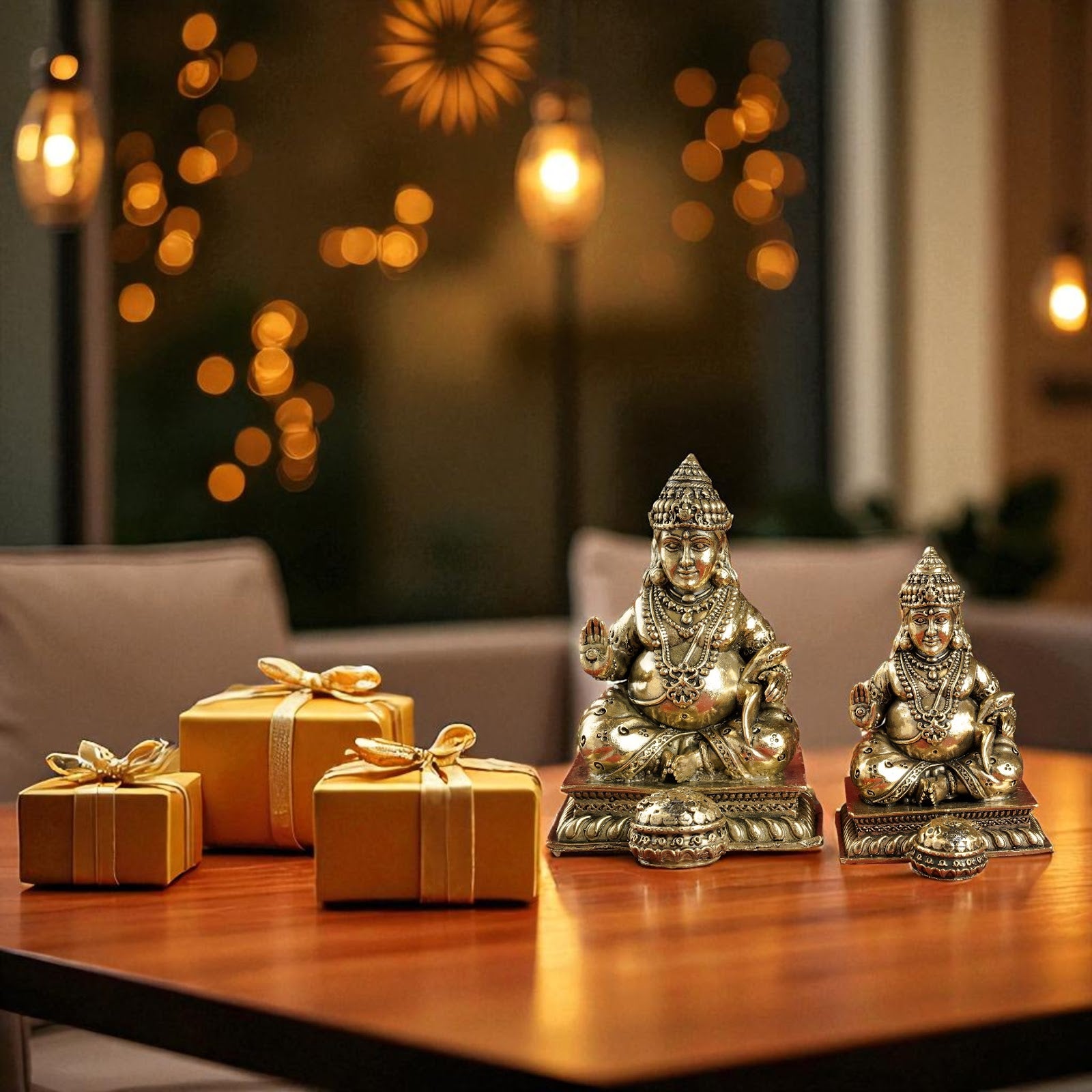 Handcrafted from premium brass, this idol reflects Indian craftsmanship at its finest, making it both a devotional and decorative masterpiece. It is also a perfect gift to bless loved ones with wealth, security, and prosperity.