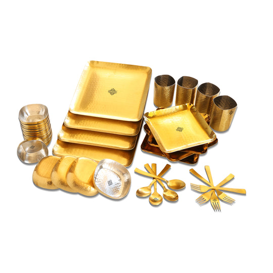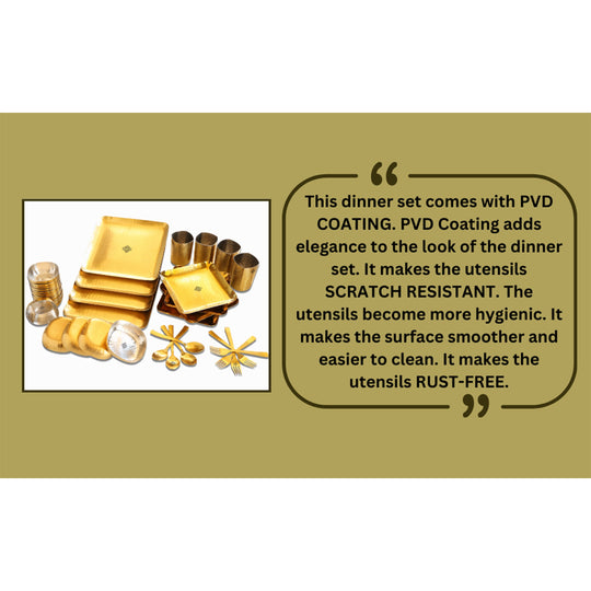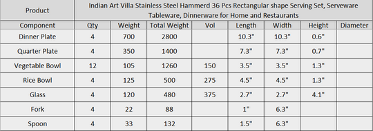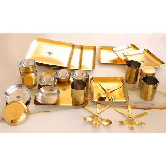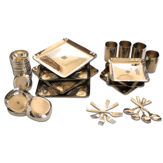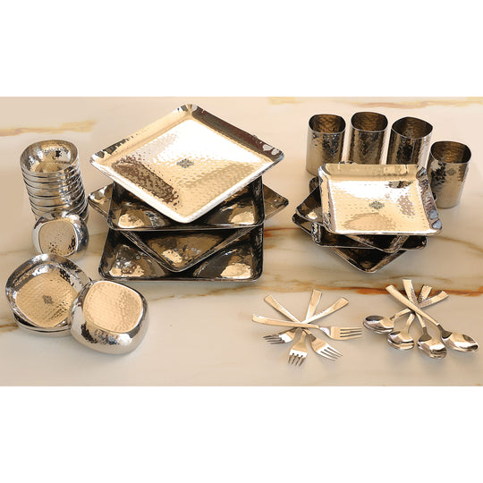 - These Pure Stainless Steel Hammered 36 Pcs Rectangular shape Dinner Set also have Trendy looks for better ergonomics. You can add Royal Vintage Look to your Kitchen & Dining by using these Set as your Dinnerware/Serveware Purpose.