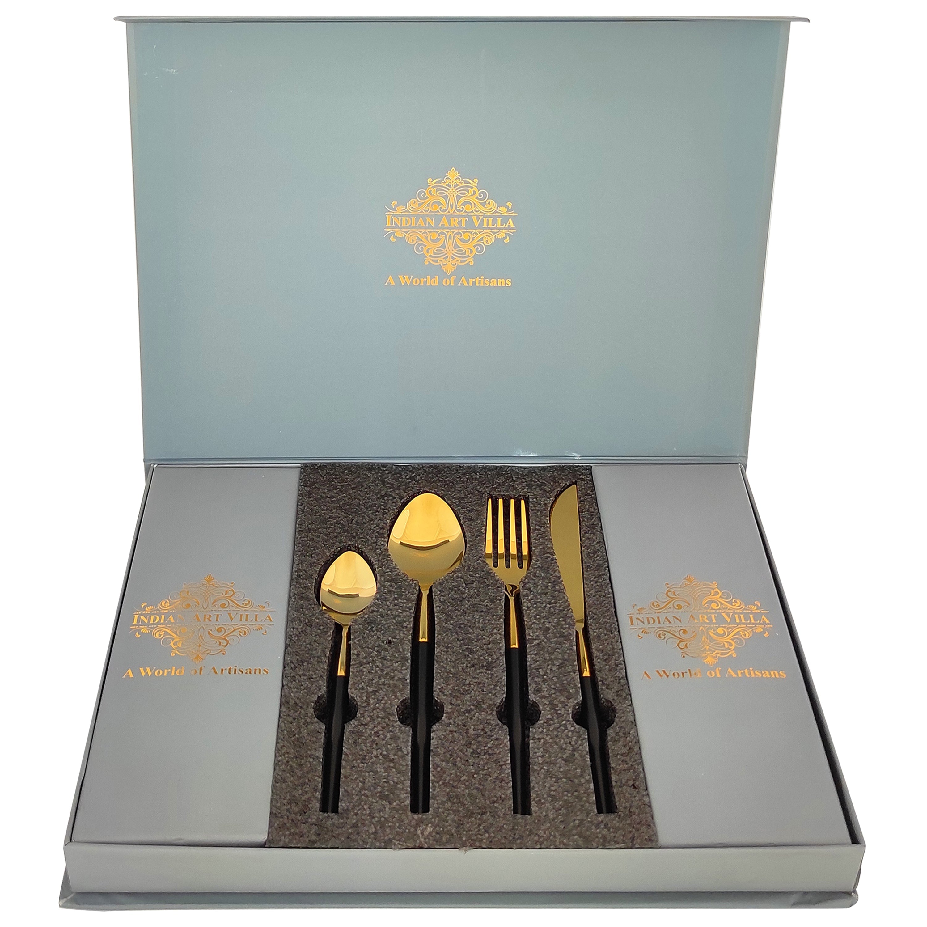 - Indian Art Villa Pure Stainless Steel Black Gold Shine Finish Cutlery Set, it was almost impossible to find one that came in a design other than the plain one. Indian Art Villa Provide You with different designs to choose from, allowing you to pick your favorite design or collect them all for those who want a variety of options.