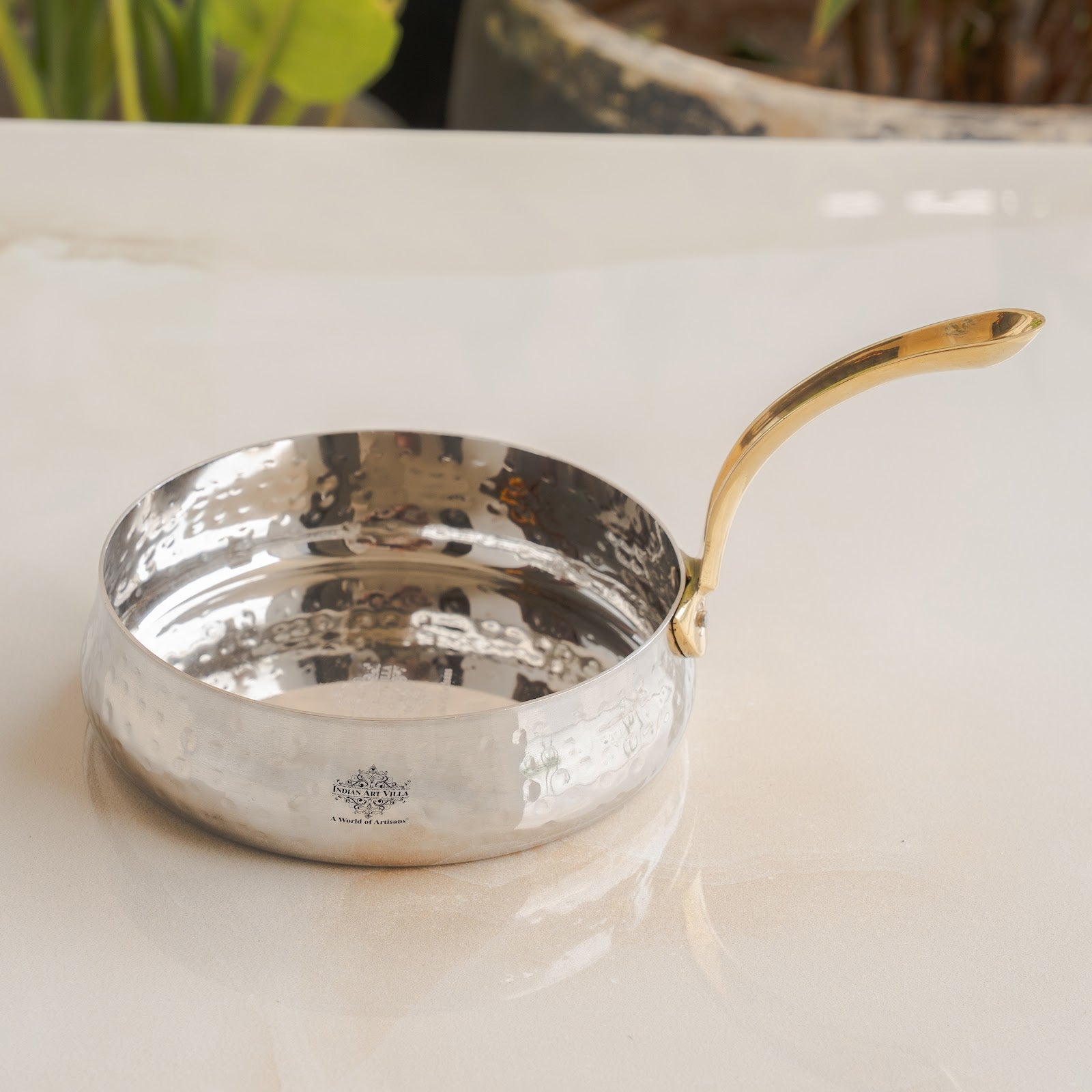 Indian Art Villa Stainless Steel Hammered Curved Serving Sauce Pan, the perfect addition to your serveware collection. Crafted with precision and elegance, this Sauce Pan features a stunning hammered design that adds a touch of sophistication to your dining experience. Made from high-quality stainless steel, this sauce pan ensures durability and long-lasting performance. The curved shape enhances its aesthetic appeal while also providing a convenient grip for easy serving. Whether you're hosting a dinner party or simply enjoying a cozy meal at home, this sauce pan is an ideal choice for serving your favorite sauces, gravies, and condiments. With its sleek and contemporary design, it seamlessly blends with any table setting, making it suitable for both casual and formal occasions. The stainless steel construction ensures easy cleaning and maintenance, while the hammered texture adds a unique visual appeal. Elevate your culinary presentation with the Indian Art Villa Stainless Steel Hammered Curved Serving Sauce Pan, a must-have for every kitchen and dining area.