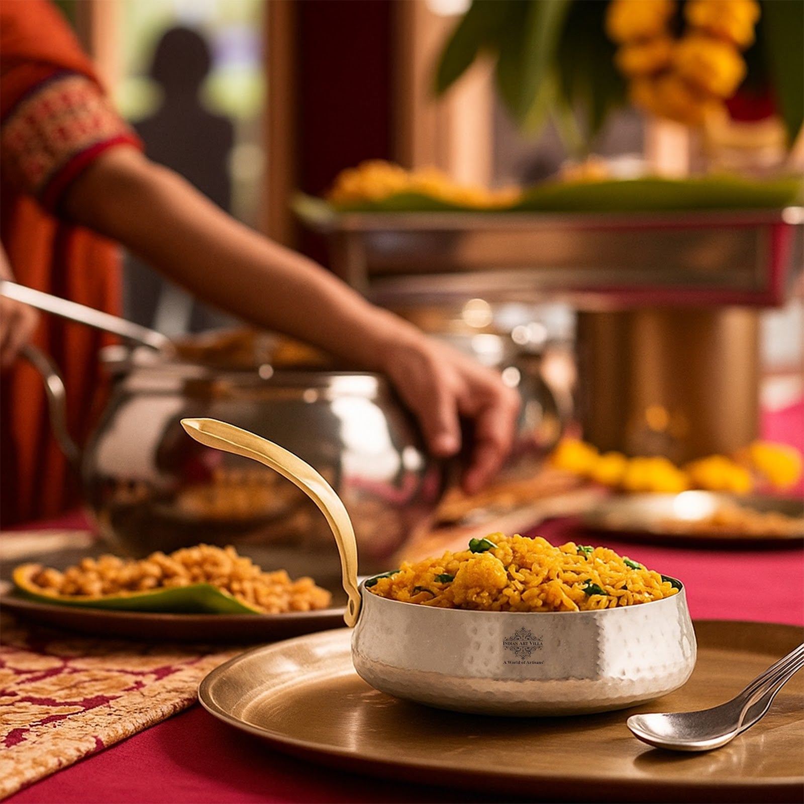 - Indian Art Villa Stainless Steel Curved Design Serving Sauce Pan, it was almost impossible to find one that came in a design other than the plain one. Indian Art Villa Provide You with different designs to choose from, allowing you to pick your favorite design or collect them all for those who want a variety of options.