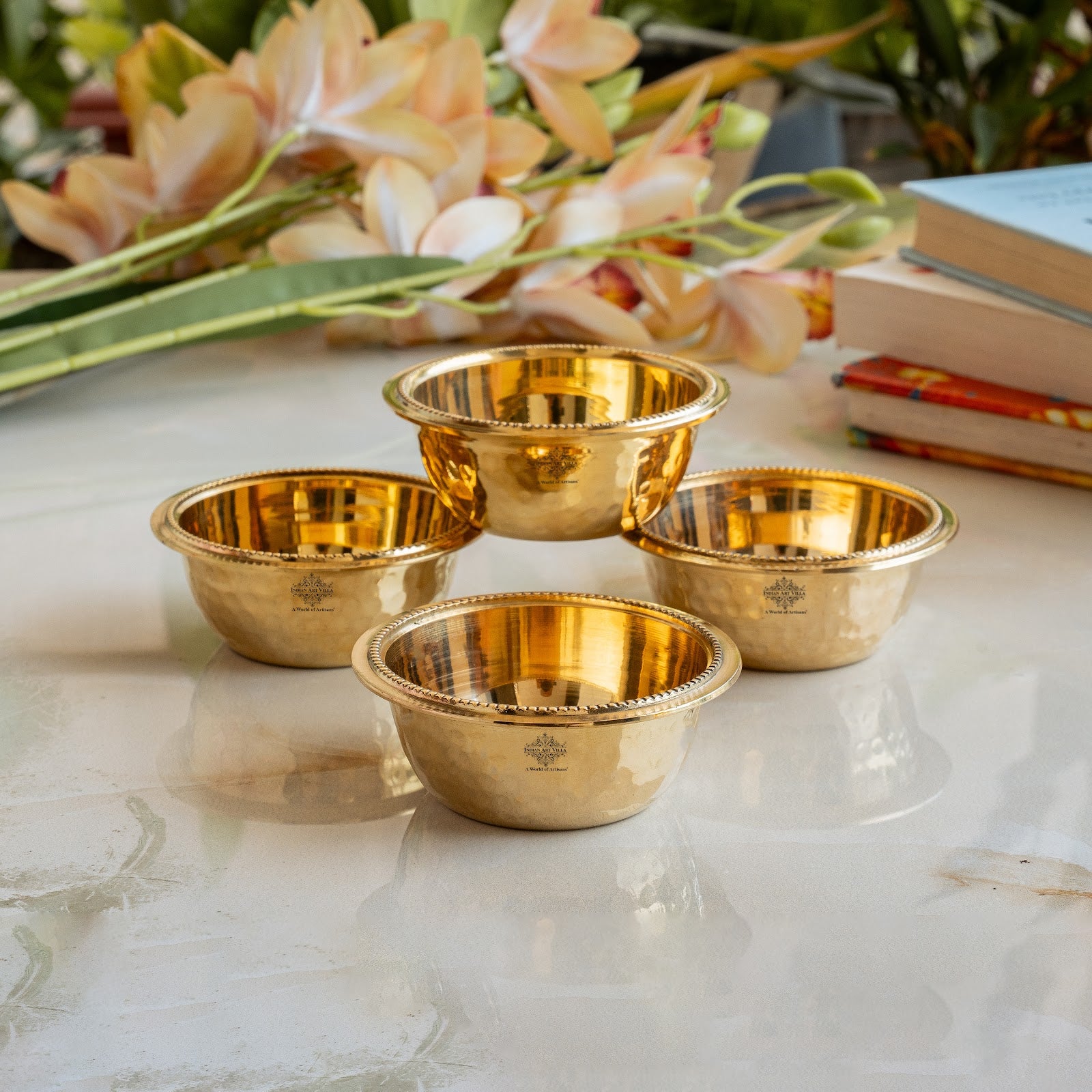 Indian Art Villa hammered beading design brass bowl epitomizes the timeless elegance and artisanal craftsmanship of Indian heritage. Crafted with meticulous attention to detail, this exquisite piece seamlessly blends traditional aesthetics with modern functionality, making it a captivating addition to any home décor. At the heart of this brass bowl lies a rich tradition of craftsmanship, where skilled artisans employ age-old techniques to shape and adorn each piece by hand. The brass material, renowned for its durability and lustrous finish, serves as the perfect canvas for the intricate hammered texture and beading design that adorn its surface. The hammered texture adds depth and character to the bowl, creating a captivating interplay of light and shadow, while the delicate beading design showcases the artisans' mastery of intricate detailing. Indian Art Villa hammered beading design brass bowl is more than just a decorative object—it is a symbol of tradition, craftsmanship, and timeless elegance, inviting you to immerse yourself in the rich tapestry of Indian culture with every glance.