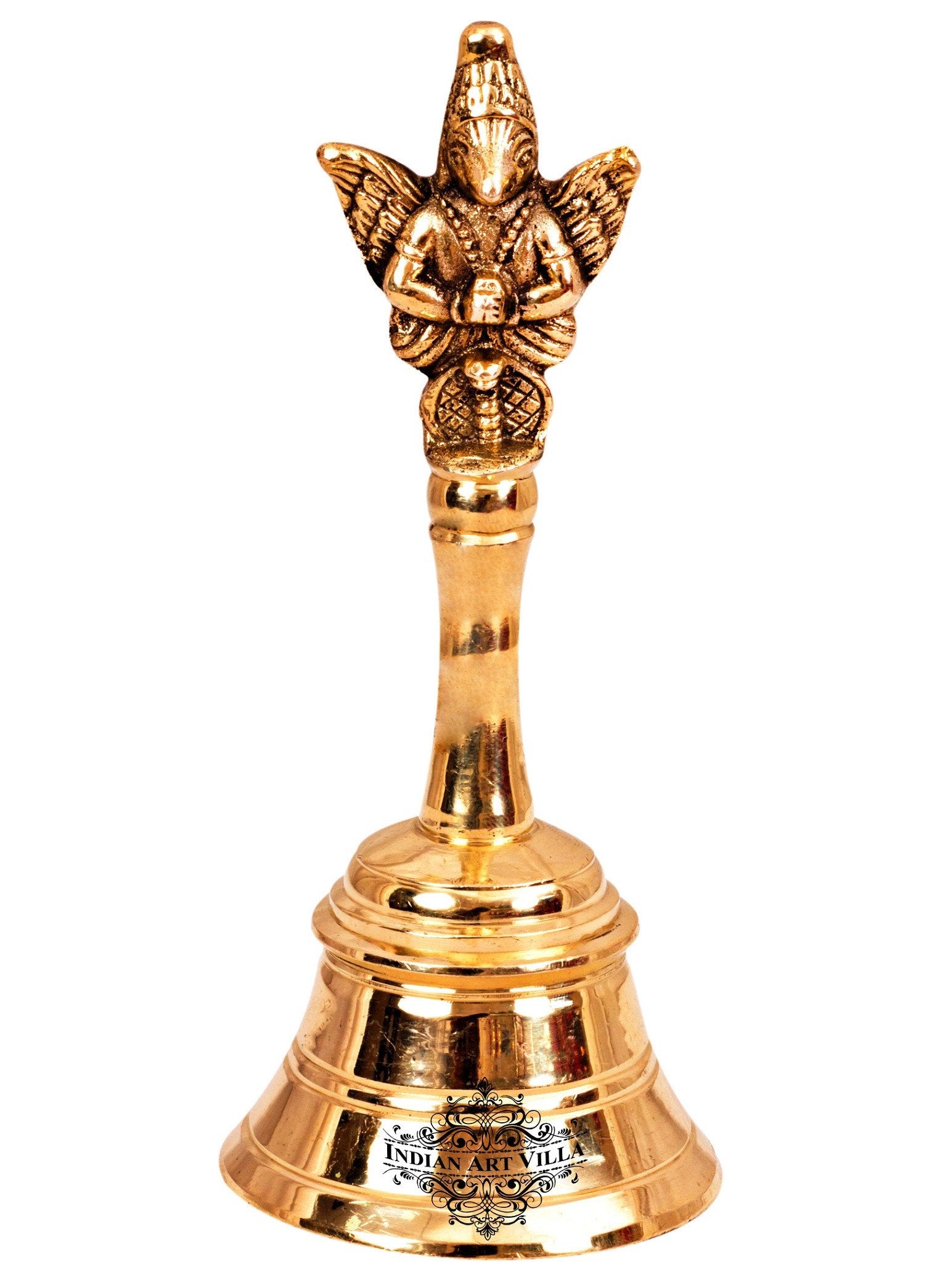 Indian Art Villa Pure Garuda Under Sheshanag Design Brass Pooja Ghanti Bell, an embodiment of divine spirituality and exquisite craftsmanship. This stunning brass bell is designed with the traditional motif of Garuda, the sacred bird, seated under the protective hood of Sheshanag, the multi-headed serpent. Crafted with precision and attention to detail, this Pooja Ghanti bell emits a melodious sound that resonates through the air, creating a serene and tranquil ambiance during your prayer rituals. The brass material adds a touch of elegance and durability to the bell, ensuring its longevity. Whether you're seeking a beautiful addition to your PooNov. temple or a unique gift for someone special, the Indian Art Villa Pure Garuda Under Sheshanag Design Brass Pooja Ghanti Bell will elevate your spiritual experiences. Embrace the rich cultural heritage of India with this divine artifact, and immerse yourself in the sacred traditions of Pooja and meditation.