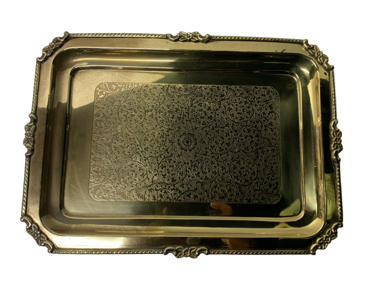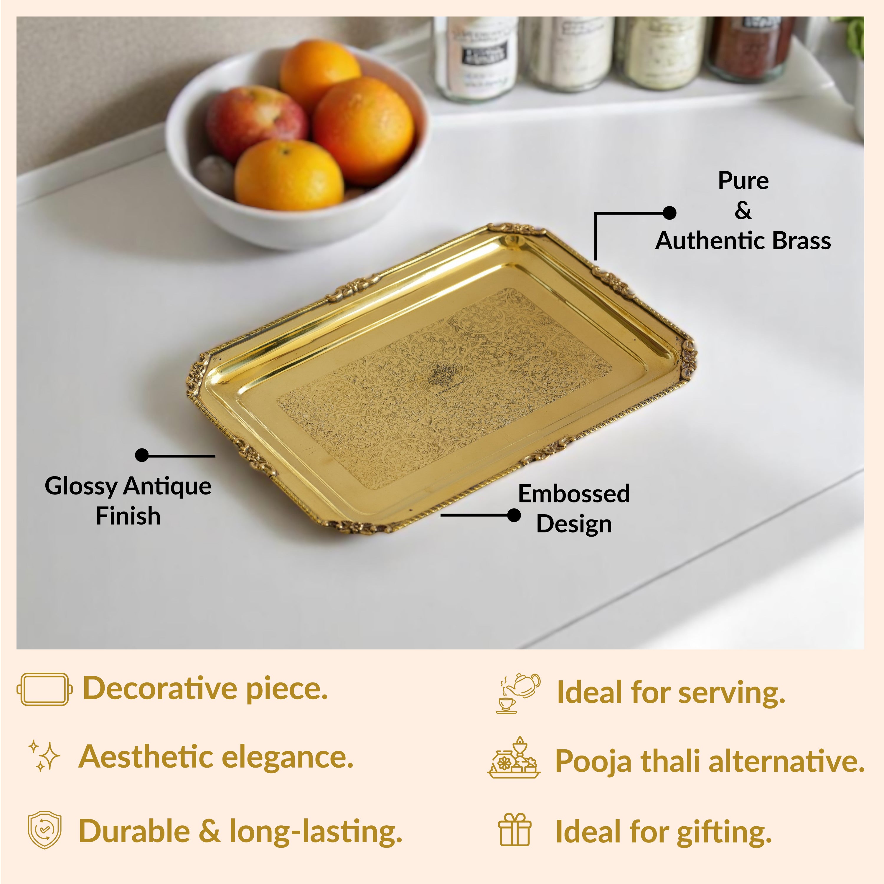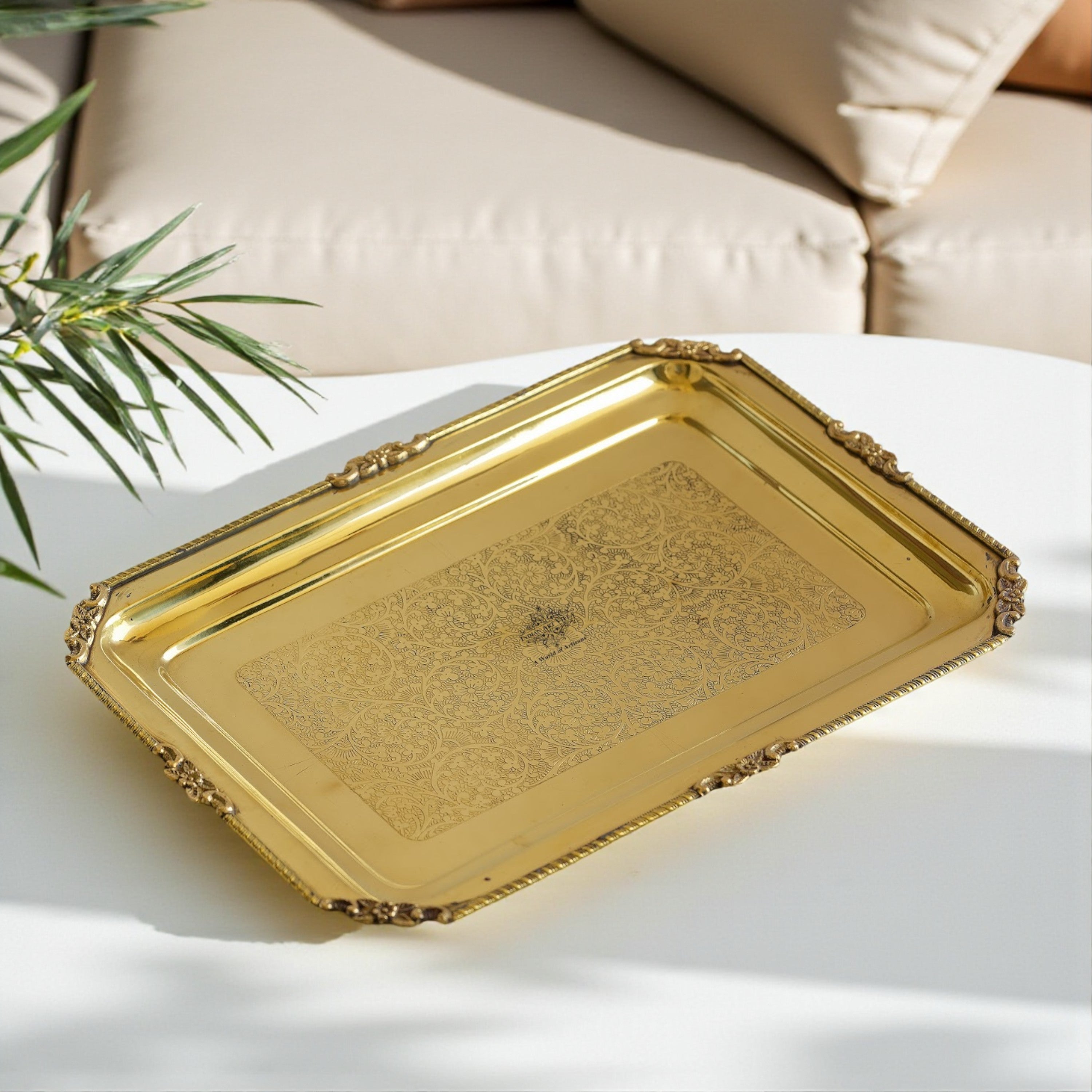 - Indian Art Villa Brass Embossed Rectangular Serving Beeding Tray, Gold, 35x25 Centimeter, 39x29 Centimeter, 42x31 Centimeter Make your home more lively and cheerful with this brilliant decor piece. These Cool, Hand Crafted Tray Make Excellent Gifts. Great for Weddings, Anniversary Gifts for Mom and Dad or Husband/Wife.