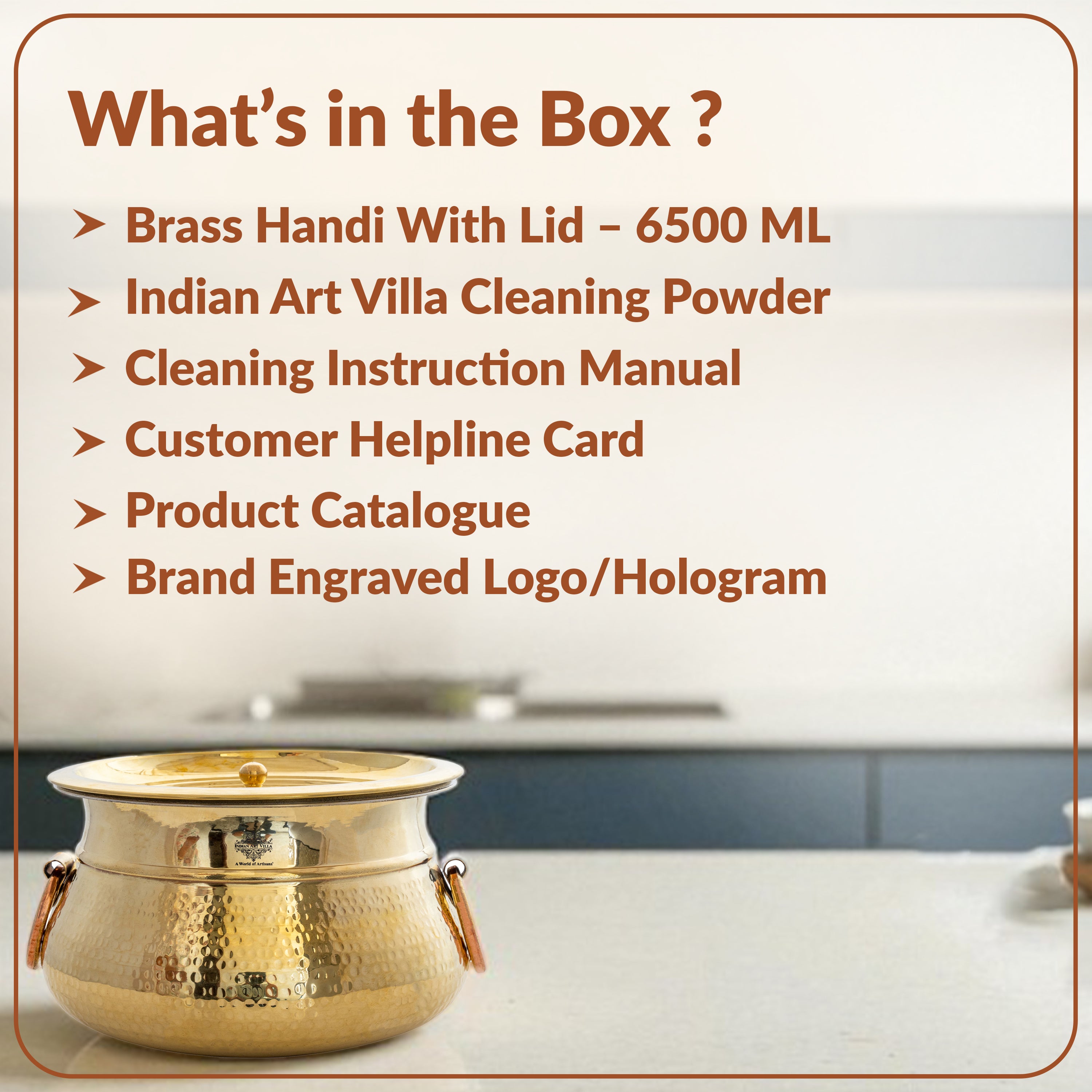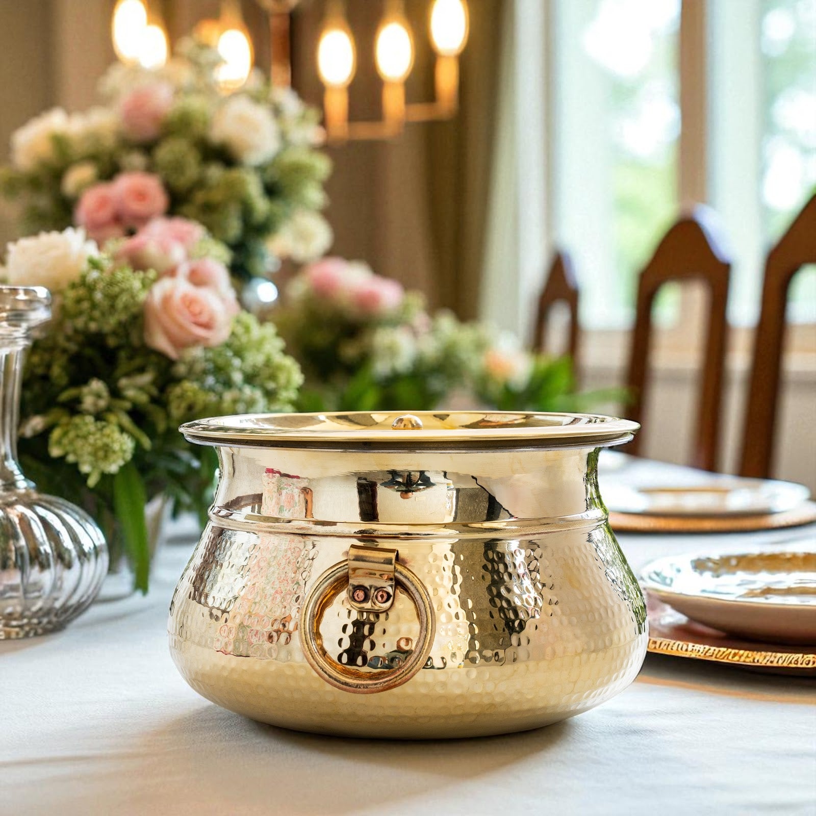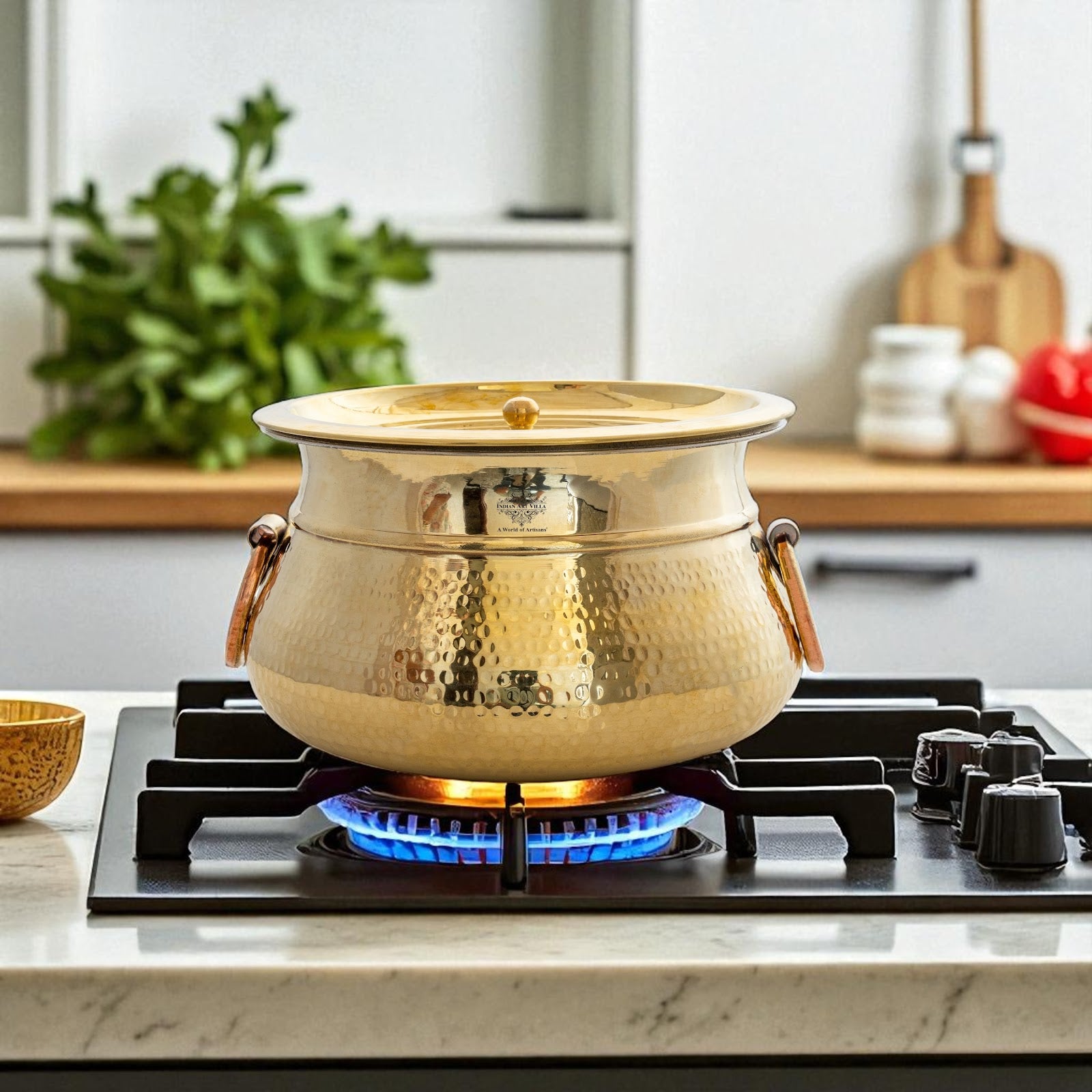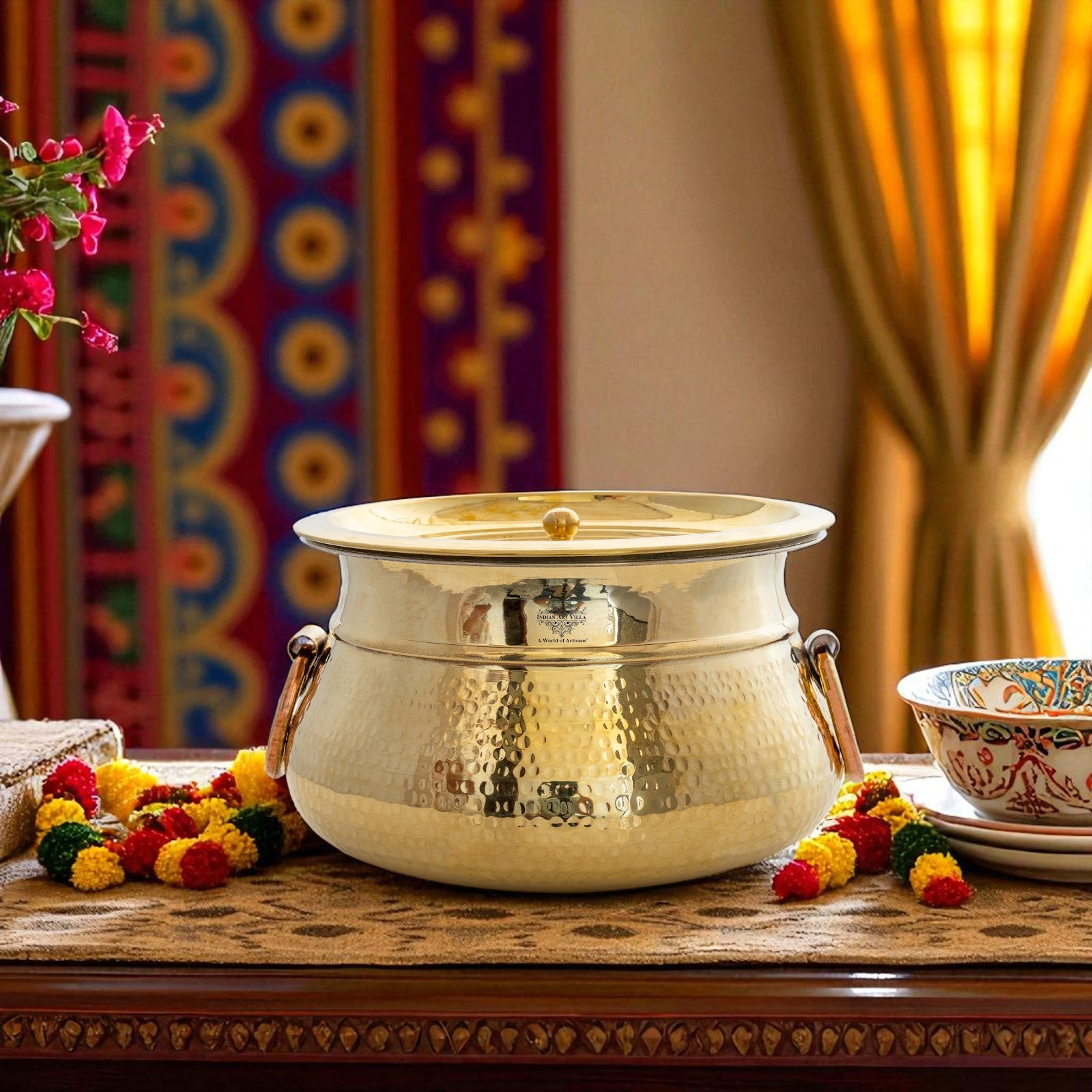 The Brass Hammered Lagan Handi by Indian Art Villa is a timeless piece of cookware, designed for both functionality and style. The hammered brass finish not only gives it an appealing vintage look but also ensures excellent heat retention, making it perfect for slow cooking. The tin lining inside the pot adds an extra layer of protection, preventing any reactions between the brass and your food. The handles are securely attached, providing a safe grip while moving the pot around. The included lid ensures that your food stays warm and flavorful for longer periods. Available in three different sizes – 3400ml, 4500ml, and 6500ml – this Lagan Handi can meet the needs of both small and large gatherings. With Indian Art Villa’s signature craftsmanship, this cookware adds elegance and tradition to your kitchen.