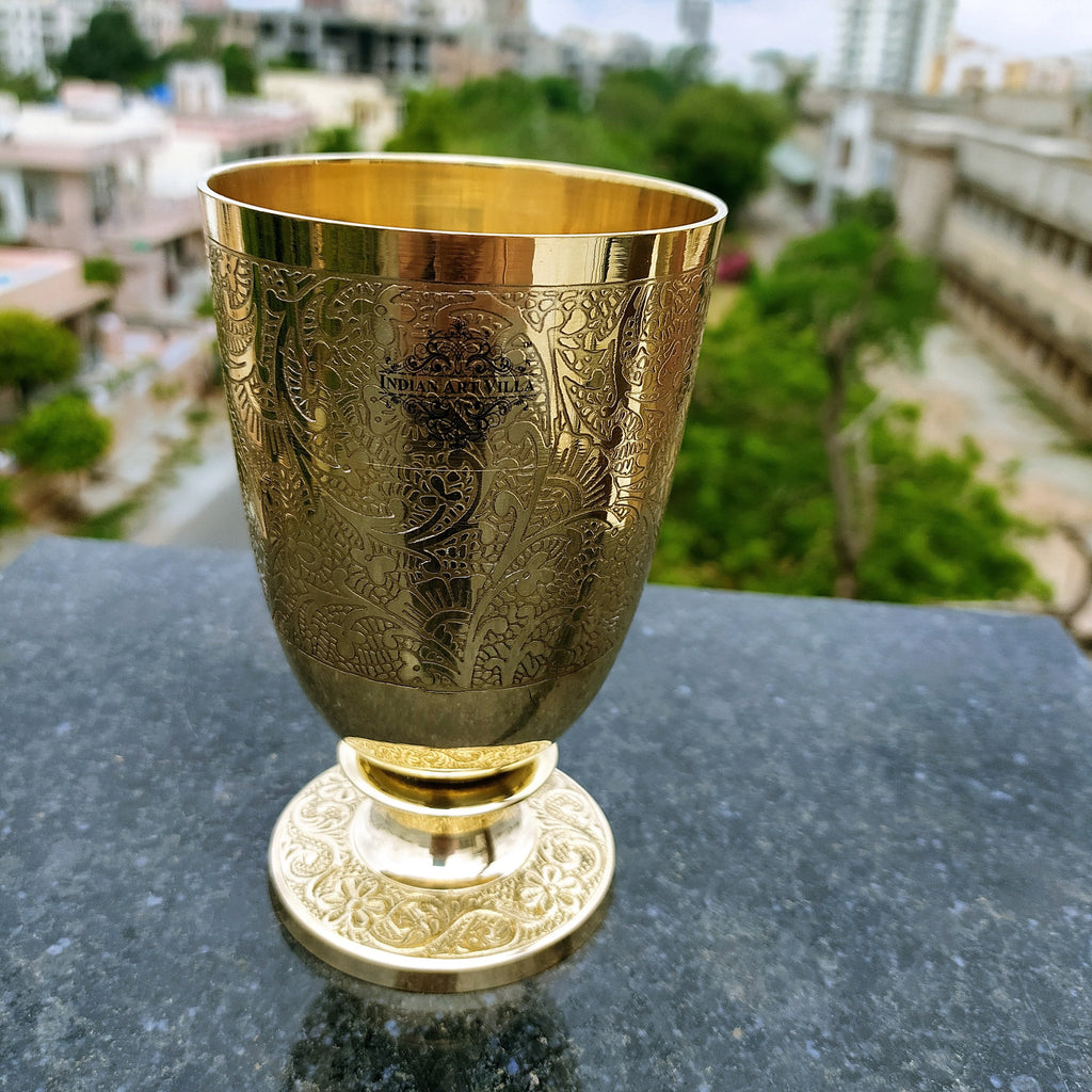 Introduce elegance and tradition to your drinkware collection with the Pure Brass Embossed Leaves Design Glass with Bottom Stand – 350 ML. This stunning piece of handcrafted art showcases the rich heritage of Indian metalwork, featuring finely embossed leaf patterns that bring a natural and graceful aesthetic to any table setting.