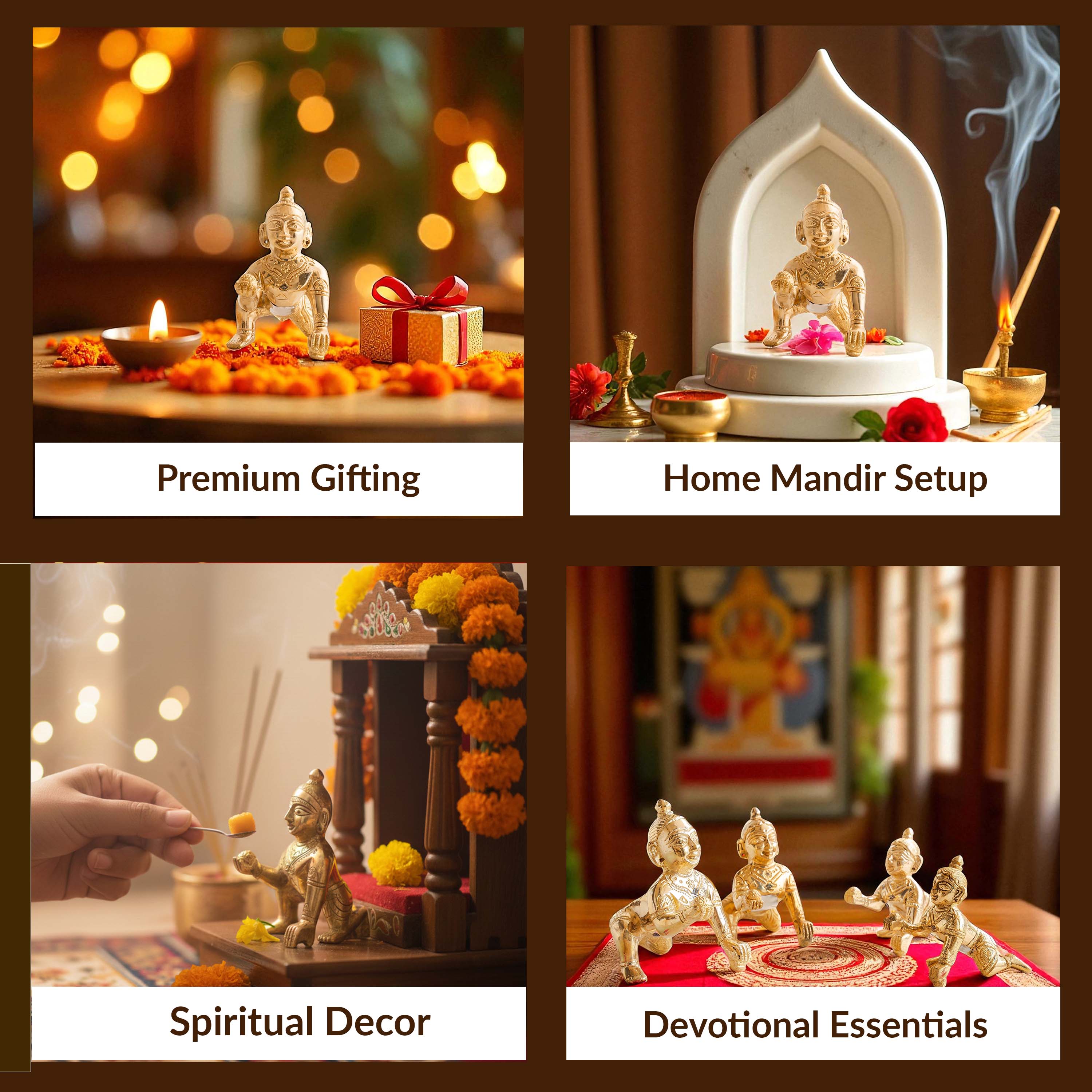 Handcrafted from pure brass with a lustrous gold polish, this Bal Gopal idol radiates prosperity and devotion. Each idol features intricate detailing in Krishna’s ornaments, expressions, and attire — making it perfect for Janmashtami, daily pooja rituals, temples, or spiritual gifting.