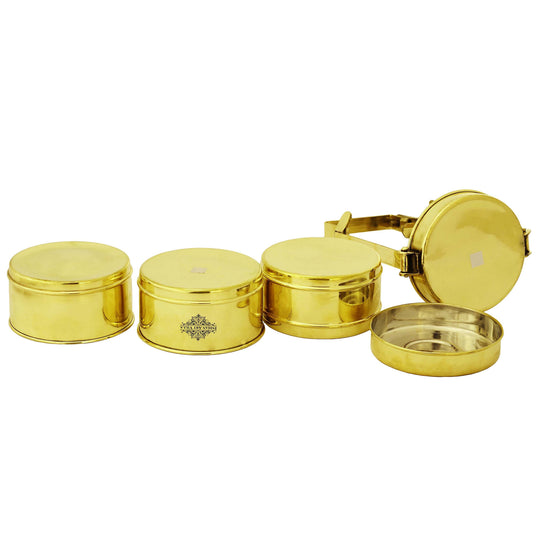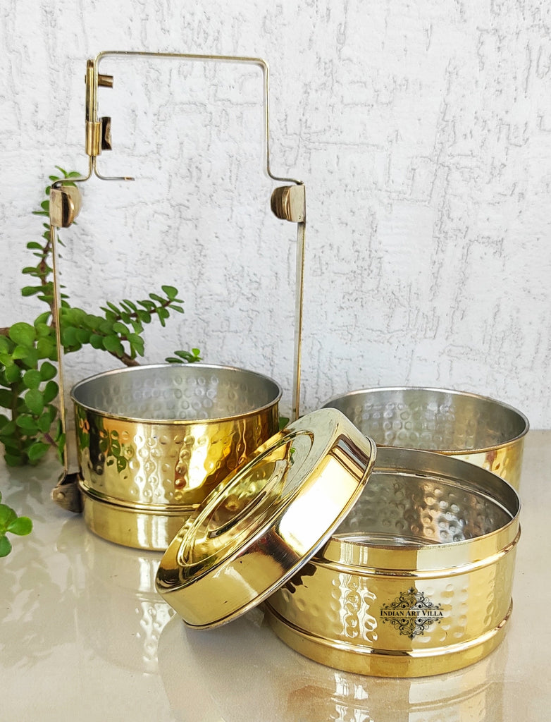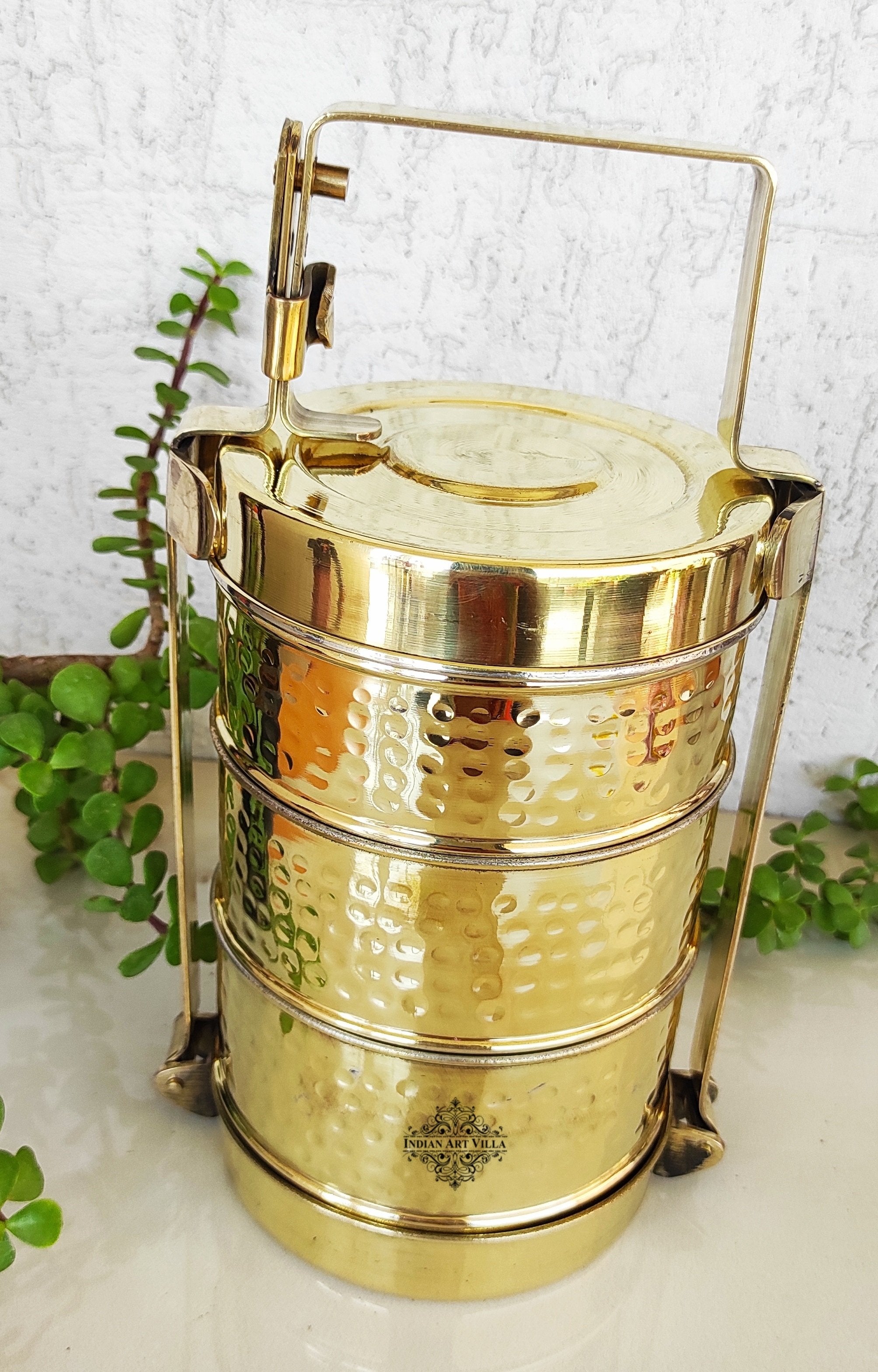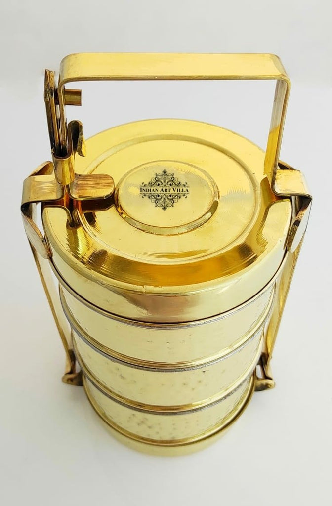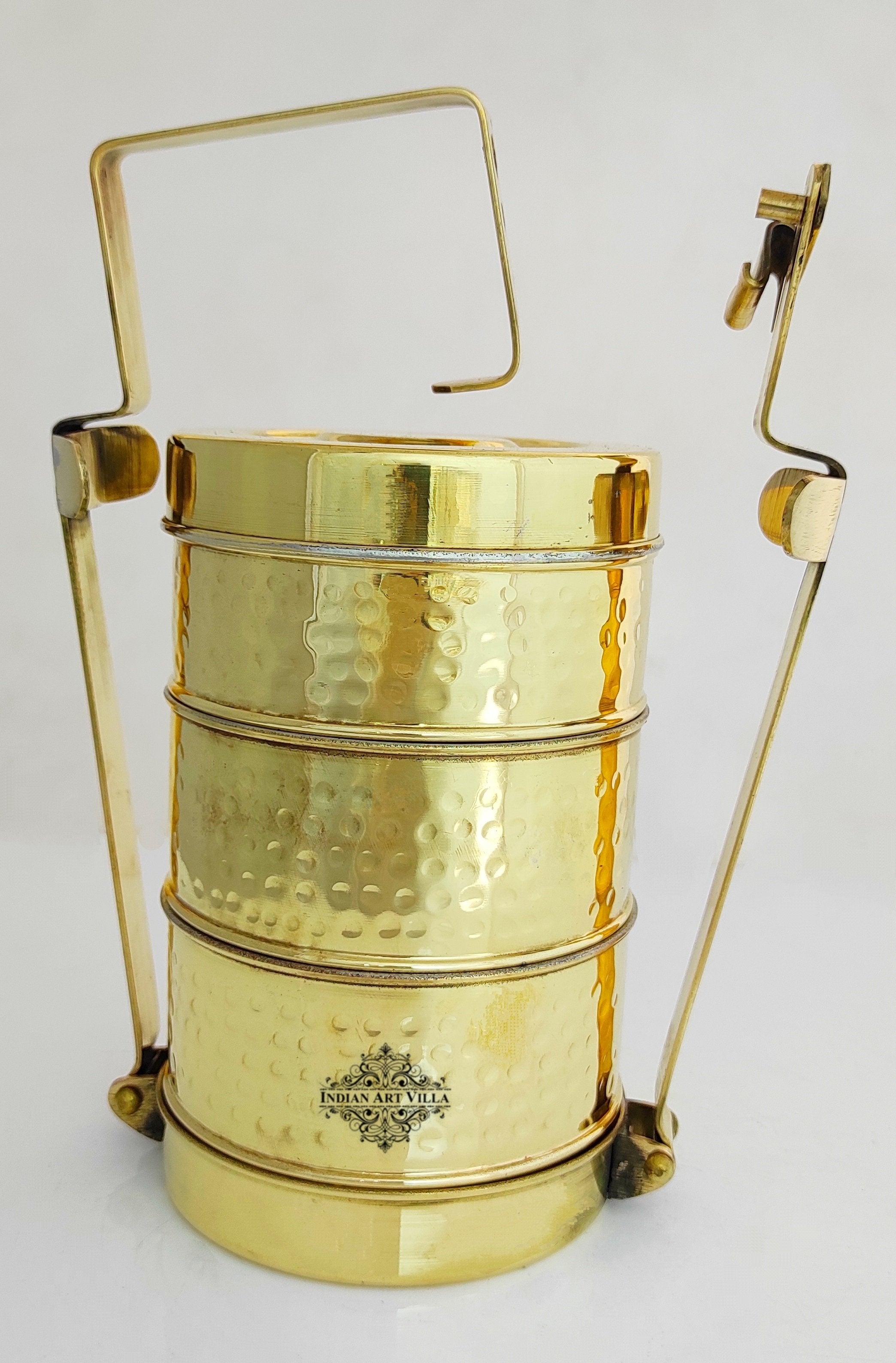 Indian Art Villa Presents Best Quality Brass Handmade Designer Handmade Lunch Box with 3 Compartments. We offer the best affordable prices & Free Shipping PAN India. We also offer Easy returns & exchanges. T&C Applied. Brass is a material that has been used and cherished by our ancestors and it possesses some miraculous health benefits which have been proved scientifically as well. Masala box is the common thread that connects our varied cuisines cutting across cultures and regions! The traditional use of brass spice containers is to preserve the rich anti-oxidant properties of the predominant spices used in our cooking. Anti-oxidants, as per modern research, helps fight cancer cells in our body. The traditional brass Tiffin or "Dabba" or Lunch Box is often a metal version of the lunchboxes. This larger dabbas is having 3 compartments with 800 ml capacity each and can be used to carry meals for a small family on the go or send love-cooked meals to a close one during times of sickness and distress.