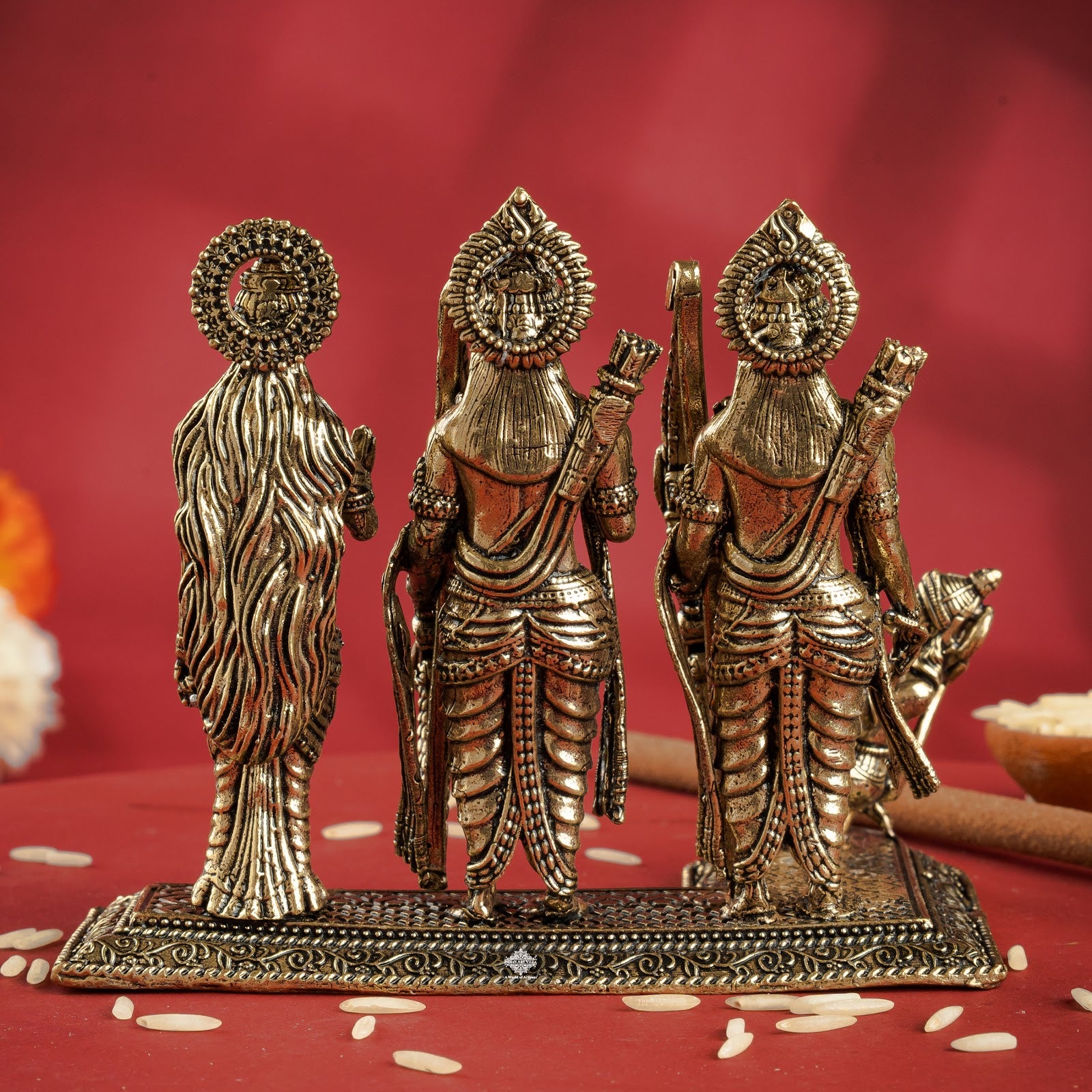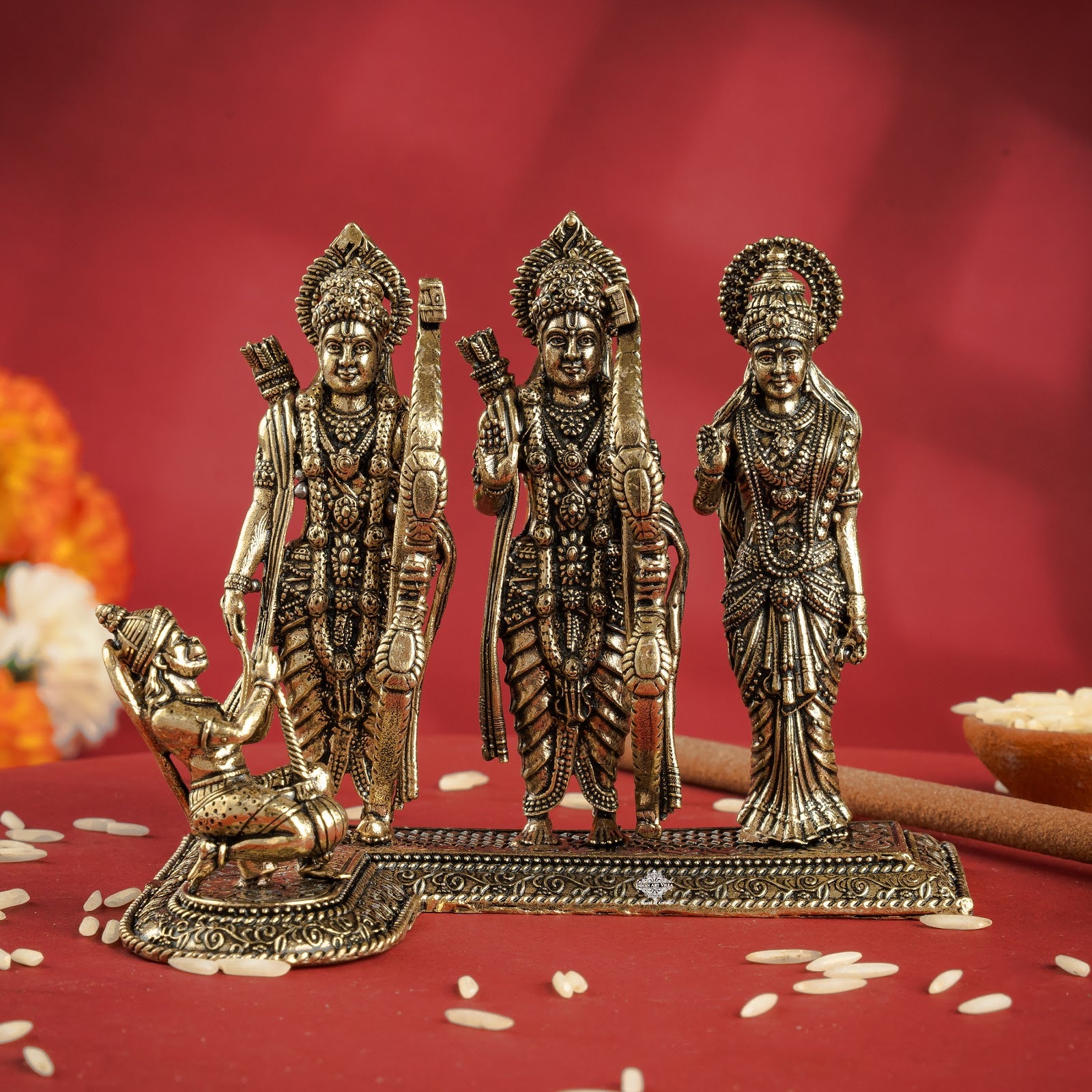 Product Details: Indian Art Villa Brass Ram Darbar Idol features Ram Ji, Sita Ji, Laxman Ji, and Hanuman Ji in divine form, crafted with intricate detailing and hollow base design.