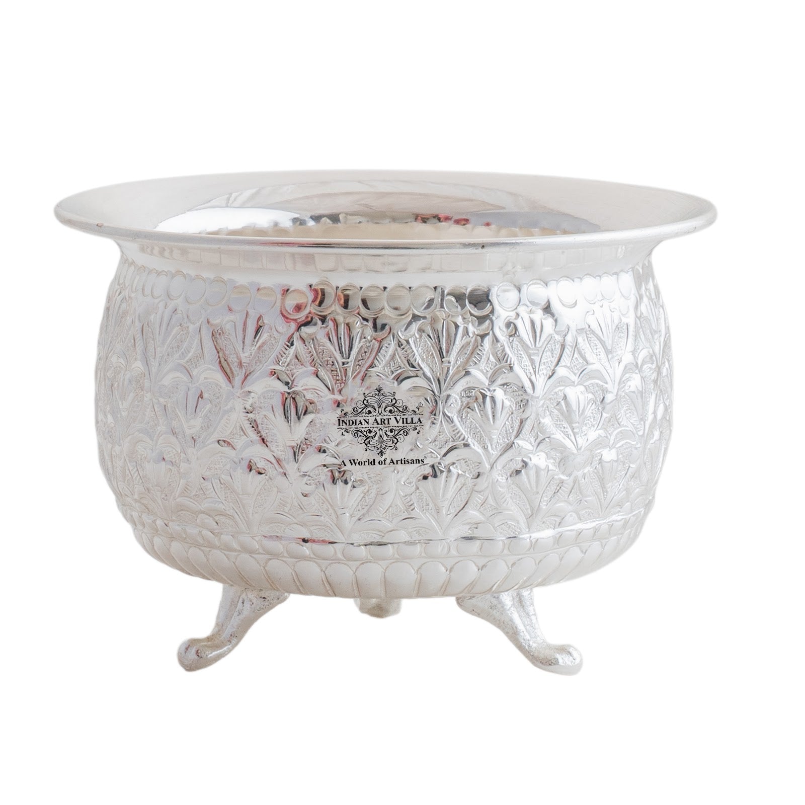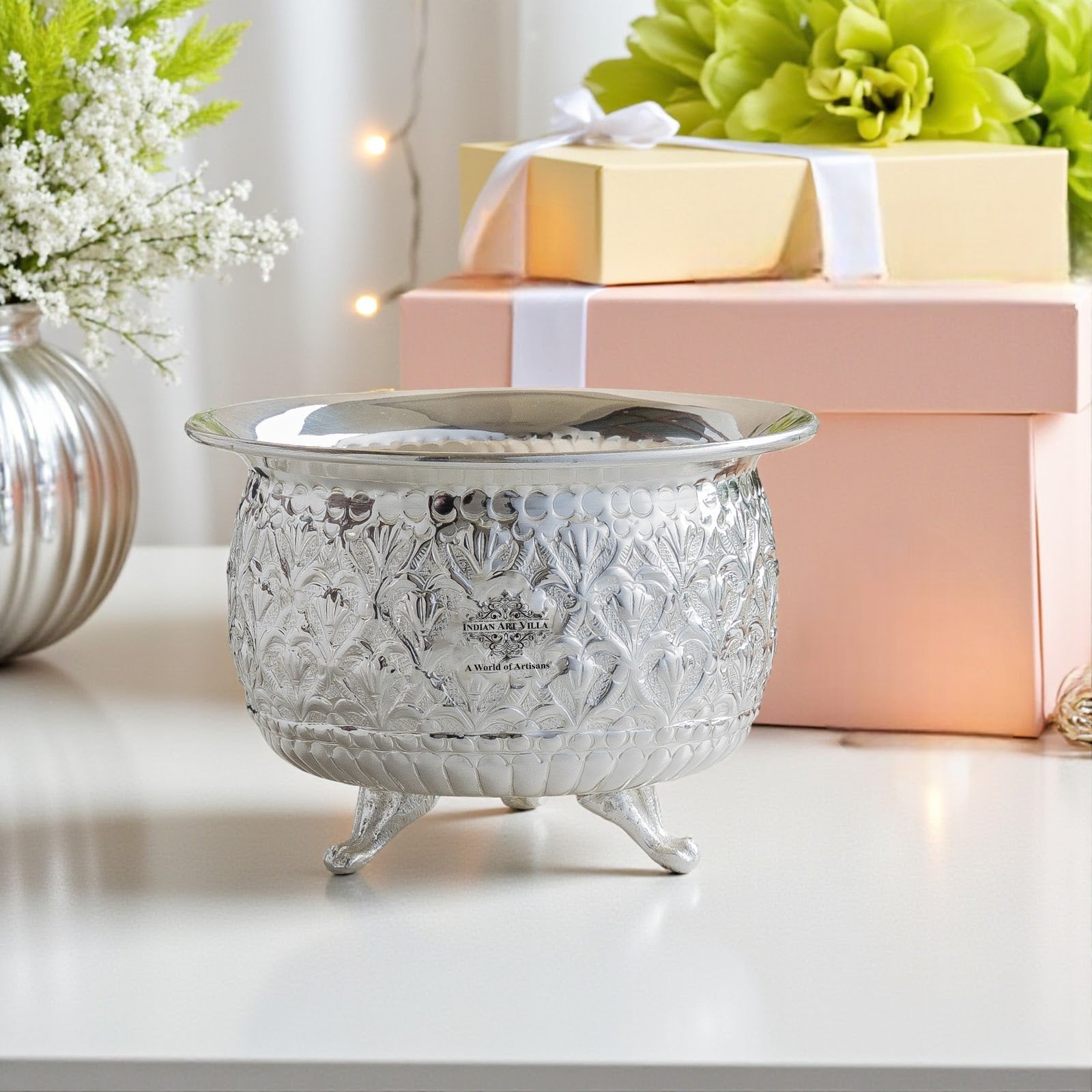 Add a touch of regal elegance to your space with the Indian Art Villa Brass Silver-Plated Designer Bowl. Expertly handcrafted by skilled artisans, this bowl combines traditional Indian artistry with modern aesthetics. The detailed embossed floral design reflects timeless craftsmanship, while the three decorative legs provide a stable base and an elevated look.