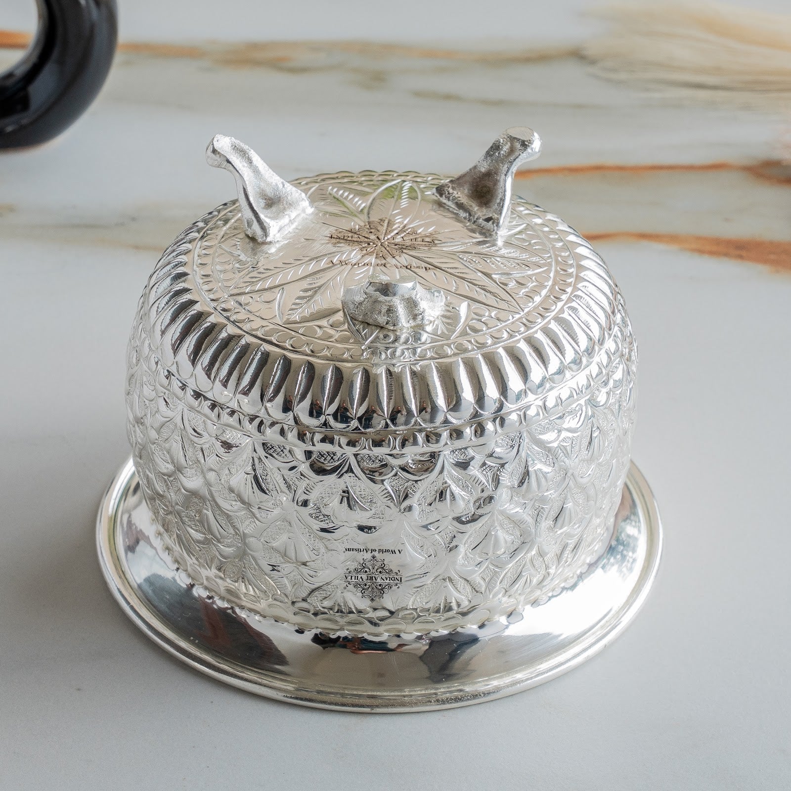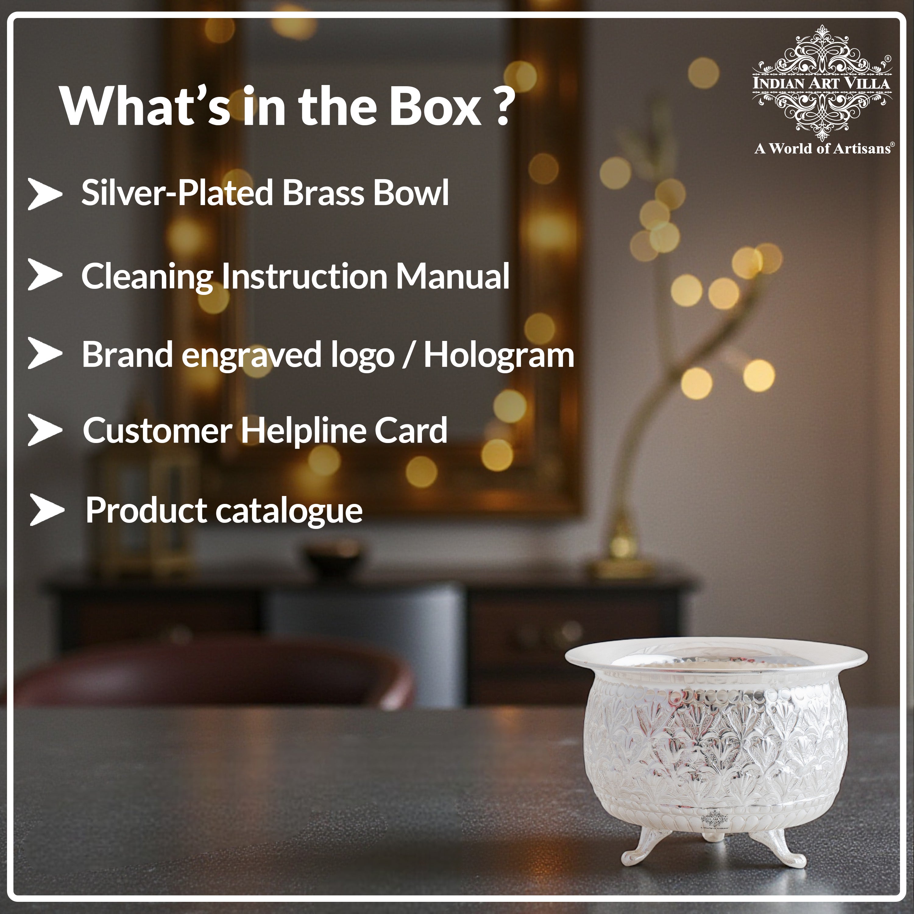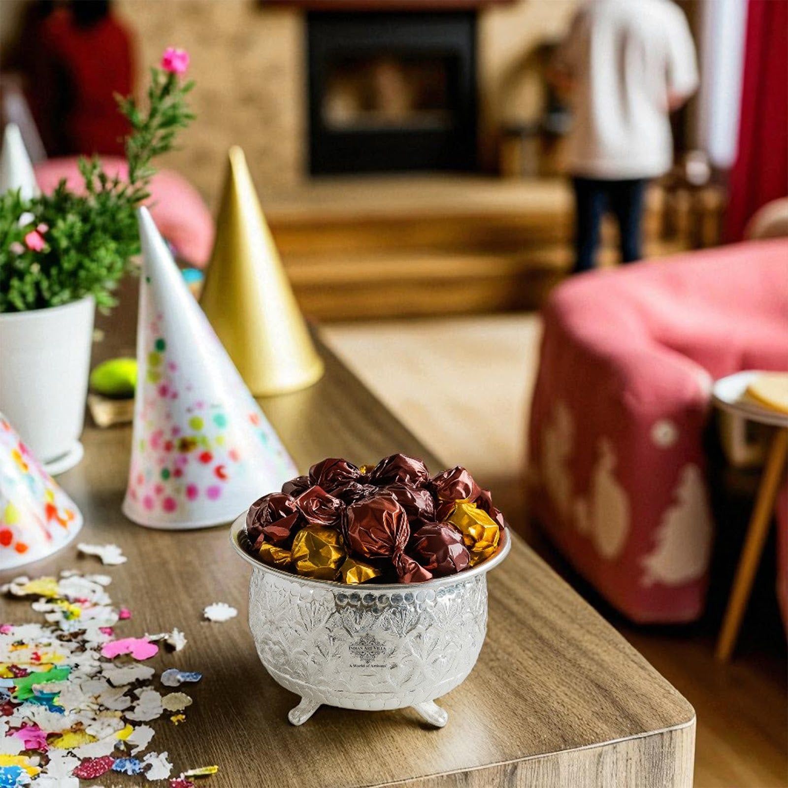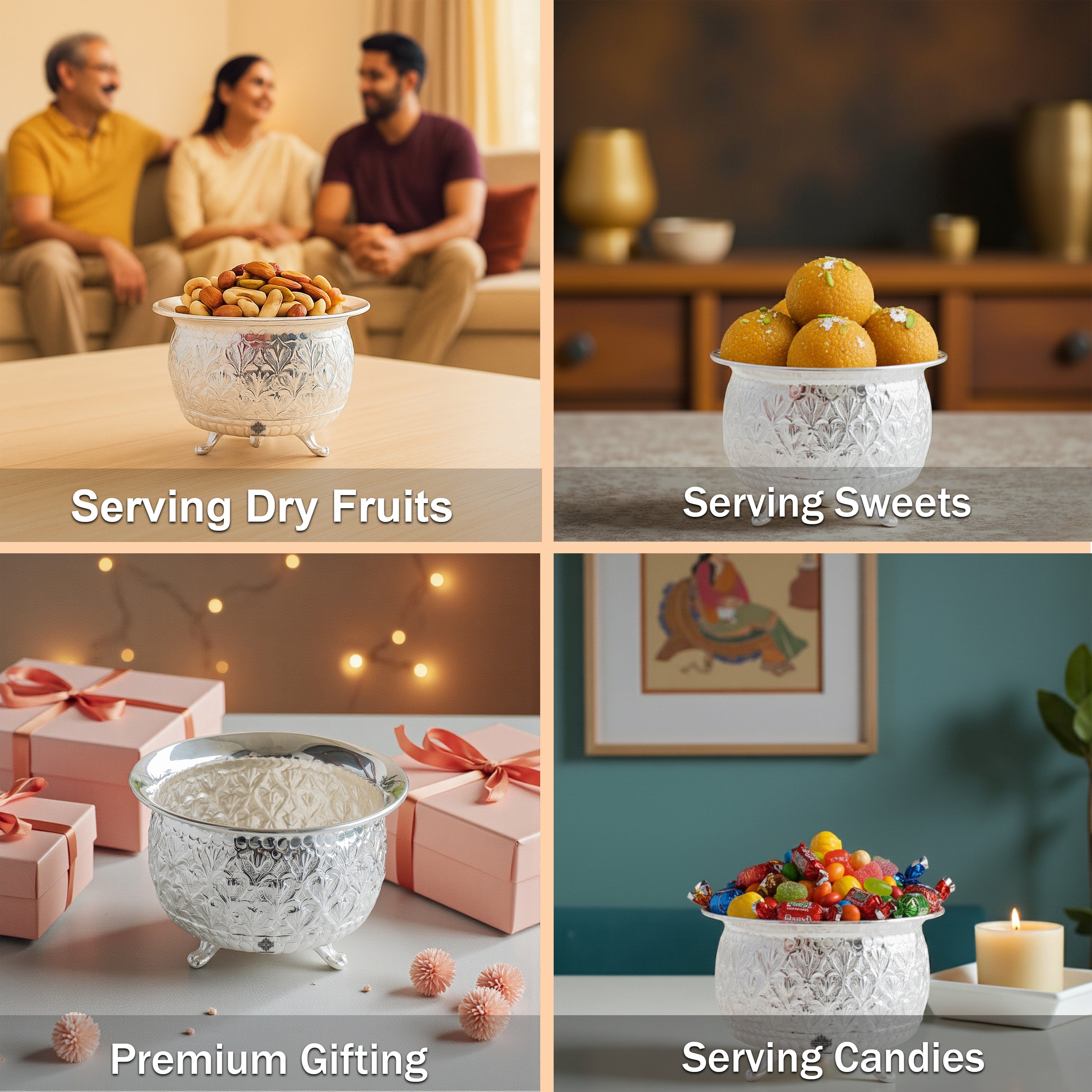 With its silver-plated finish, this bowl shines beautifully under any light, making it an ideal addition to dining tables, pooja rooms, or living room décor. Measuring 4.3 inches in width, it is the perfect size for serving dry fruits, nuts, or sweets during festive occasions. You can also use it as a decorative accent to enhance the charm of your home interiors.