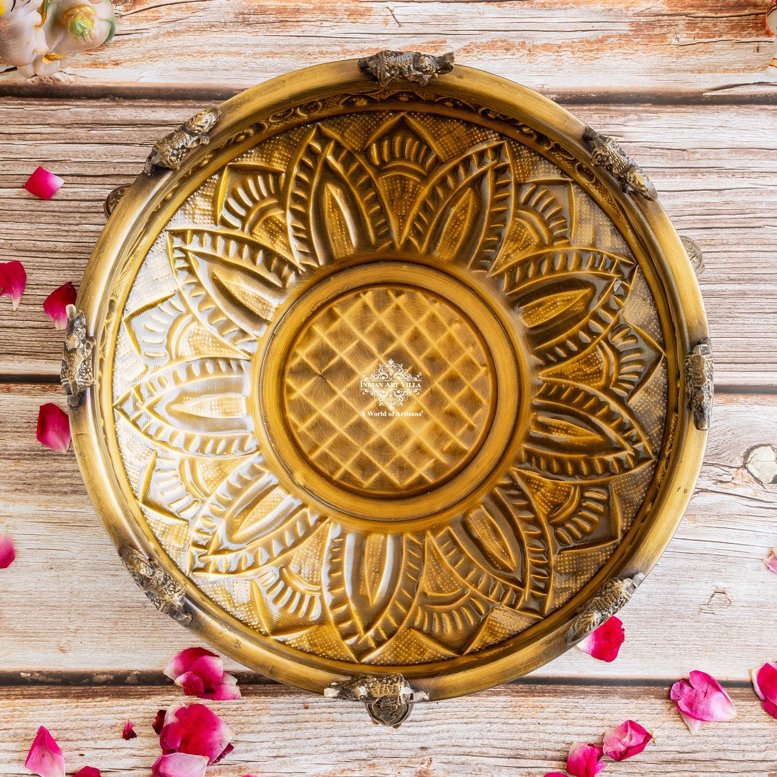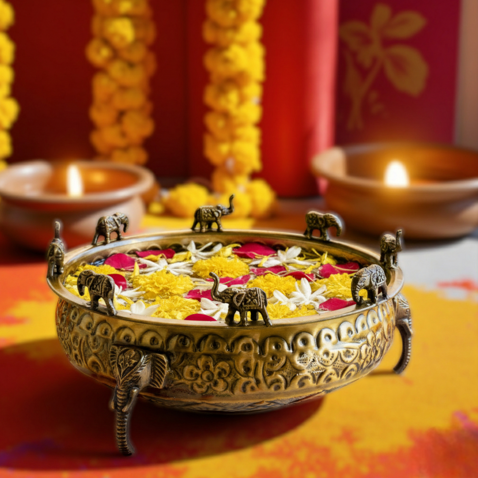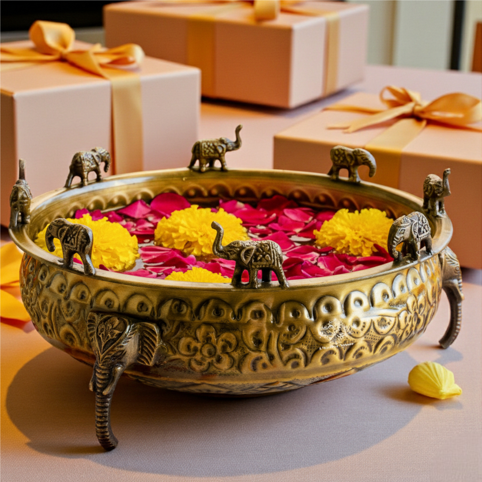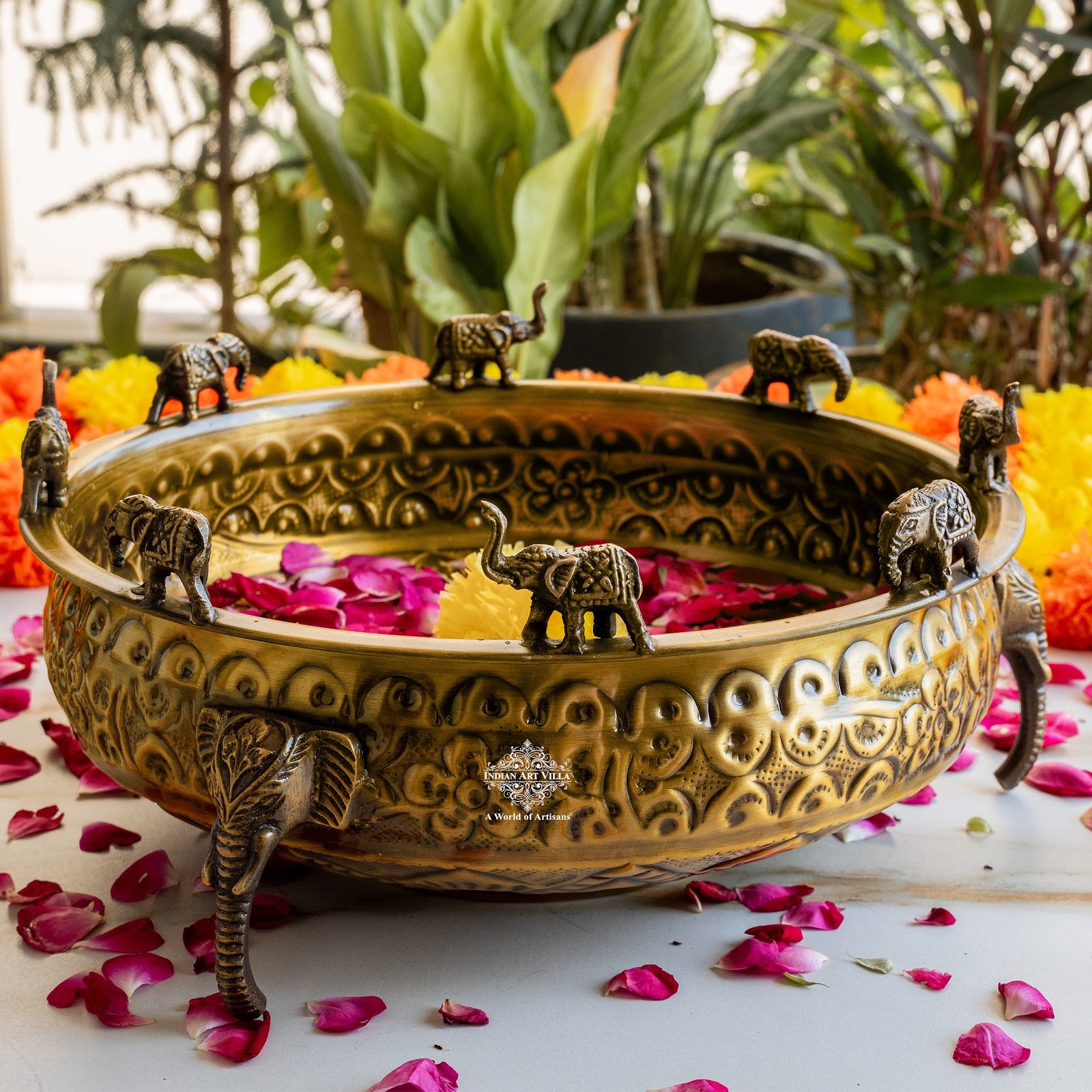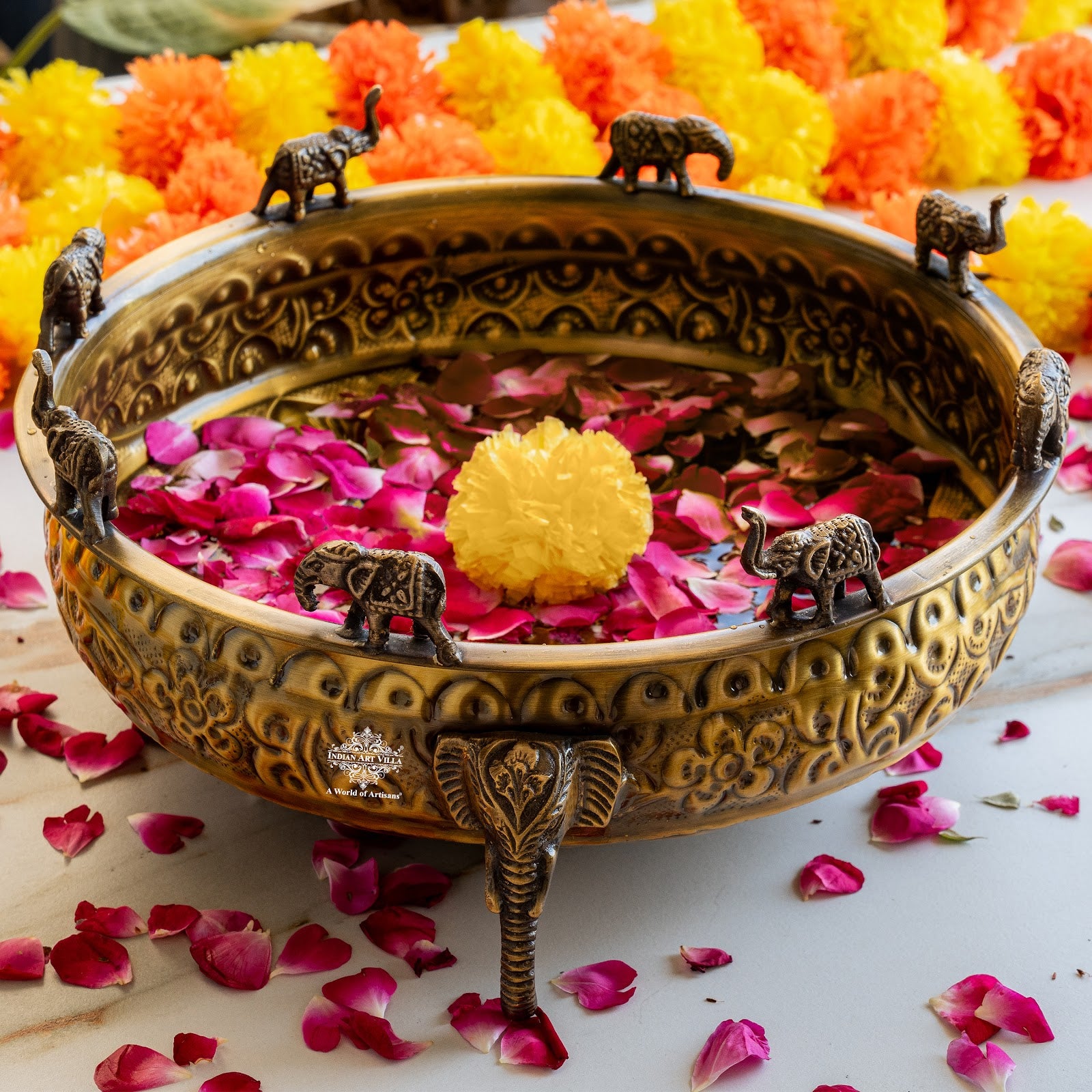 Bring home a touch of traditional elegance with this beautifully handcrafted Brass Antique Embossed Elephant Urli. Made from high-quality solid brass, this urli features intricate floral embossing and charming elephant figurines around the rim, symbolizing prosperity and good fortune. Its antique finish adds a regal, heritage appeal, making it perfect for festive décor, pooja setups, or everyday home styling. Simply add water, fresh flowers, rose petals, or floating candles to create a serene and welcoming ambience.