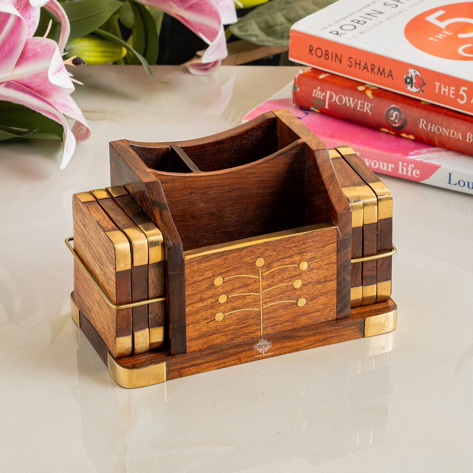 This set includes six sturdy wooden coasters arranged neatly on a beautifully crafted stand, allowing easy access and organized storage. The natural finish of the wood, complemented by gleaming brass borders, brings a classic, sophisticated feel to your coffee table, dining area, bar counter, or office desk. Each coaster helps safeguard your surfaces against water rings, heat marks, and scratches, making them ideal for both hot and cold beverages.