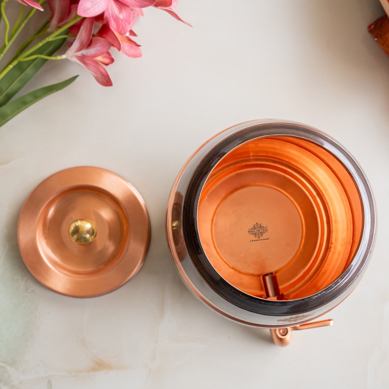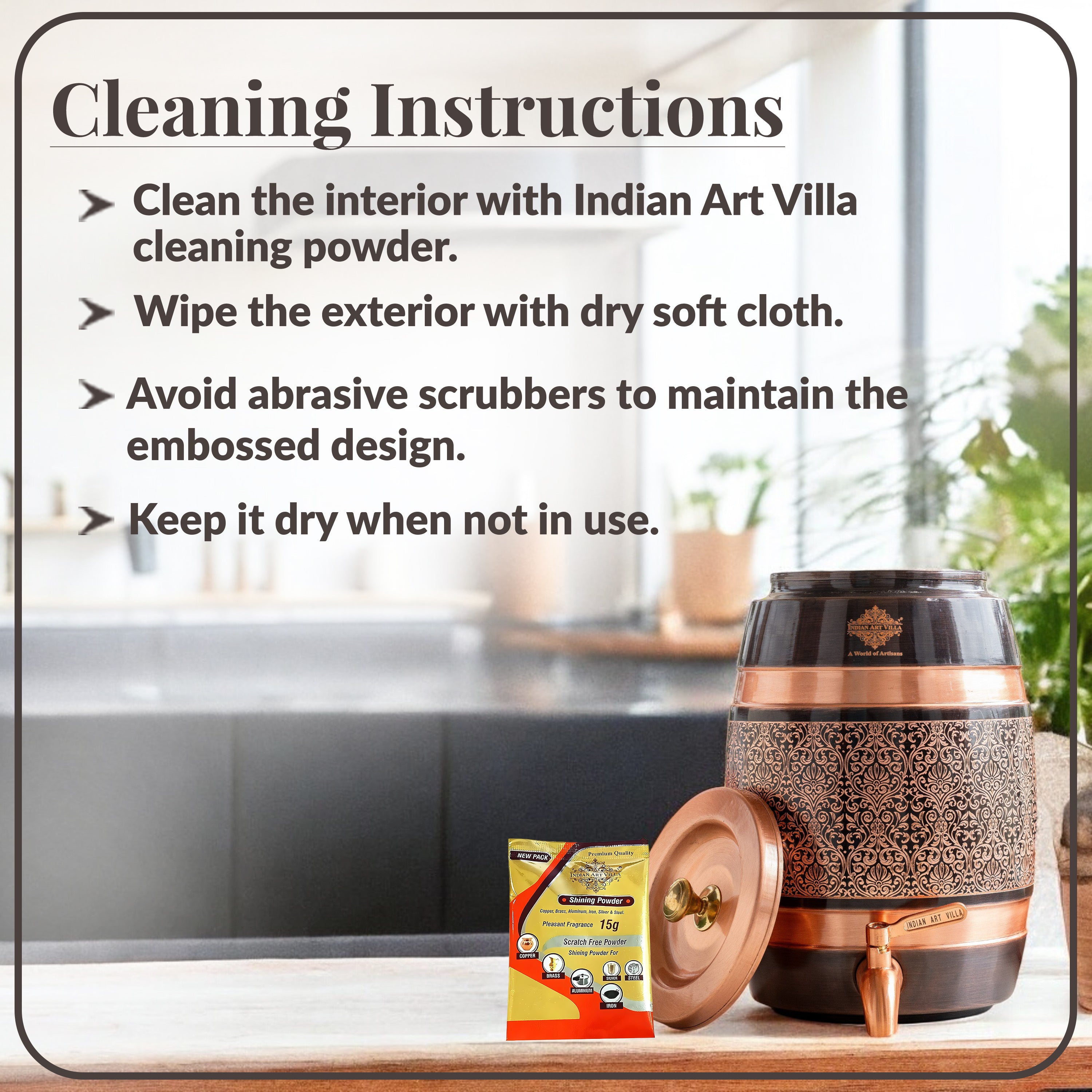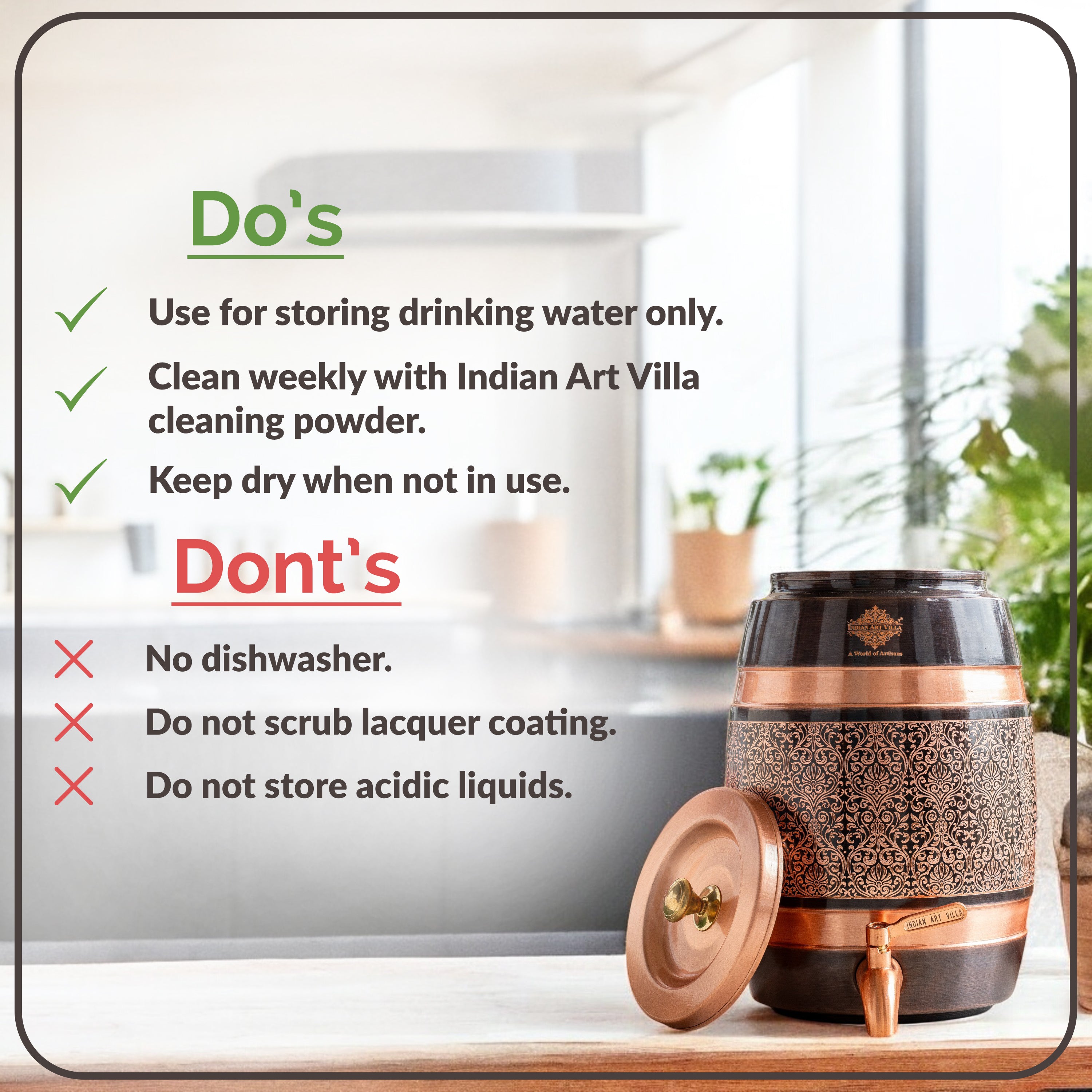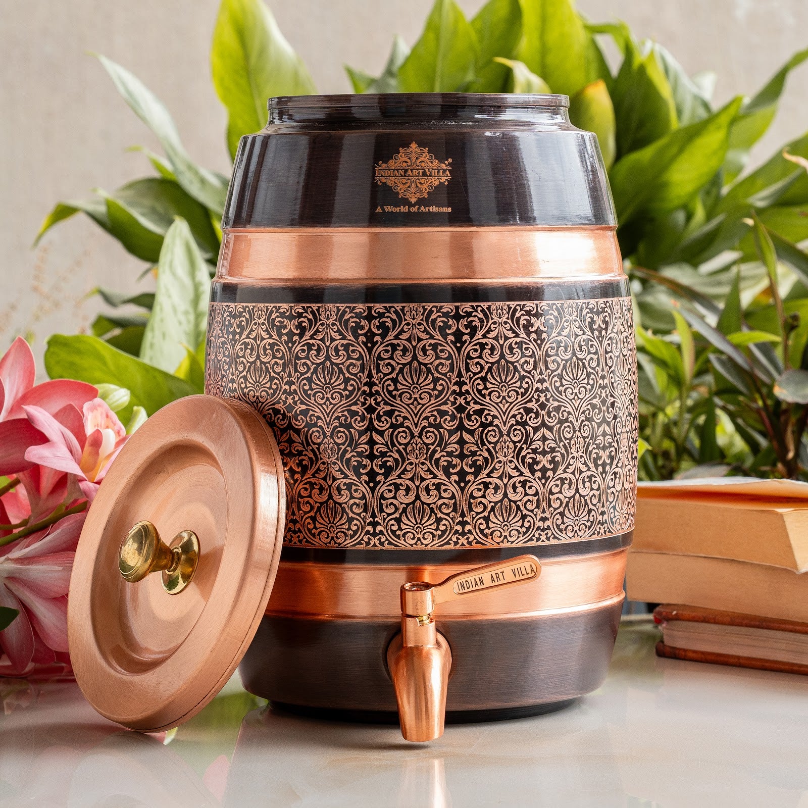 IndianArtVilla Copper Water Pot with Embossed Design with Black printed Crafted from high-quality copper, this water pot is not only visually stunning but also offers the many health benefits associated with copper. The use of pure copper ensures that the water stored within the pot maintains its purity and stays cool. The intricate embossed design on the pot adds a touch of elegance and a sense of tradition. The black printed design complements the copper base beautifully, creating a striking contrast. Indian Art Villa Copper Water Pot with Embossed Design with Black printed With a generous 5-liter capacity, this pot is perfect for serving water to your family and guests. It ensures you always have a refreshing supply of water on hand. The pot stands at a height of 27.69 cm and has a width of 19.05 cm, making it a perfect fit for your kitchen or dining area. It's both practical and aesthetically pleasing. In addition to being a water pot, this piece can also serve as an exquisite decorative element in your home. It's versatile enough to blend seamlessly into various interior styles. Copper is known to have antimicrobial properties and can positively impact your health. It aids digestion, promotes weight loss, and helps maintain overall well-being.