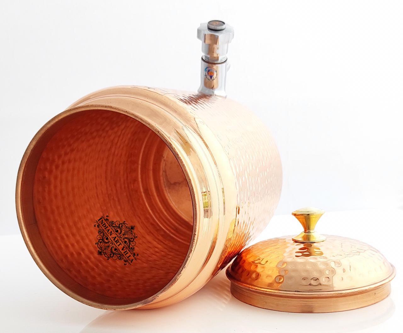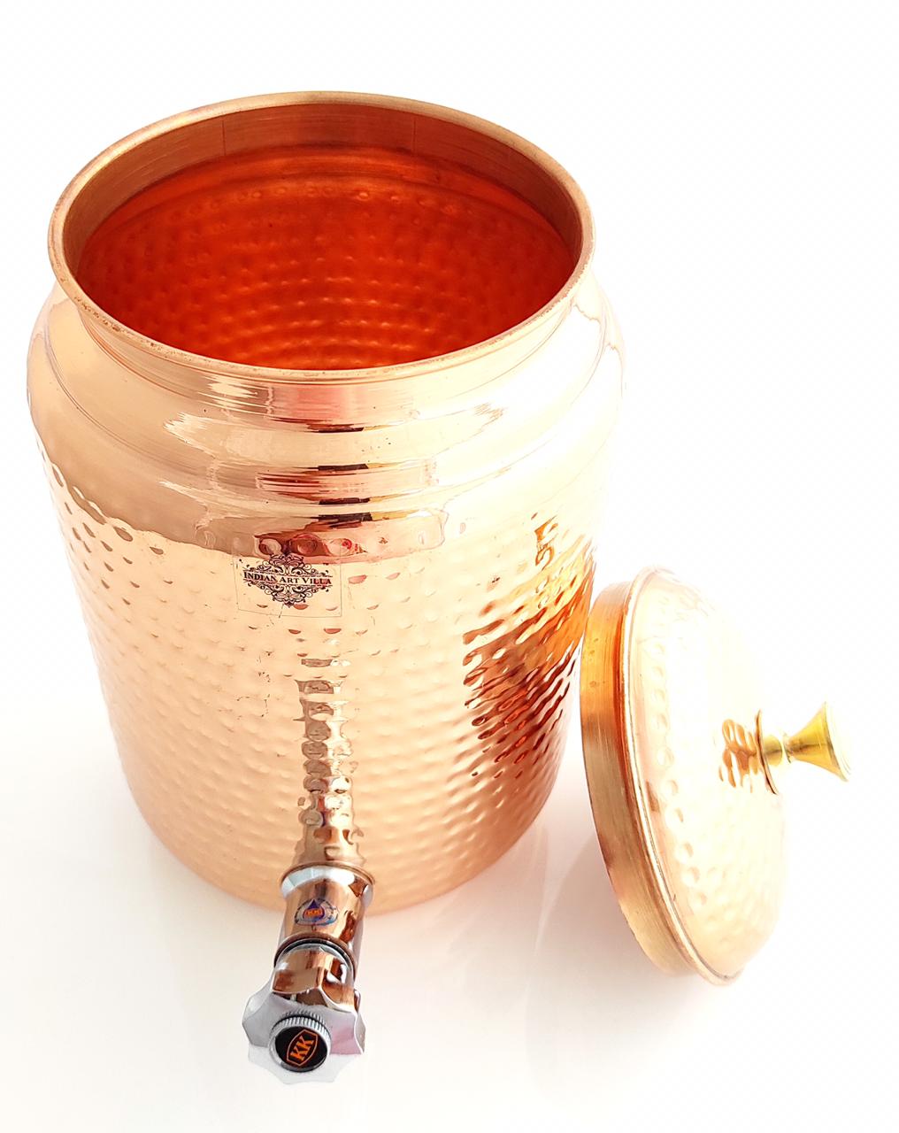 INDIAN ART VILLA Brings Pure Copper Hammered Design Water Pot With Stand. We offer the best affordable prices. We also offer Easy returns & exchanges. T&C Applied. Water stored overnight in copper utensils has innumerable health benefits. It has anti-bacterial properties that help purify water & remove toxins. It aids digestion & weight loss. It protects us from diseases like arthritis, anemia, blood pressure, hyperthyroid, cancer and relieves us of joint pains. It has immense skin benefits too. Copper is an Antioxidant and anti-carcinogenic that prevents cell damage and slows aging. Copper is the primary element to produces melanin (pigmentation of eyes, hair, and skin) in the human body. One should make it a habit of drinking water stored in copper utensils so as to keep themselves healthy. Storing water in copper Water Pot is eco-friendly and hygienic. It maintains the temperature of water Longer than usual.Indian Art Villa Copper items have antique designs. The item is highly durable, elegant, and a wonderful addition to your Home Decor.