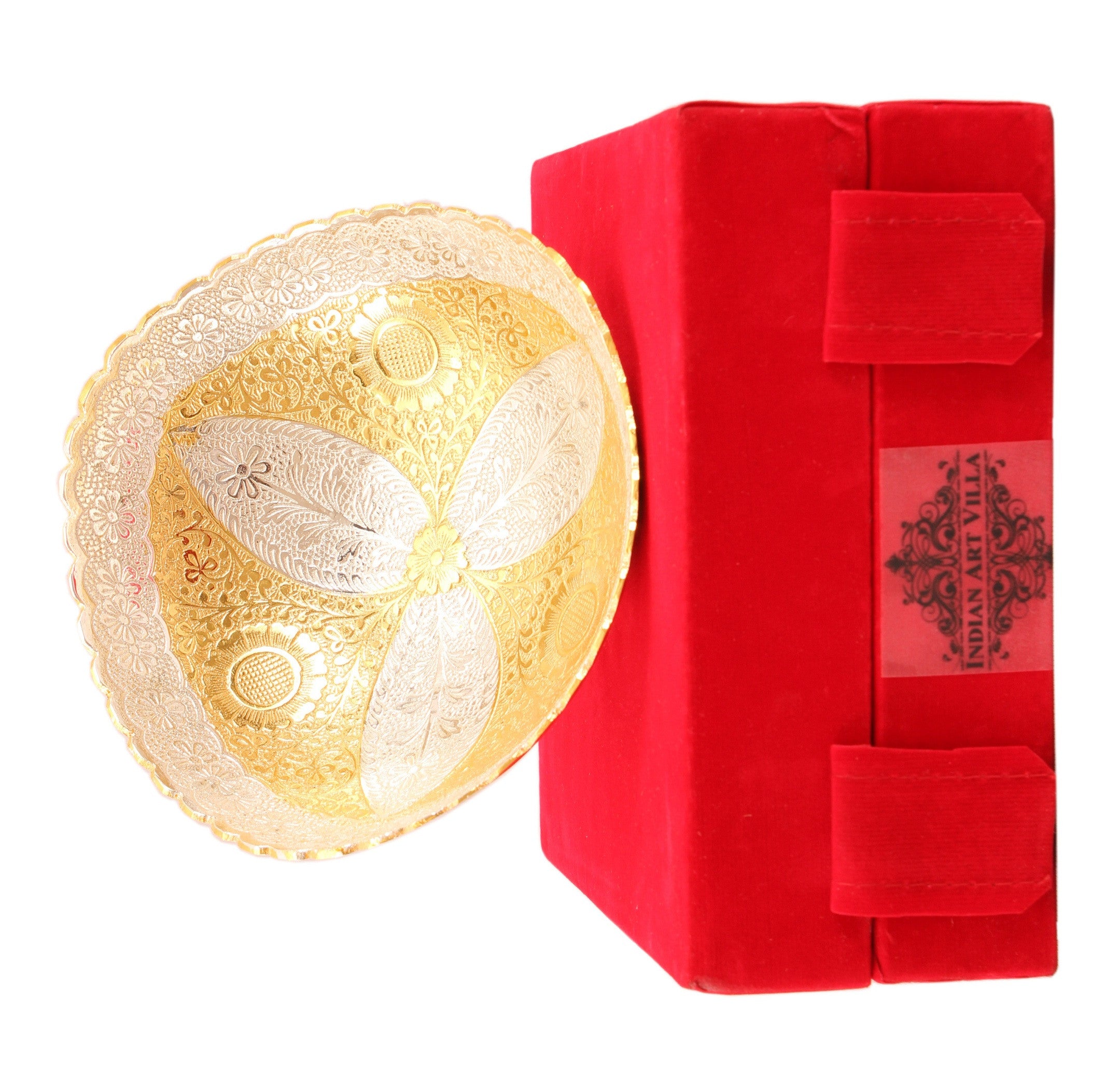 Indian Art Villa Pure Silver Plated Gold Polished Leaf Design Oval Shape Bow is a stunning piece of tableware that exudes elegance and sophistication. Crafted with meticulous attention to detail, this exquisite bowl showcases an intricate leaf design that adds a touch of natural beauty to any dining setting. The oval shape enhances its charm, making it a standout centerpiece on any table. Silver plating with a lustrous gold polish elevates the bowl's aesthetic appeal, exuding luxury and opulence. It serves as a versatile decorative item, enhancing the ambiance of both homes and hotels with its timeless design. This bow is not only a decorative showpiece but also a thoughtful gift option for special occasions, celebrating moments with a touch of splendor. Embrace the craftsmanship and beauty of Indian Art Villa with this silver-plated bowl that epitomizes grace and refinement in tableware.