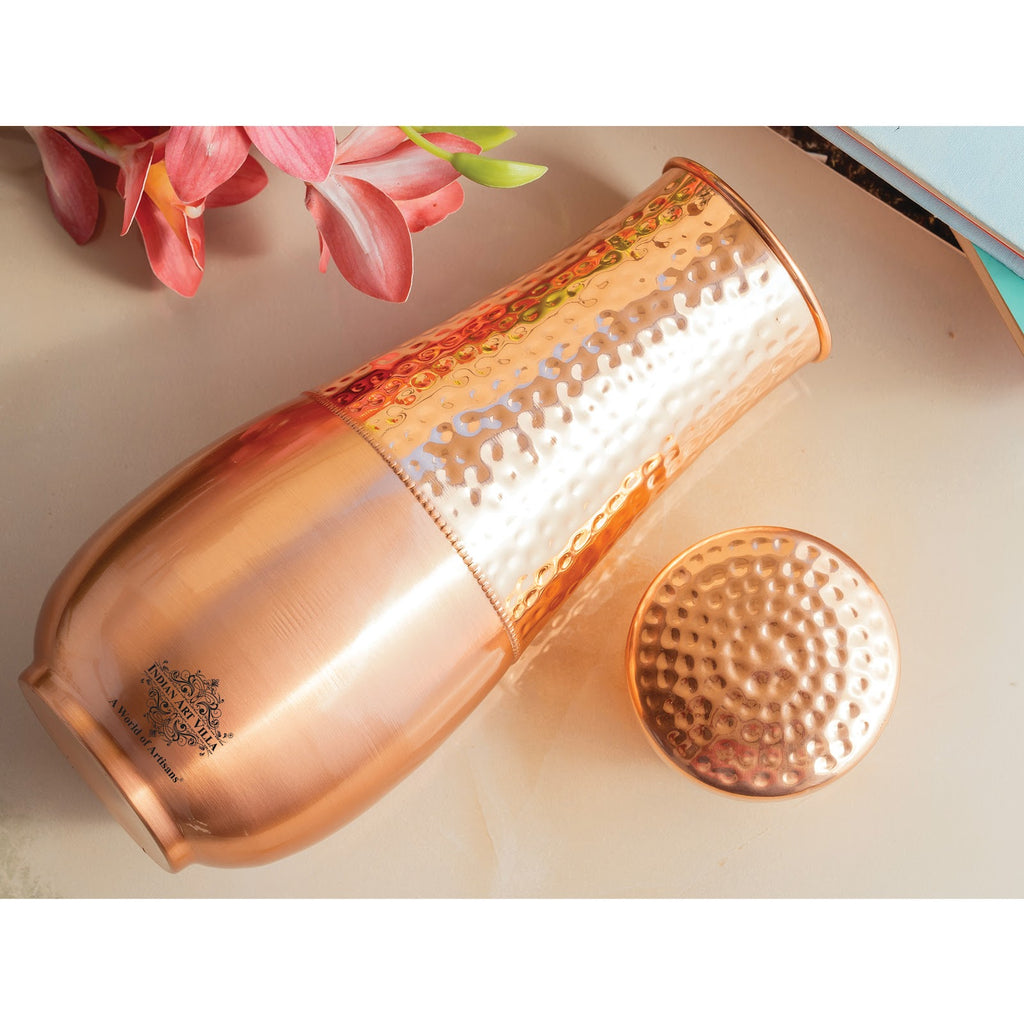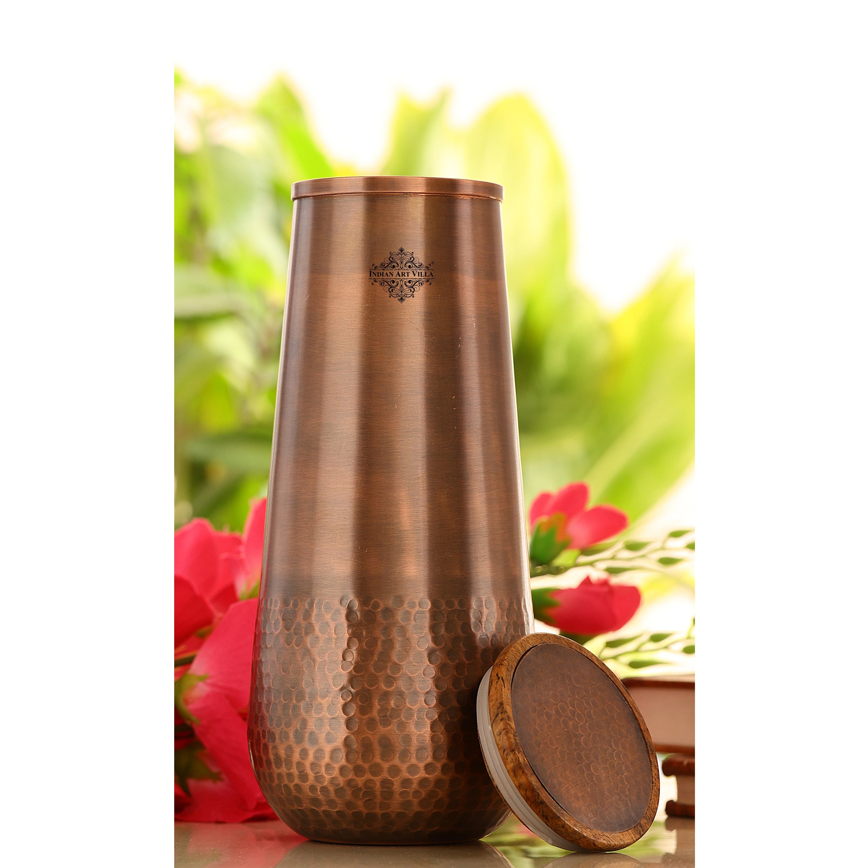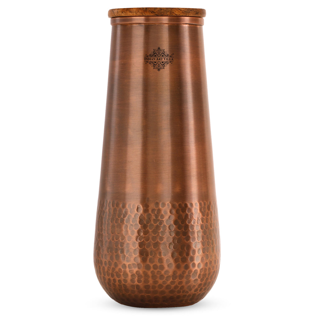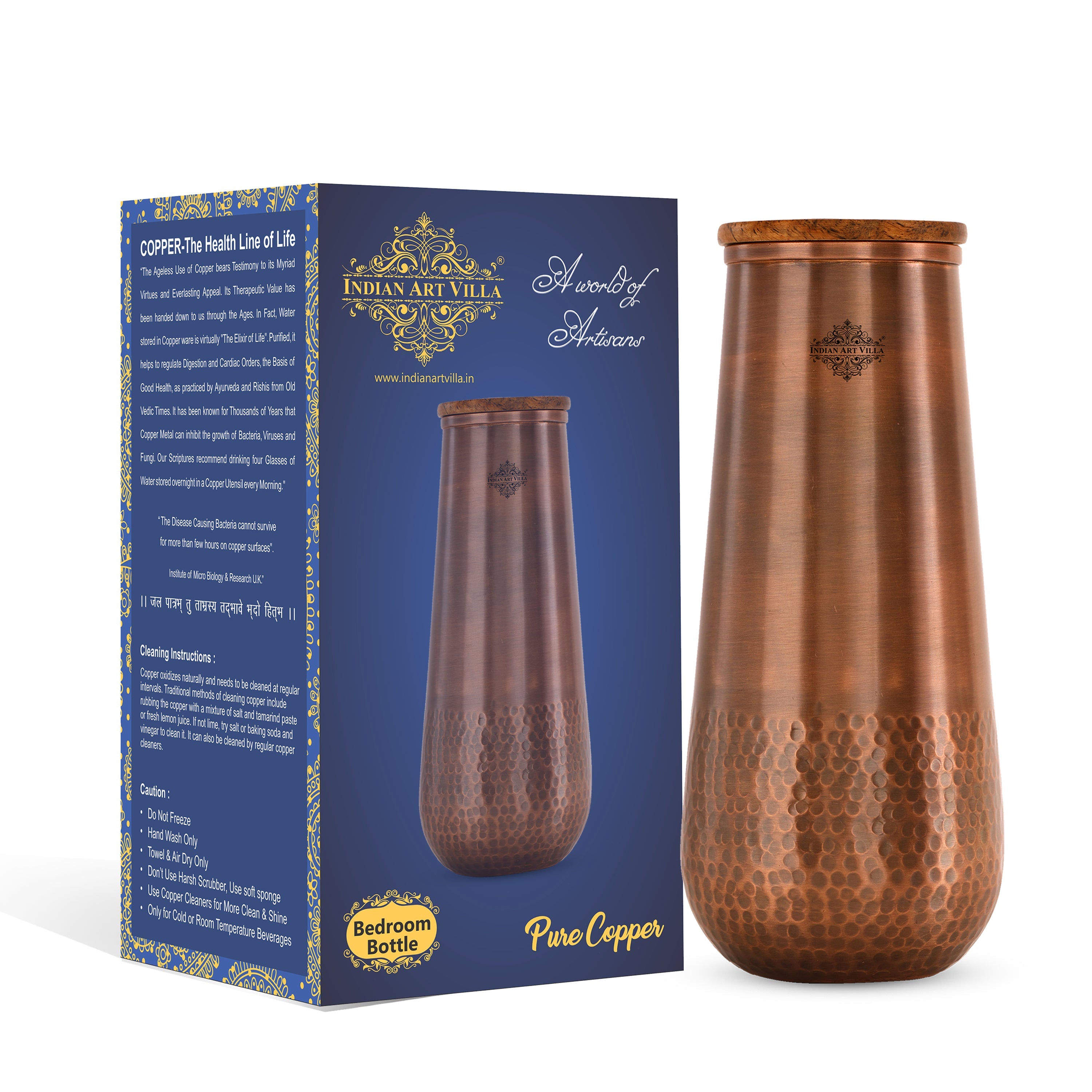 The Indian Art Villa Copper Bedroom water Bottle with Hemmered design is a beautifully crafted water bottle that is perfect for use in the bedroom or any other living space. It has a volume of 1300 ml, making it ideal for holding enough water for an entire day.The bottle is made of high-quality copper, which is known for its health benefits. Copper has antimicrobial properties that can help kill harmful bacteria and viruses. It also helps to improve digestion, boost the immune system, and promote healthy skin. The lacquer coating on the exterior of the bottle protects the copper from tarnishing and keeps it looking shiny and new for years. The wooden lid adds a touch of elegance to the bottle, and it also helps to keep the water inside fresh and clean. The lid fits snugly on the bottle, preventing any spills or leaks. The bottle's design is sleek and stylish, making it a perfect addition to any bedroom or living space.The Indian Art Villa Copper lacquer Bedroom water Bottle with wooden lid is a high-quality, beautifully designed water bottle that is both functional and aesthetically pleasing. Its large volume and health benefits make it an ideal choice for those looking for a durable and stylish water bottle.