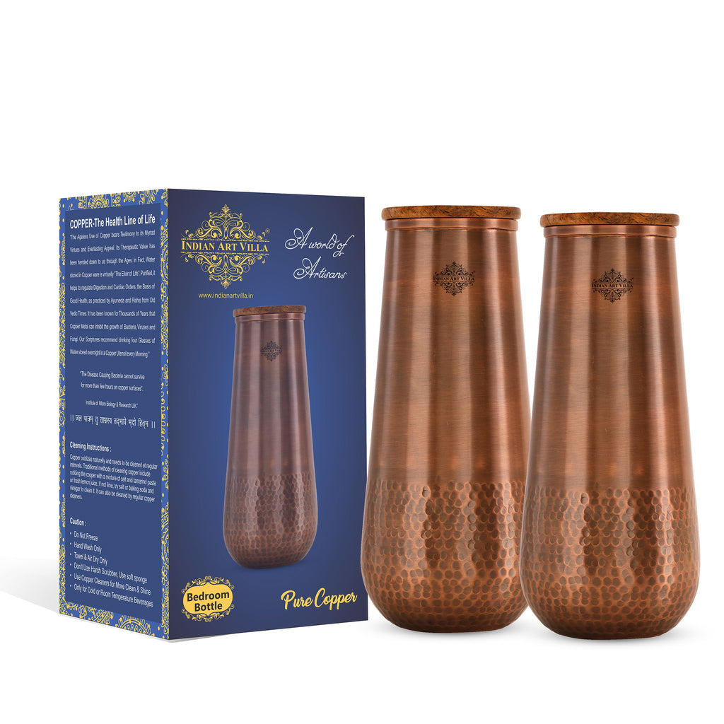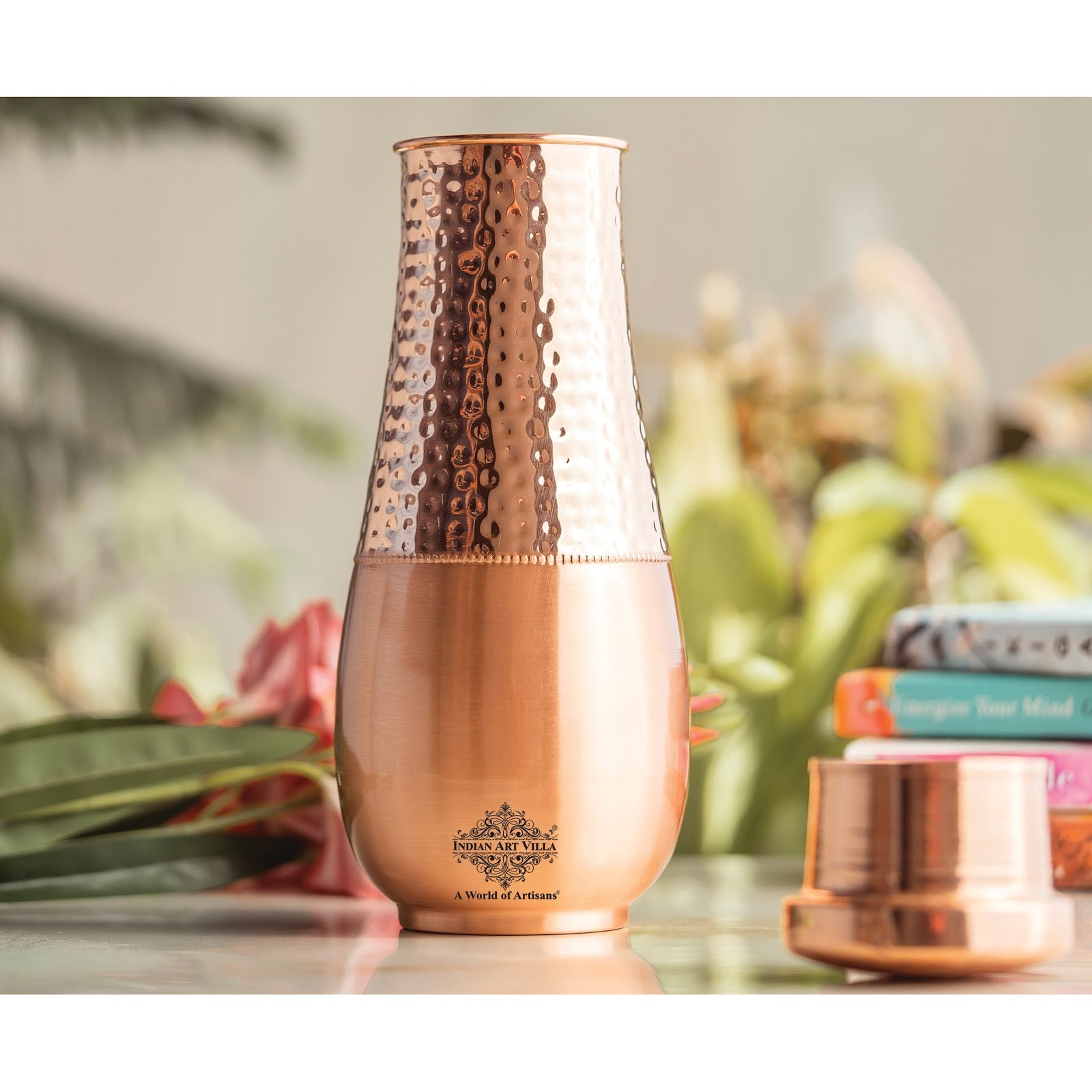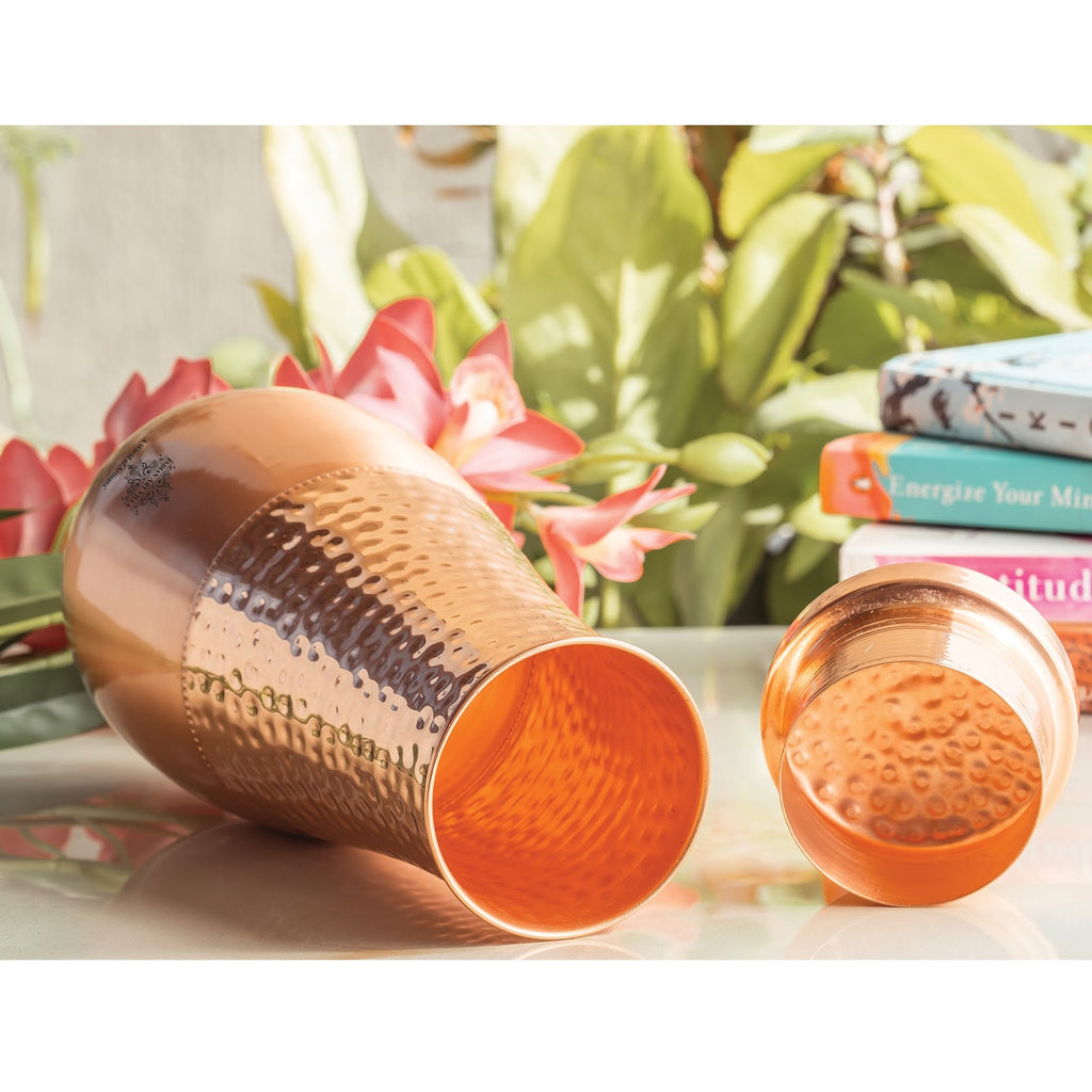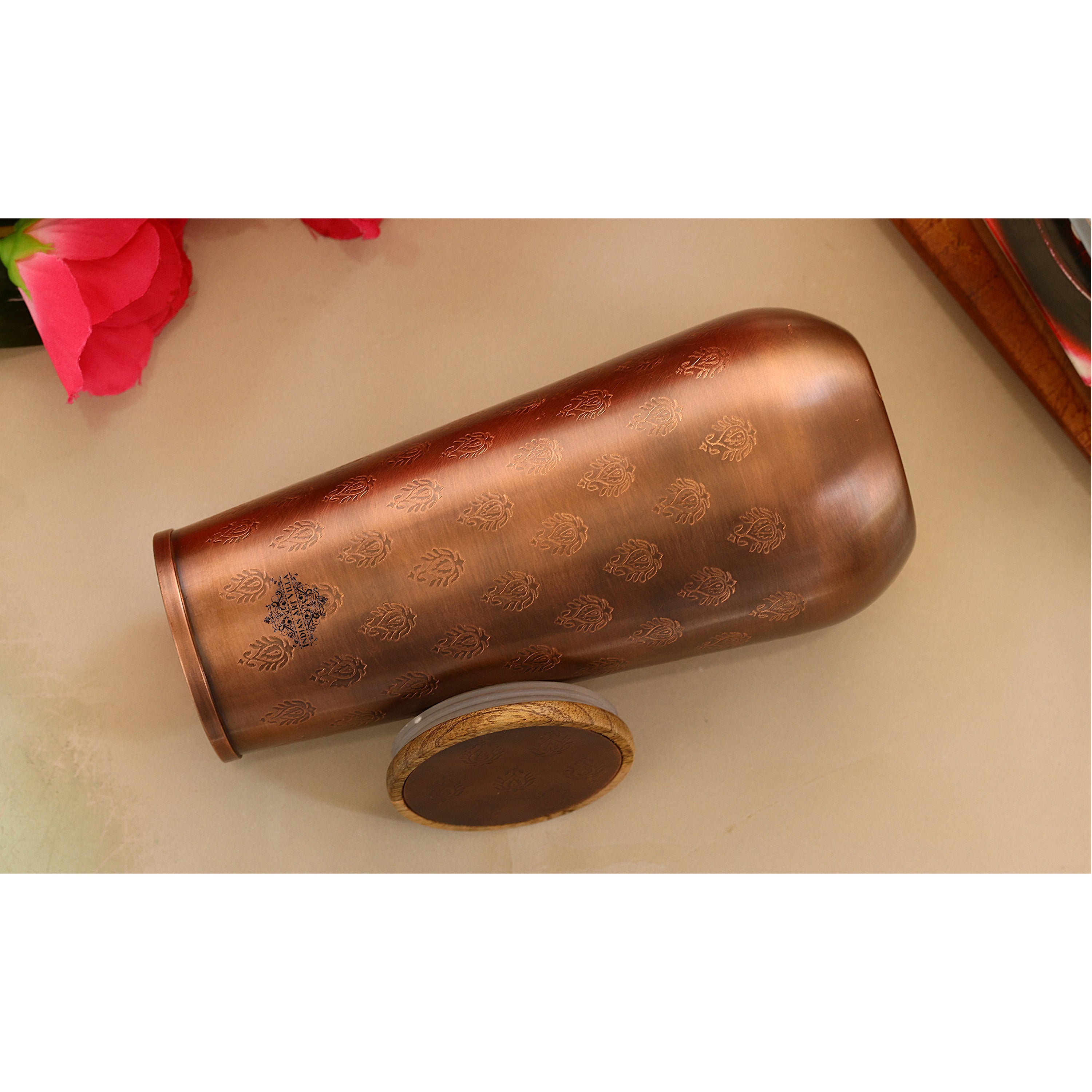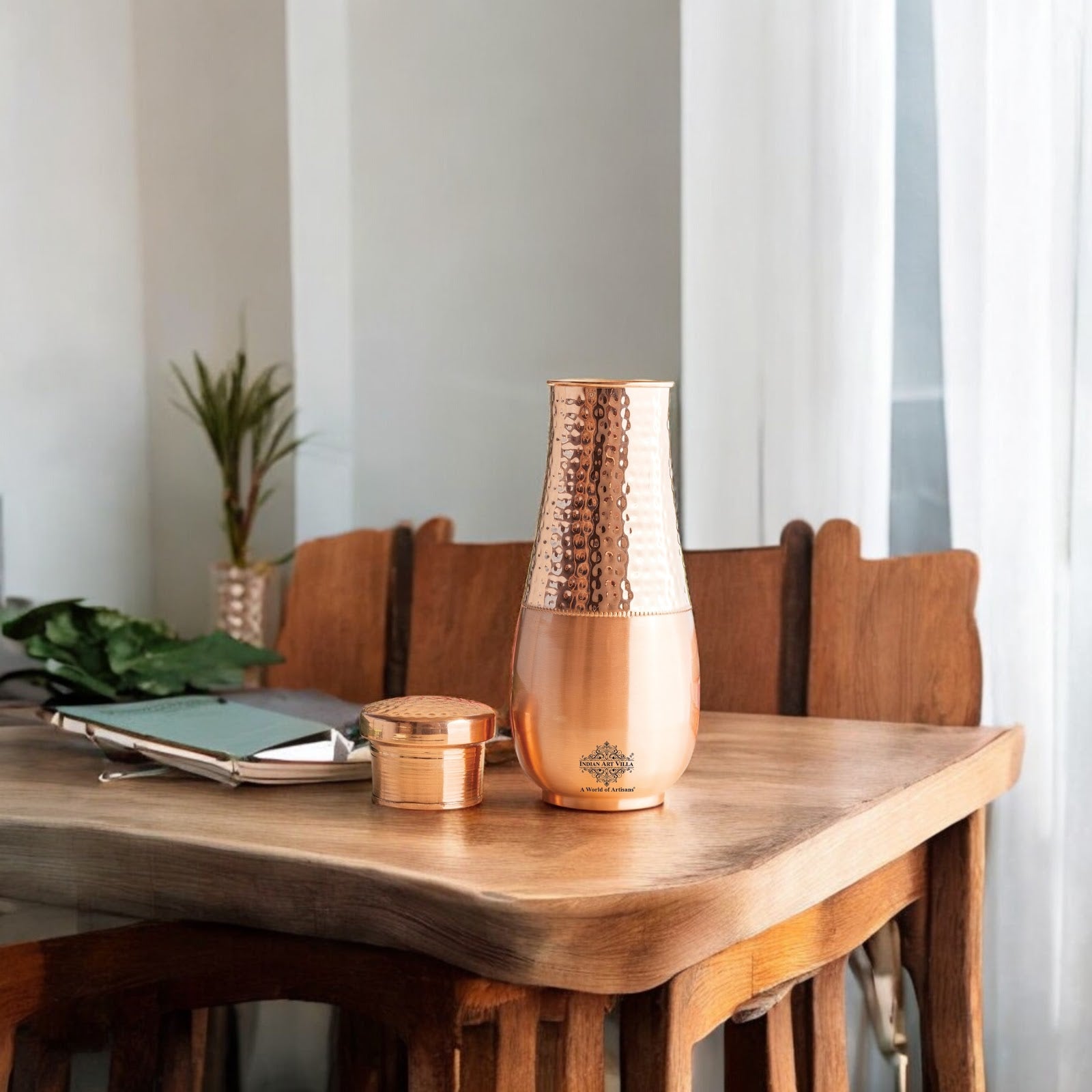 The Indian Art Villa Copper Bedroom water Bottle with Hemmered design is a beautifully crafted water bottle that is perfect for use in the bedroom or any other living space. It has a volume of 1300 ml, making it ideal for holding enough water for an entire day.The bottle is made of high-quality copper, which is known for its health benefits. Copper has antimicrobial properties that can help kill harmful bacteria and viruses. It also helps to improve digestion, boost the immune system, and promote healthy skin. The lacquer coating on the exterior of the bottle protects the copper from tarnishing and keeps it looking shiny and new for years. The wooden lid adds a touch of elegance to the bottle, and it also helps to keep the water inside fresh and clean. The lid fits snugly on the bottle, preventing any spills or leaks. The bottle's design is sleek and stylish, making it a perfect addition to any bedroom or living space.The Indian Art Villa Copper lacquer Bedroom water Bottle with wooden lid is a high-quality, beautifully designed water bottle that is both functional and aesthetically pleasing. Its large volume and health benefits make it an ideal choice for those looking for a durable and stylish water bottle.