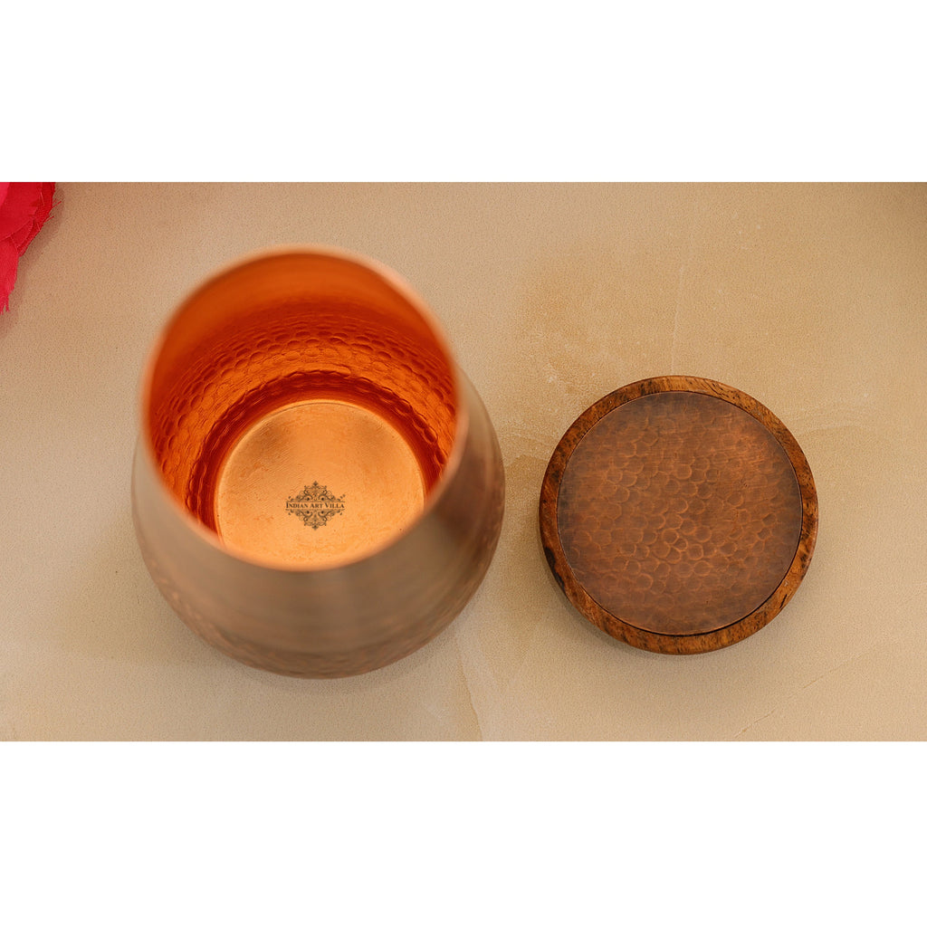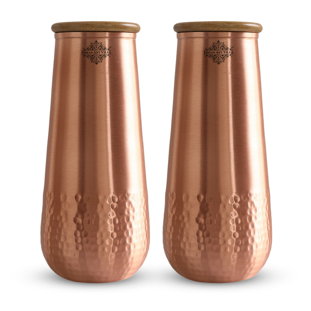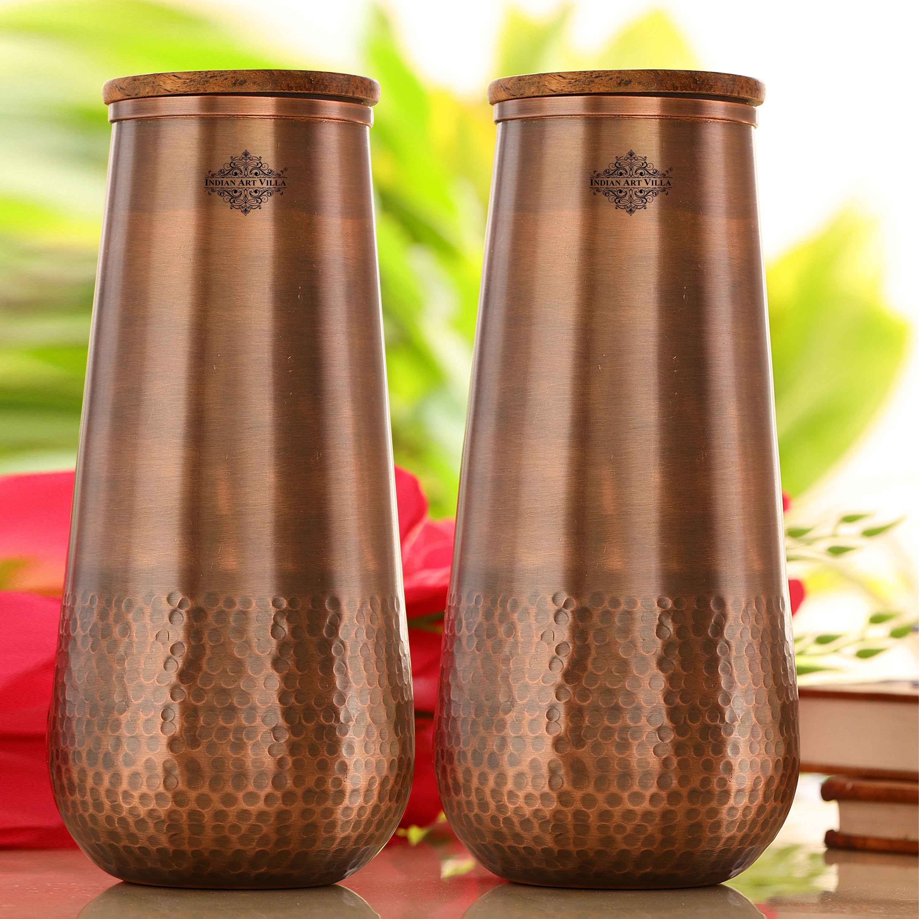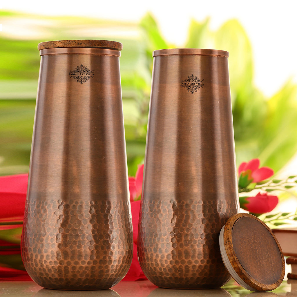 The Indian Art Villa Copper Bedroom water Bottle with Hemmered design is a beautifully crafted water bottle that is perfect for use in the bedroom or any other living space. It has a volume of 1300 ml, making it ideal for holding enough water for an entire day.The bottle is made of high-quality copper, which is known for its health benefits. Copper has antimicrobial properties that can help kill harmful bacteria and viruses. It also helps to improve digestion, boost the immune system, and promote healthy skin. The lacquer coating on the exterior of the bottle protects the copper from tarnishing and keeps it looking shiny and new for years. The wooden lid adds a touch of elegance to the bottle, and it also helps to keep the water inside fresh and clean. The lid fits snugly on the bottle, preventing any spills or leaks. The bottle's design is sleek and stylish, making it a perfect addition to any bedroom or living space.The Indian Art Villa Copper lacquer Bedroom water Bottle with wooden lid is a high-quality, beautifully designed water bottle that is both functional and aesthetically pleasing. Its large volume and health benefits make it an ideal choice for those looking for a durable and stylish water bottle.
