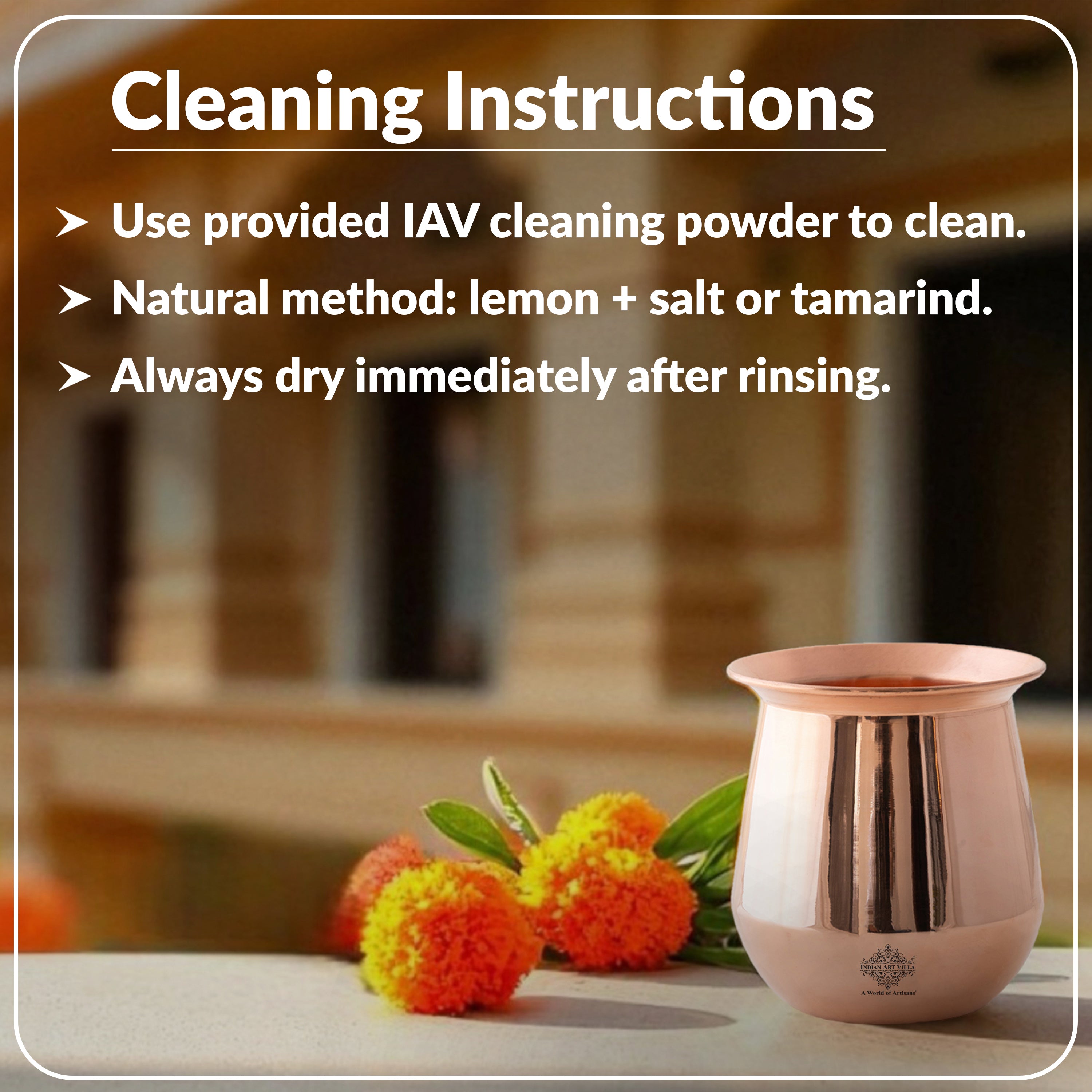 - Copper Products Tarnish/oxidize over time, this is Natural for Copper products. Please follow the care Instruction manual for cleaning Copper products. Sample Copper Cleaning powder and instruction manual are provided with every order.