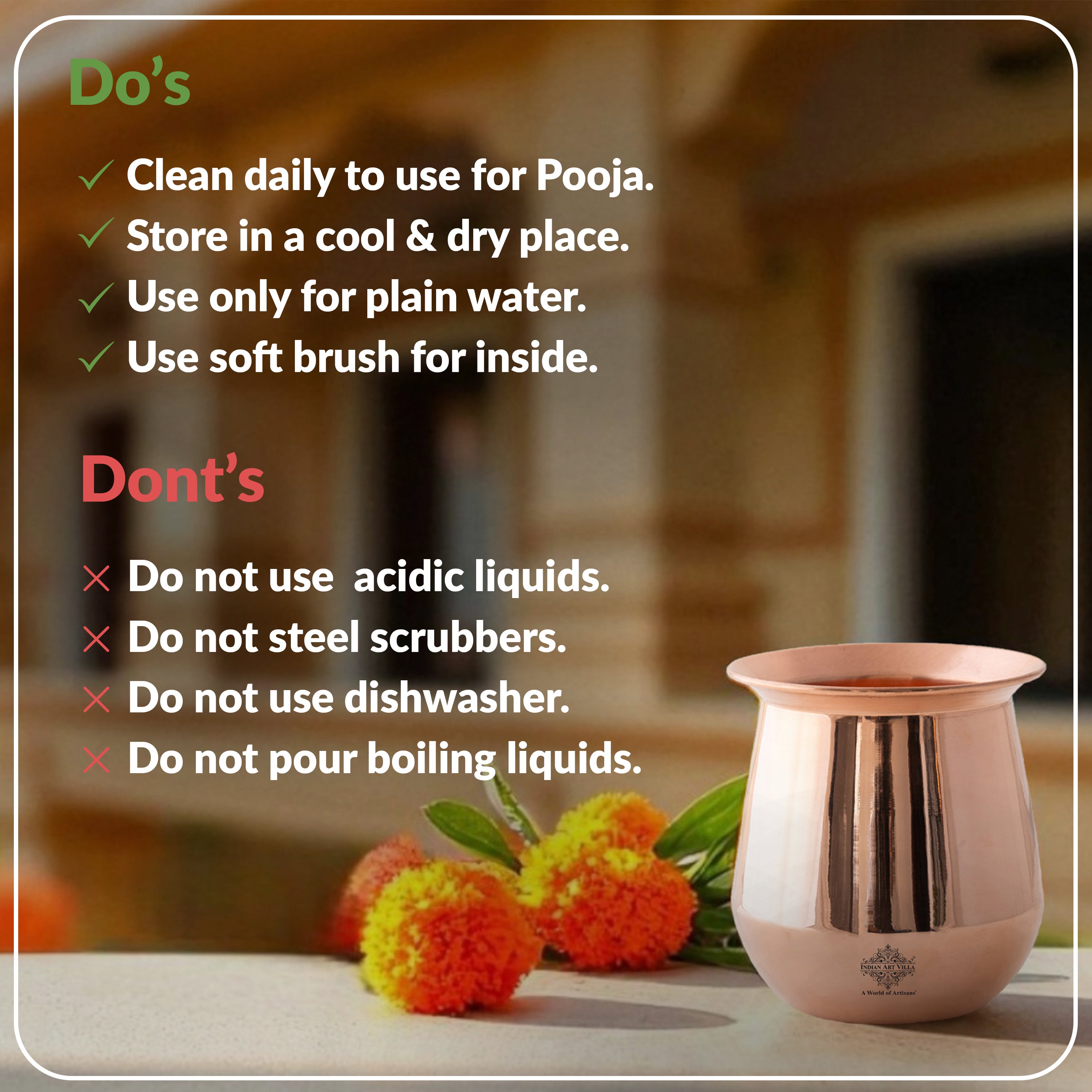 - This Kalash Or Lota is great for keeping in the temple. This Kalash can be useful in pooja, home decorate, wedding and many more. Constructed out of premium copper to last long.
