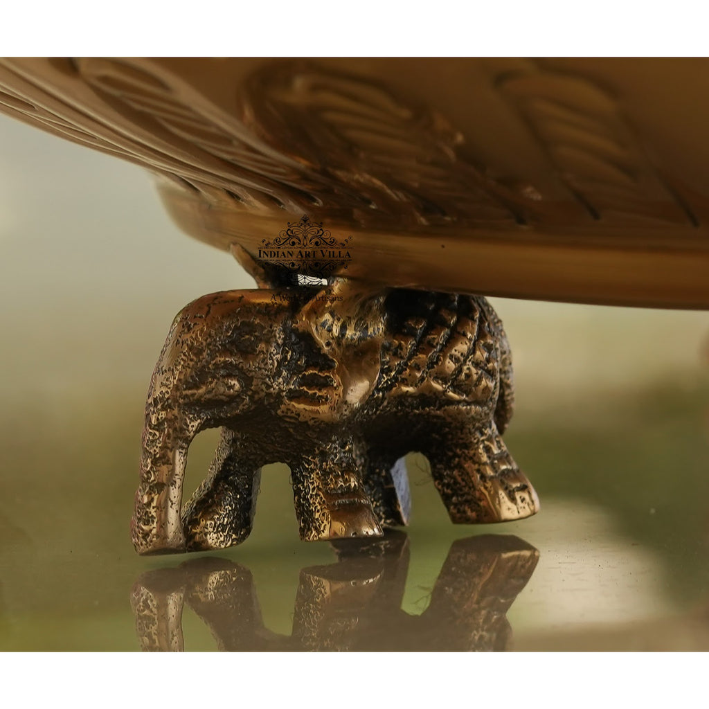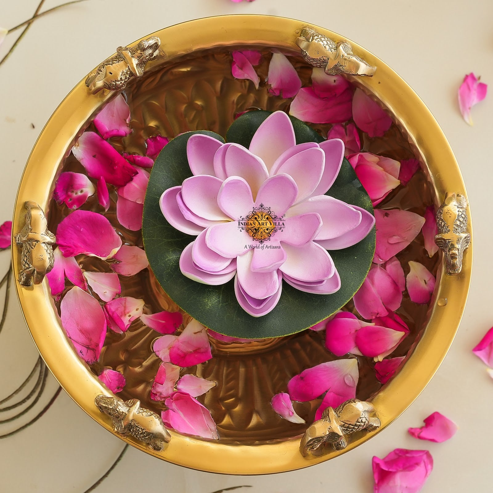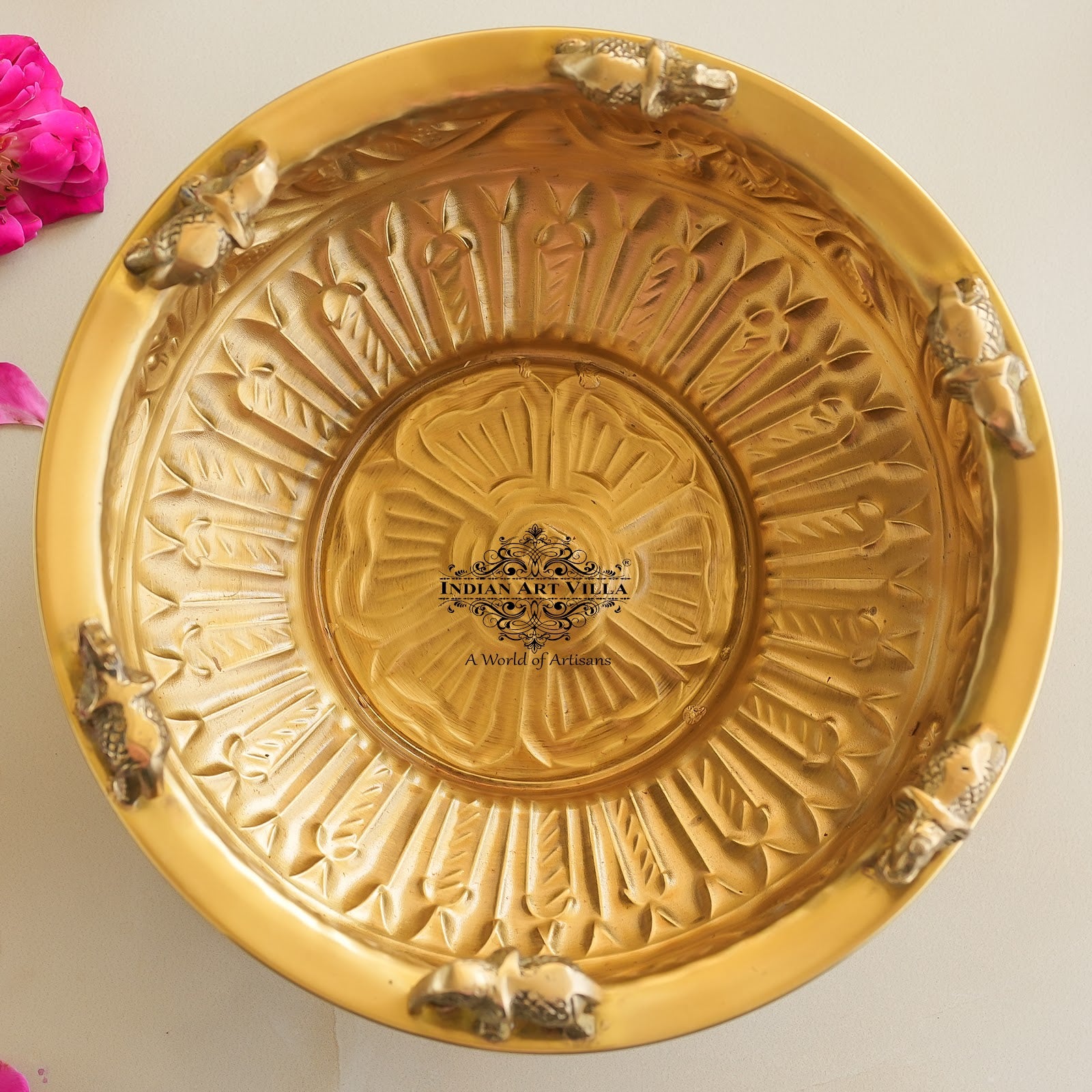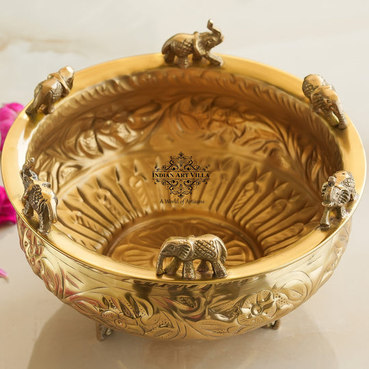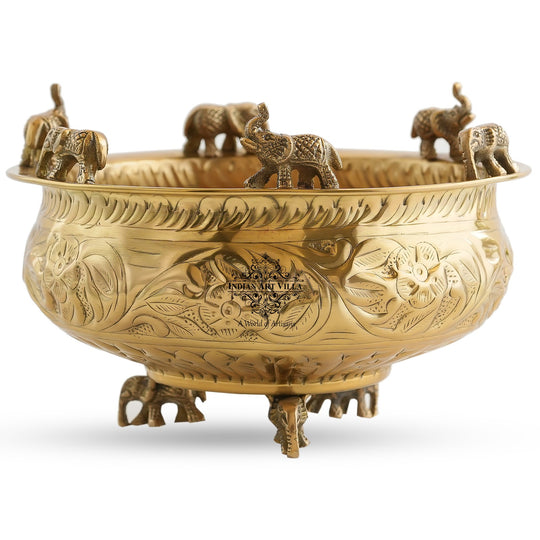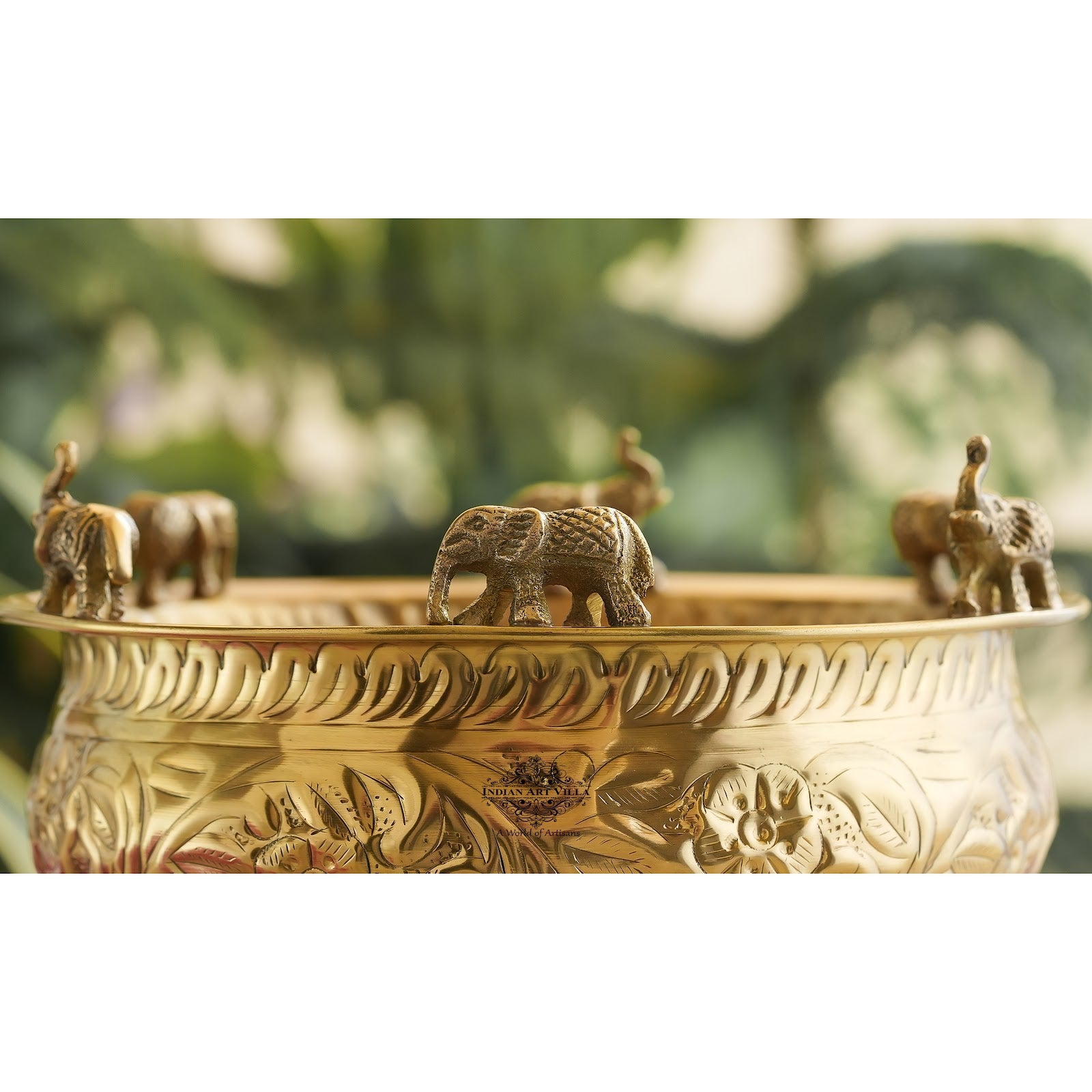 IndianArtVilla Pure Brass Embossed Design Urli with Elephant Statue is a stunning home decorative item that embodies traditional Indian craftsmanship and elegance. Made from high-quality pure brass, this urli features intricate embossed designs that highlight the artisan's skill and attention to detail. Its antique brass finish gives it a timeless, vintage appeal, making it a perfect addition to any home decor. The urli is adorned with a beautifully crafted elephant statue, symbolizing strength, wisdom, and good fortune in Indian culture. This combination of elements makes it not only a decorative piece but also a symbol of cultural heritage and positive energy. Ideal for various decorative uses, the urli can be filled with water and embellished with floating candles or flowers, creating a serene and inviting ambiance. It is perfect for living rooms, hallways, entryways, or as a centerpiece during festive occasions and celebrations. Available in different sizes, the IndianArtVilla Pure Brass Embossed Design Urli caters to diverse decor needs, ensuring versatility and functionality. Easy to maintain, this brassware piece requires regular cleaning with a soft cloth to preserve its shine and beauty. This urli is a perfect gift for housewarmings, weddings, or any special occasion, adding a touch of elegance and tradition to any space.