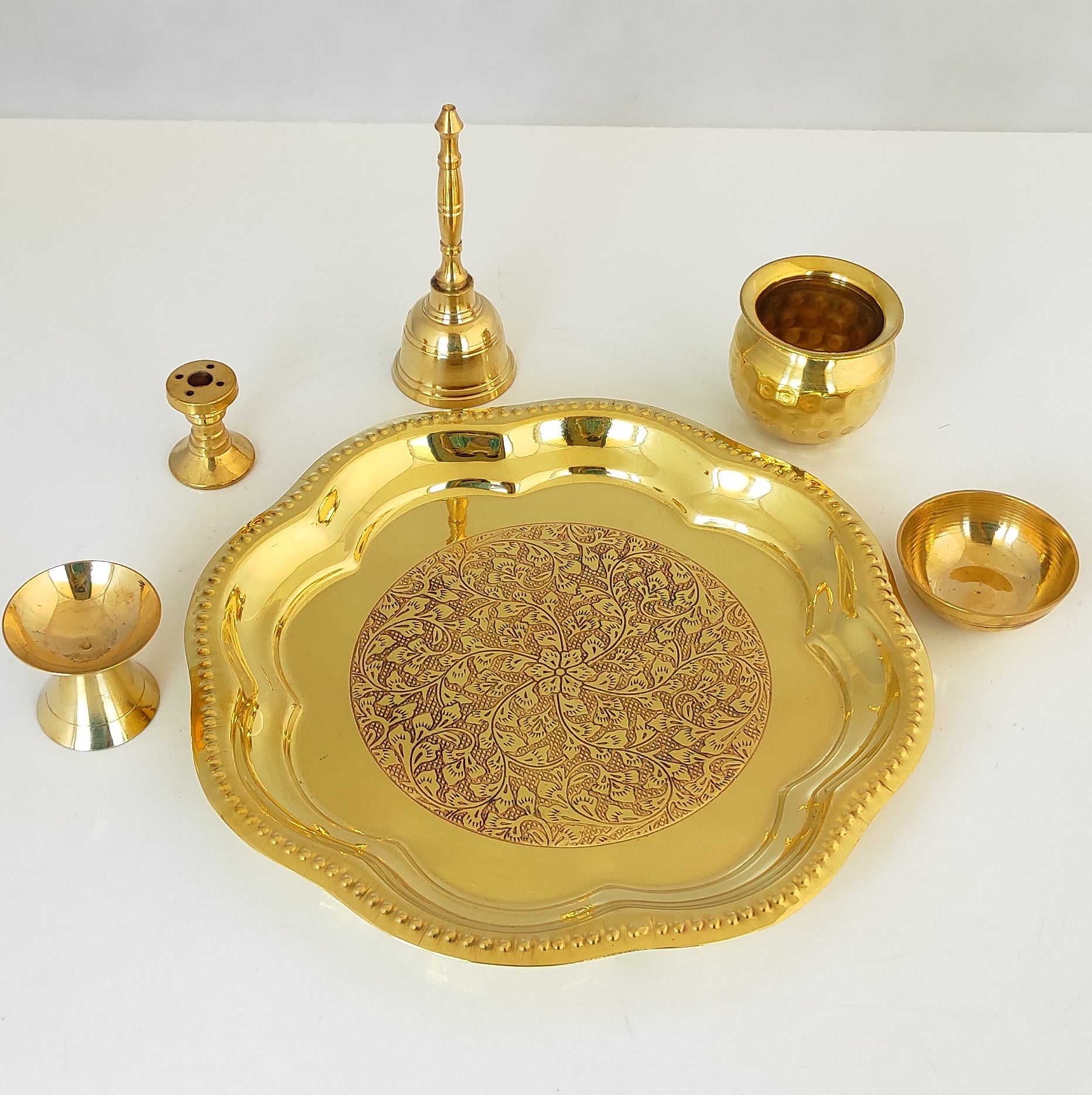 - Indian Art Villa Brass Floral Embossed Design 6 Pieces Pooja Thali Set, it was almost impossible to find one that came in a design other than the plain one. Indian Art Villa Provide You with different designs to choose from, allowing you to pick your favorite design or collect them all for those who want a variety of options.