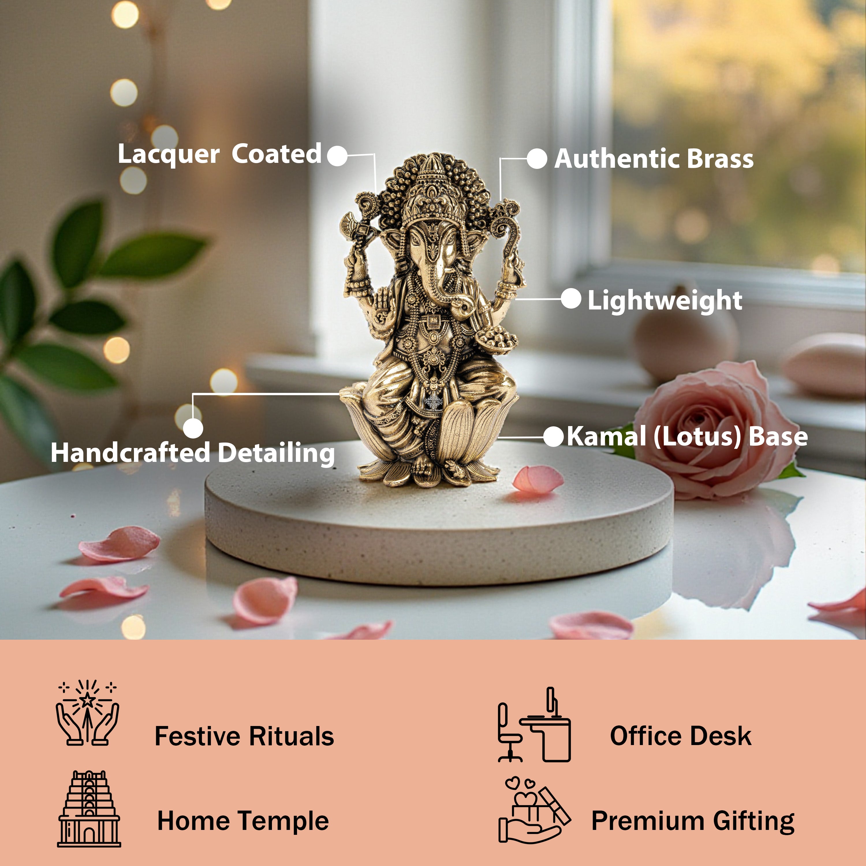 The Indian Art Villa Brass Ganesh Ji Murti Sitting on Kamal is a beautifully handcrafted statue made from authentic brass, featuring Lord Ganesh seated on a lotus (kamal). Standing at 5cm 10cm & 15cm, this murti symbolizes prosperity, wisdom, and the removal of obstacles, making it a powerful spiritual icon. The non-lacquered finish enhances the natural beauty of the brass, allowing it to develop a unique patina over time, adding to its timeless charm and authenticity.