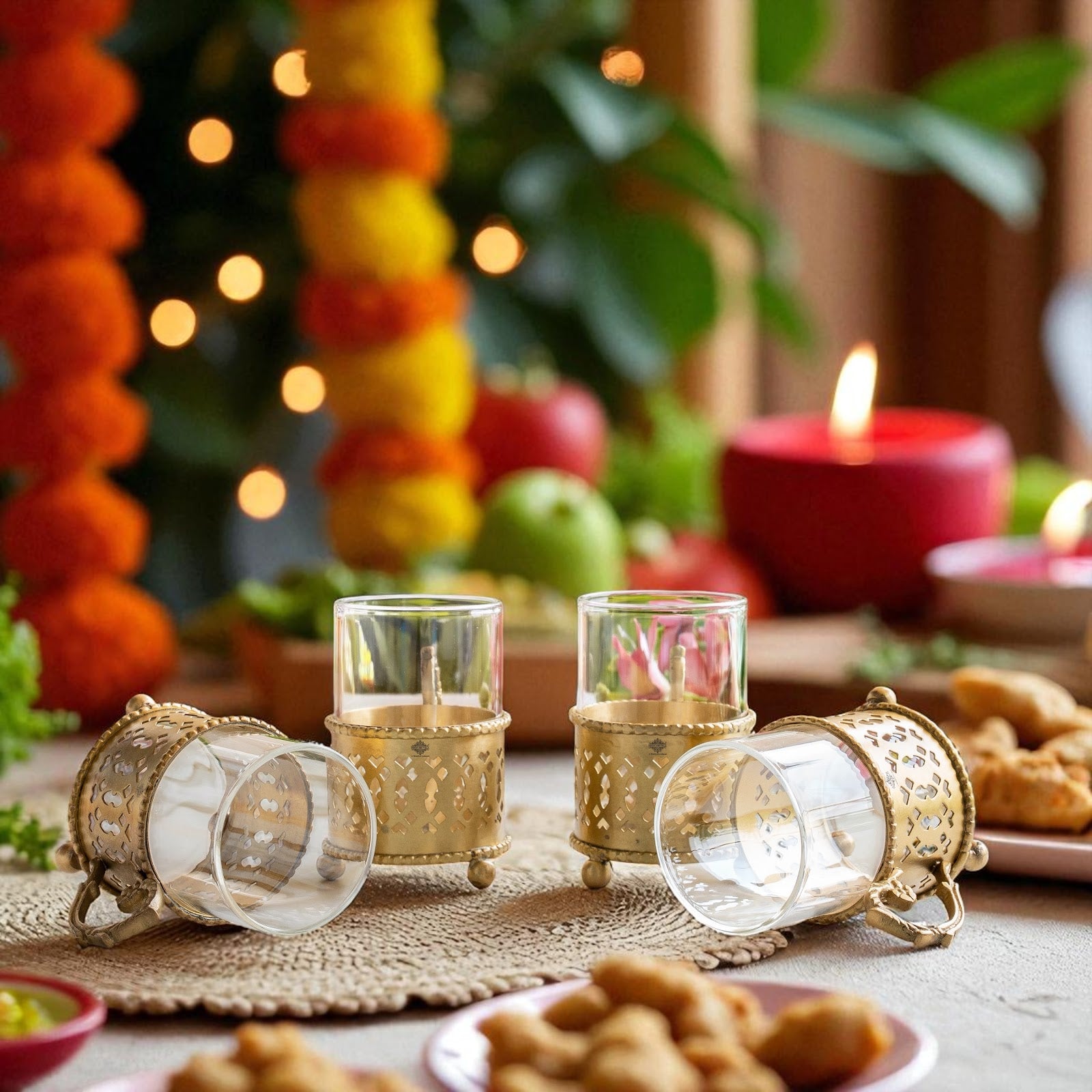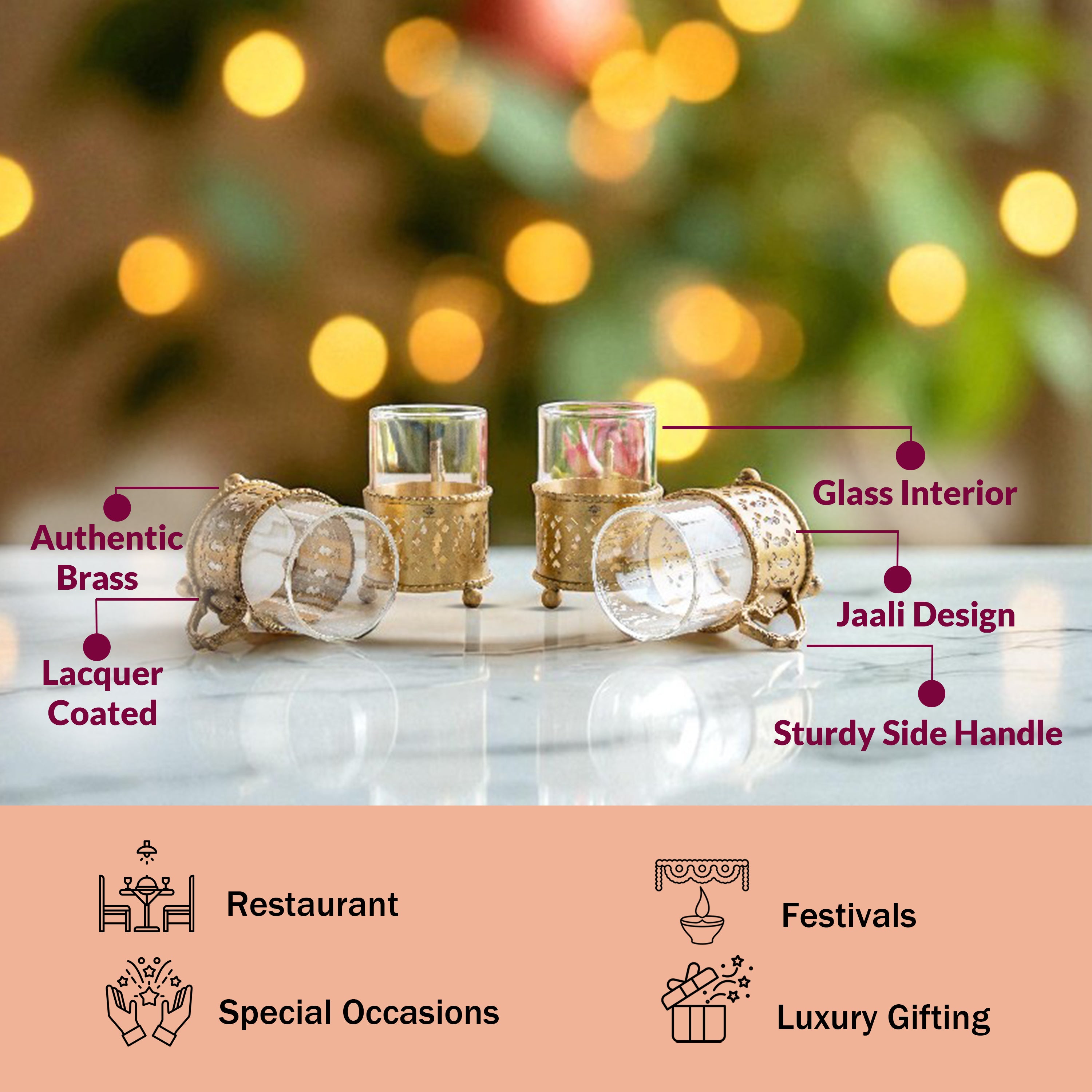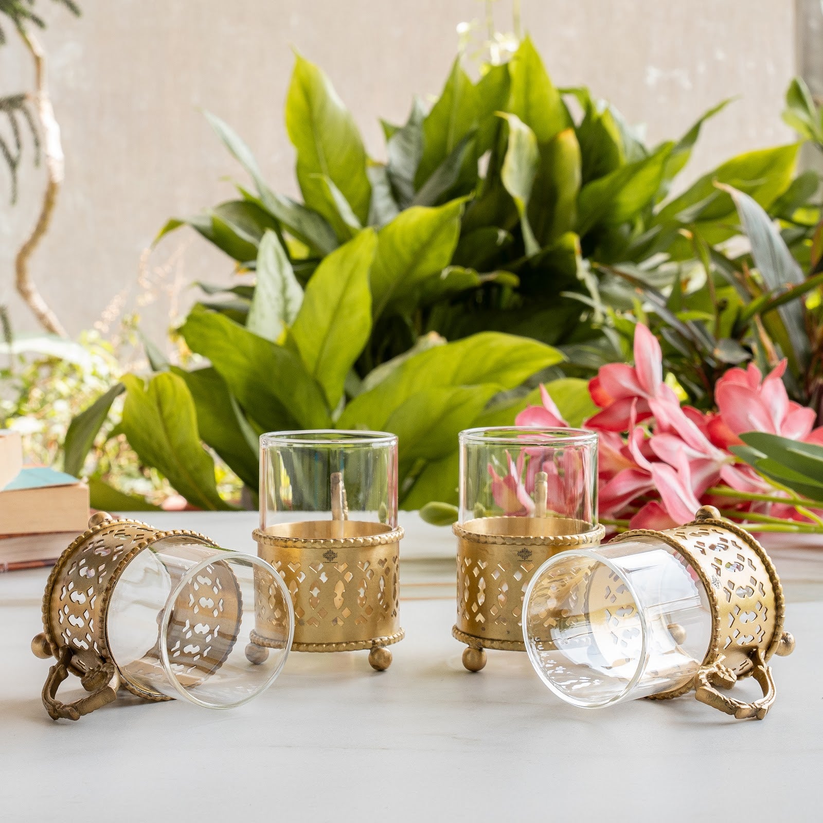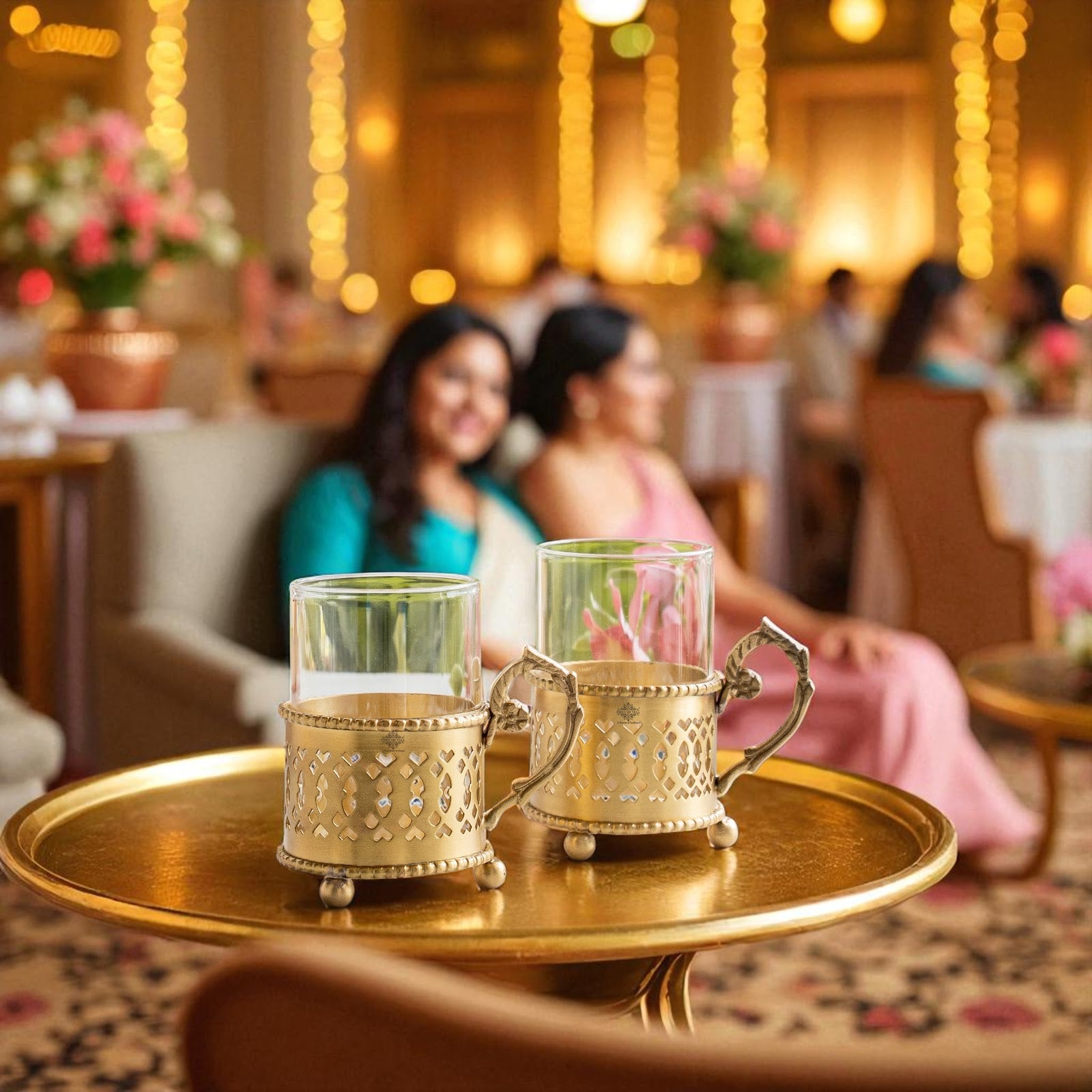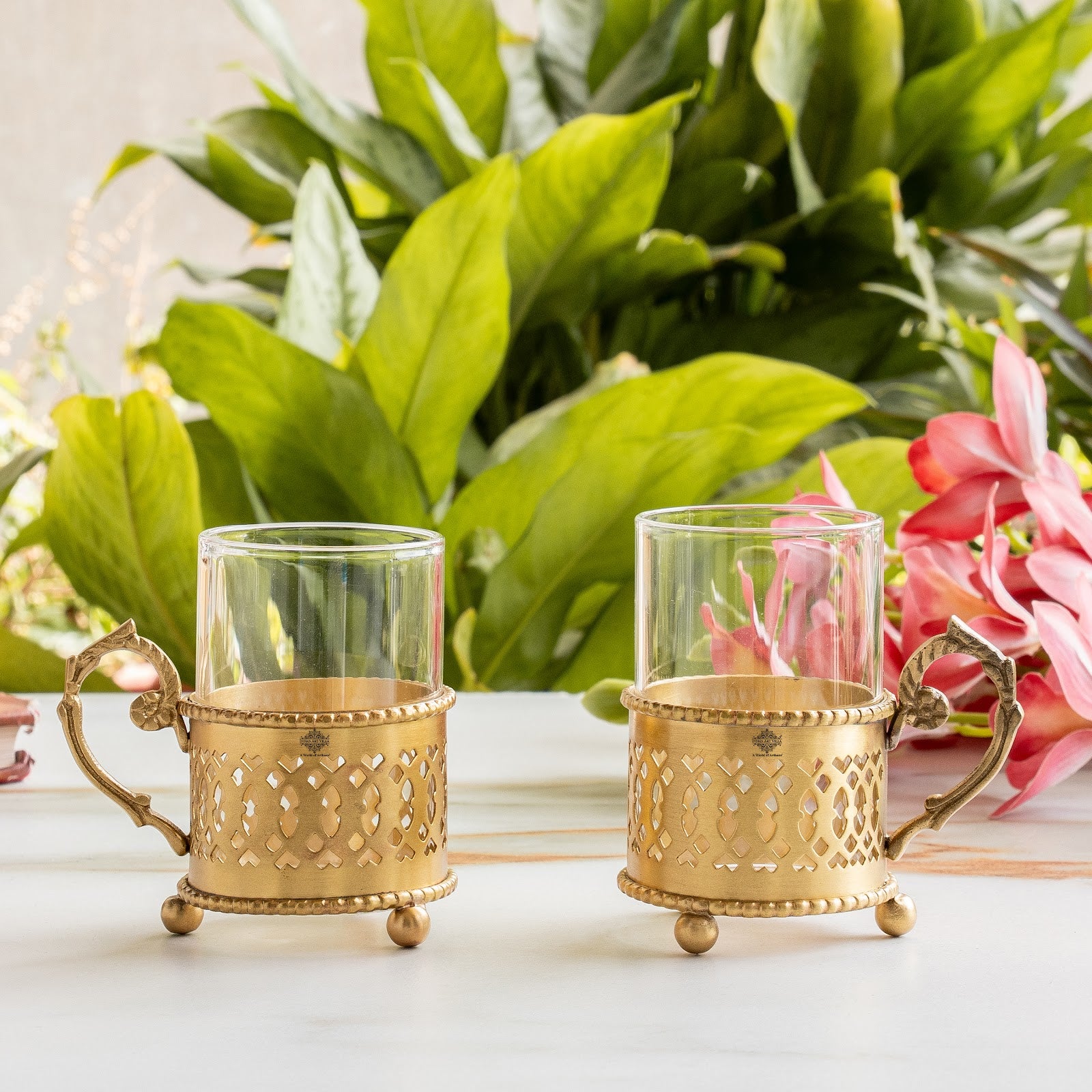 Elegant Glass & Brass Combination – Transparent glass cups with beautifully designed brass holders for a royal tea-time experience.