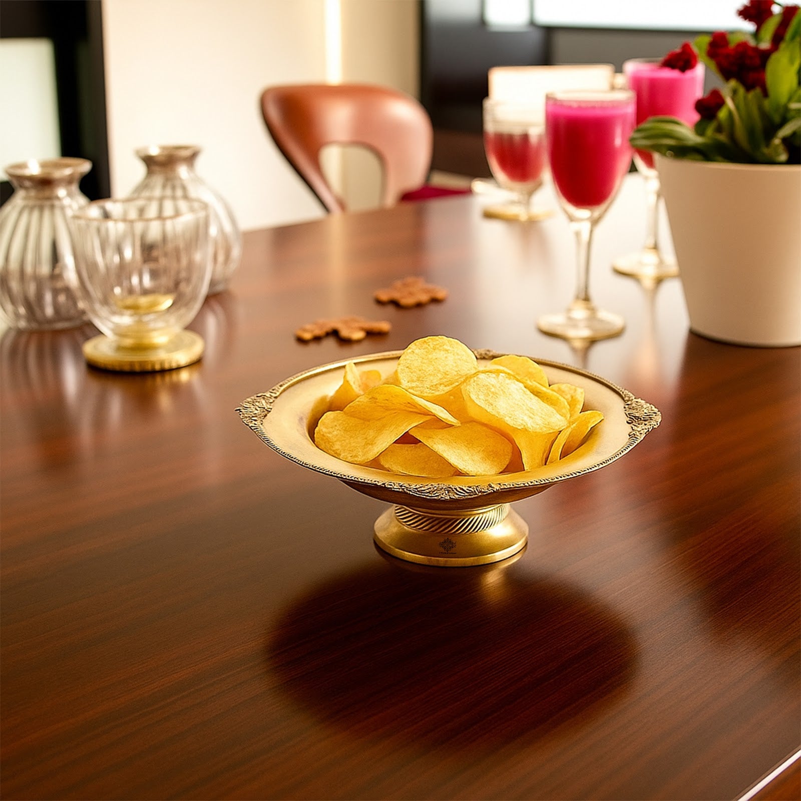 Royal Round Pedestal Design – Designed with a raised base and decorative floral handles, offering a regal look ideal for festive tables and traditional décor setups.