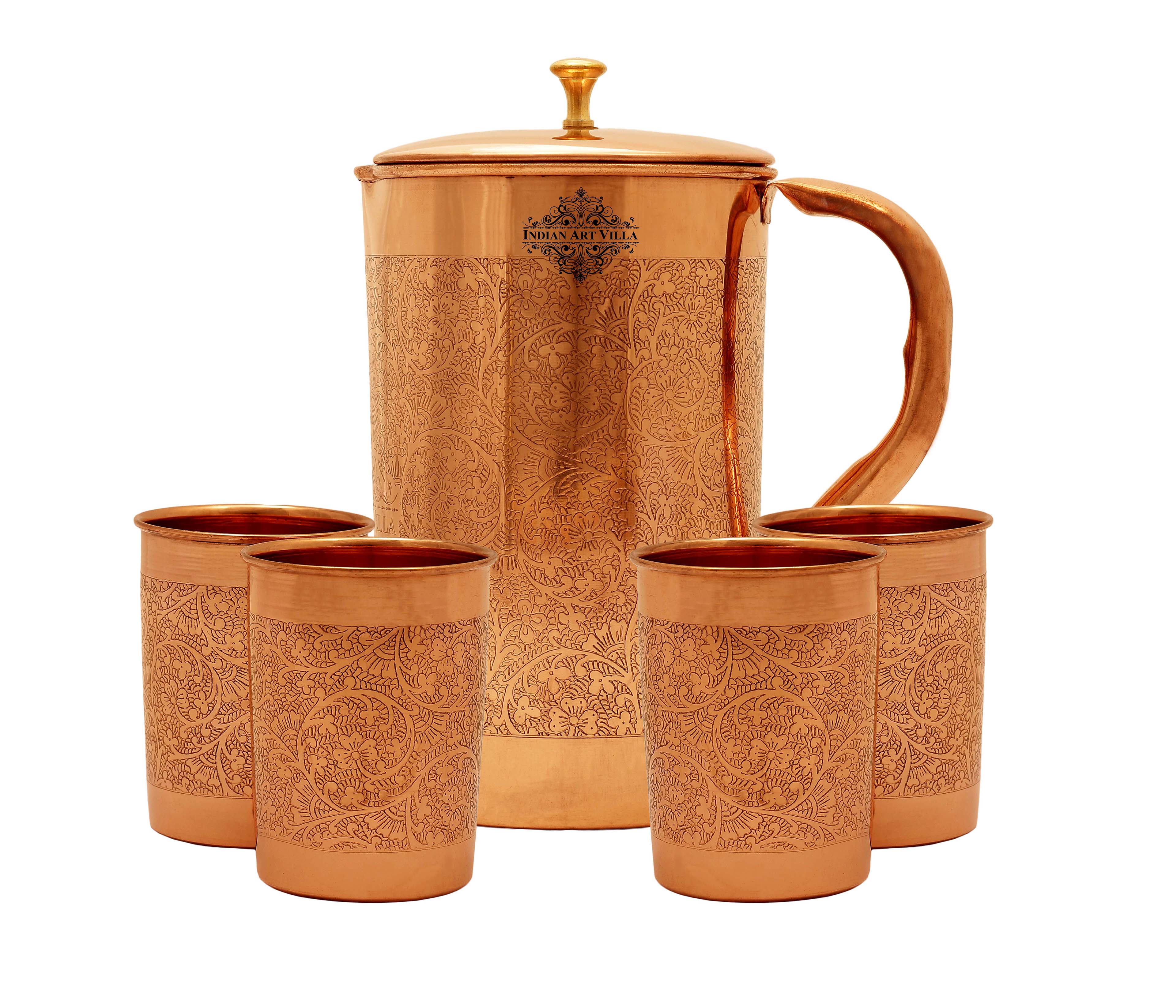 • Indian Art Villa Pure Copper Embossed Jug Pitcher With Embossed Glass, it was almost impossible to find one that came in a design other than the plain one. Indian Art Villa Provide You with different designs to choose from, allowing you to pick your favorite design or collect them all for those who want a variety of options.