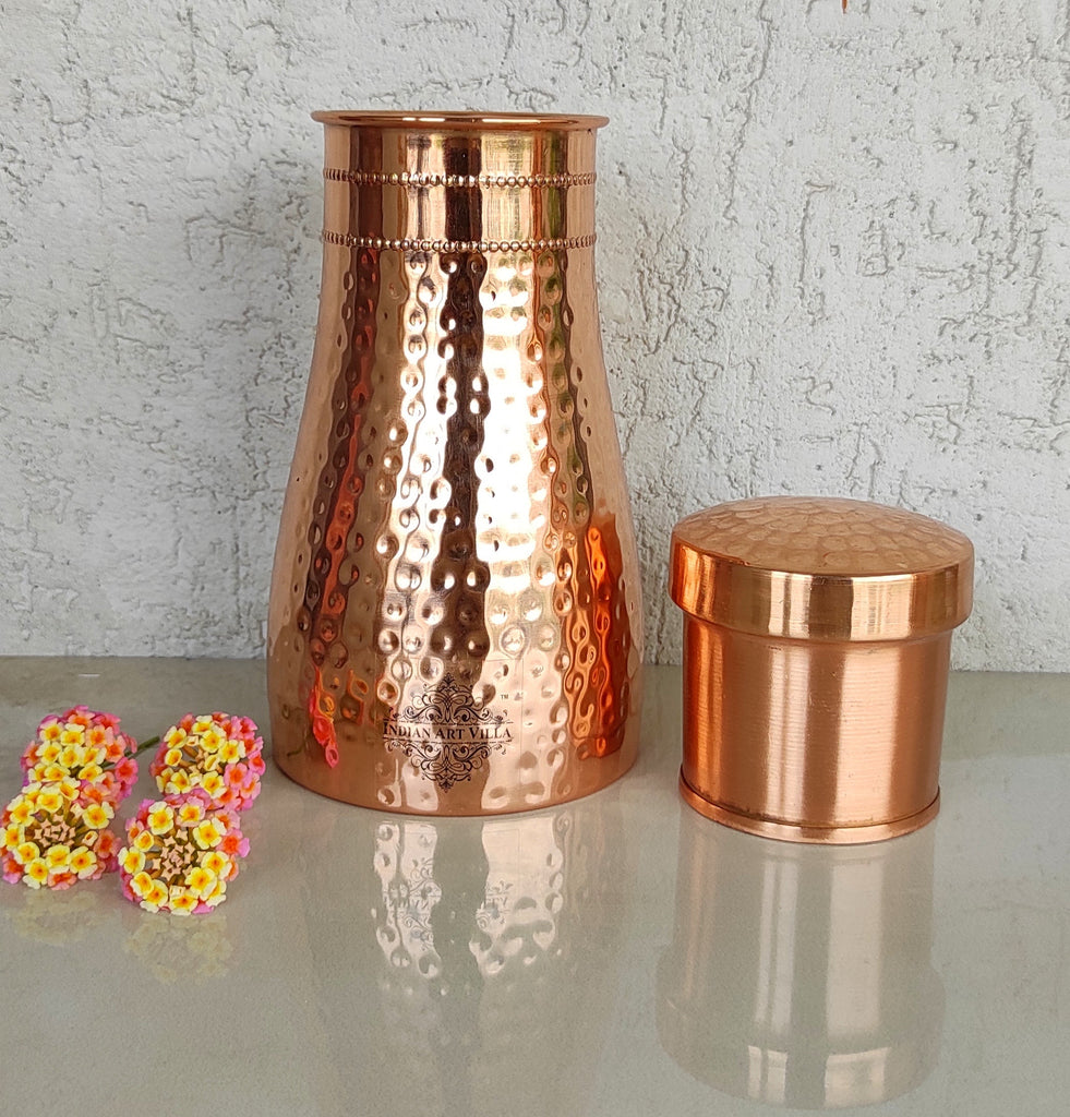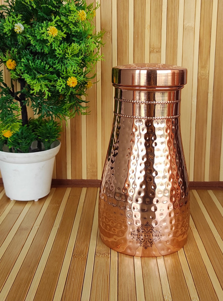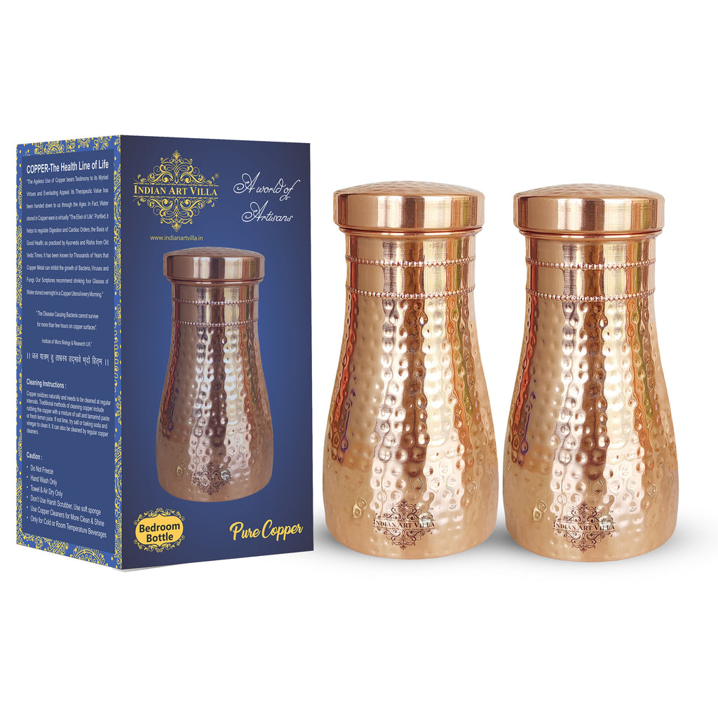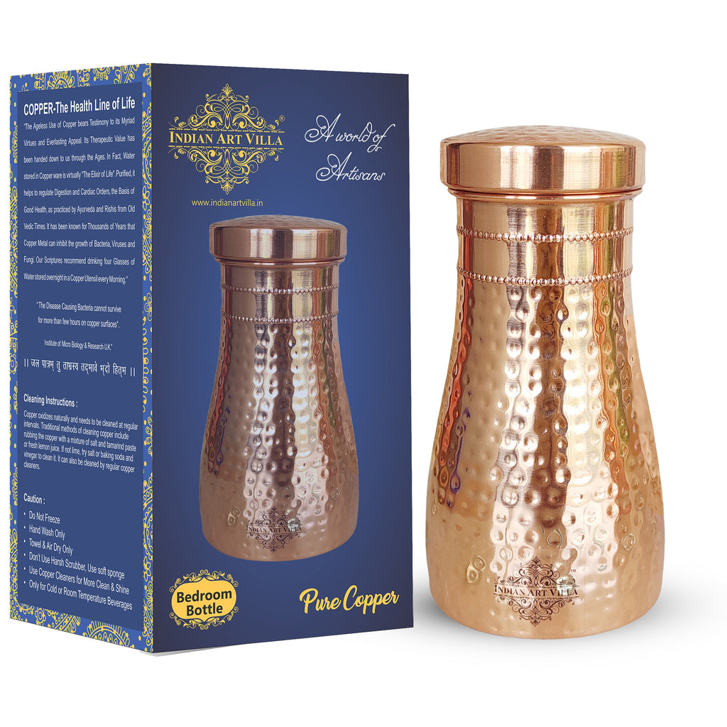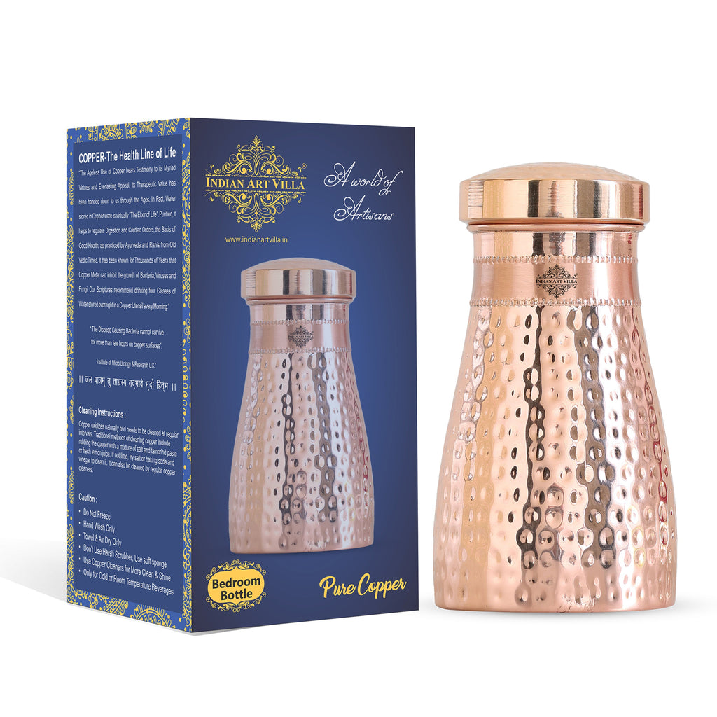 Experience convenience and tradition with the Indian Art Villa Pure Copper Bedroom Water Bottle with Inbuilt Glass. Beautifully handcrafted in a hammered finish, this premium copper bottle is designed for bedroom use and easy night-time hydration. The top lid doubles as a detachable copper glass, making it a practical, space-saving bedside companion.