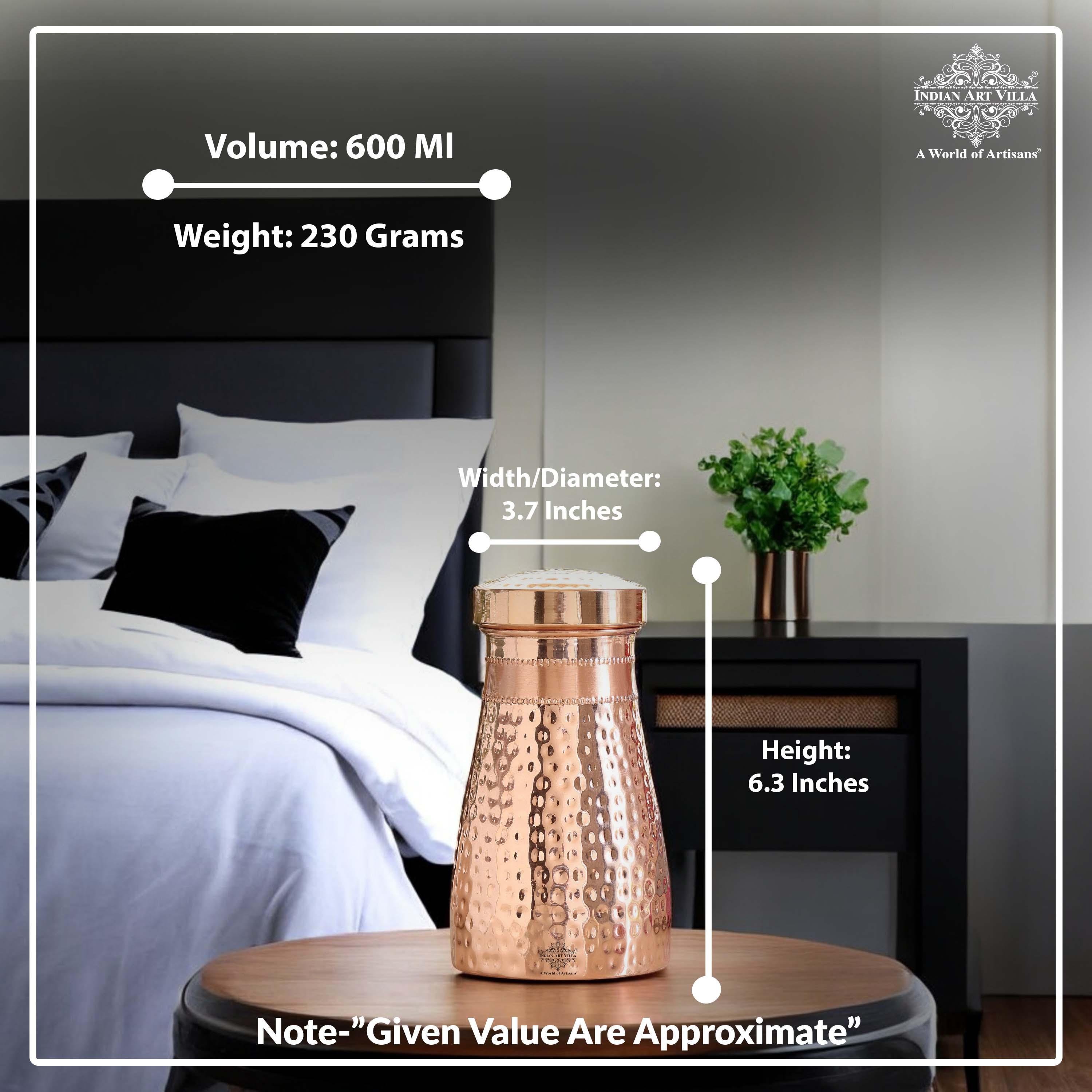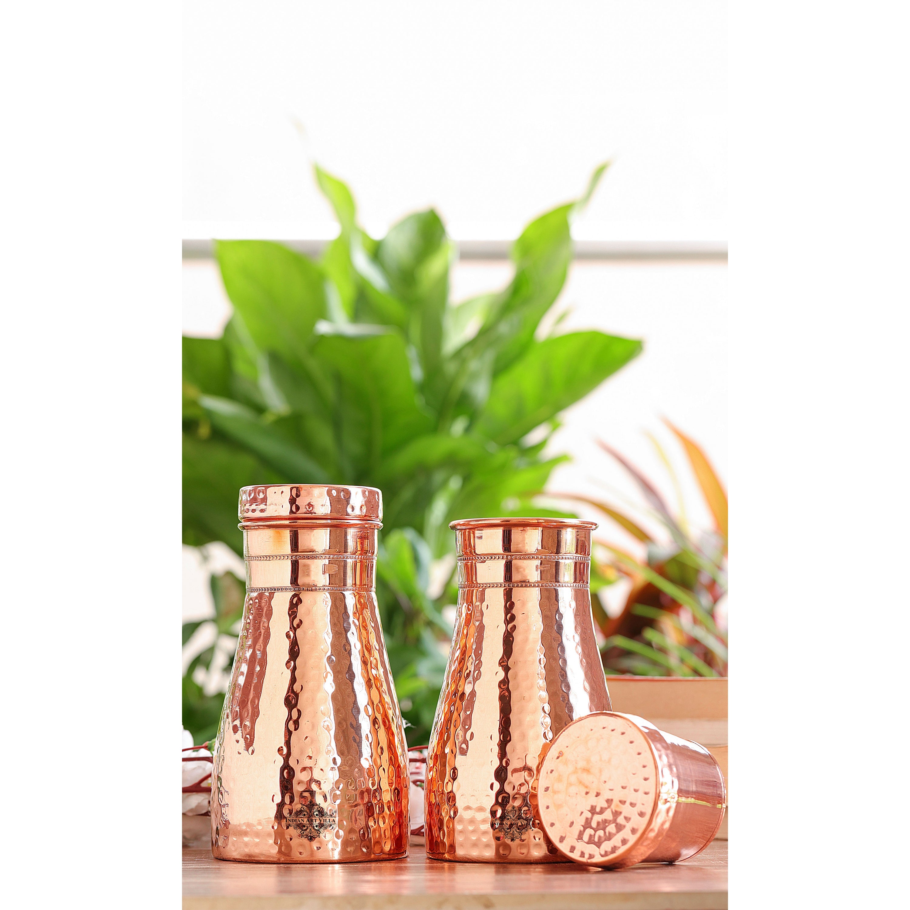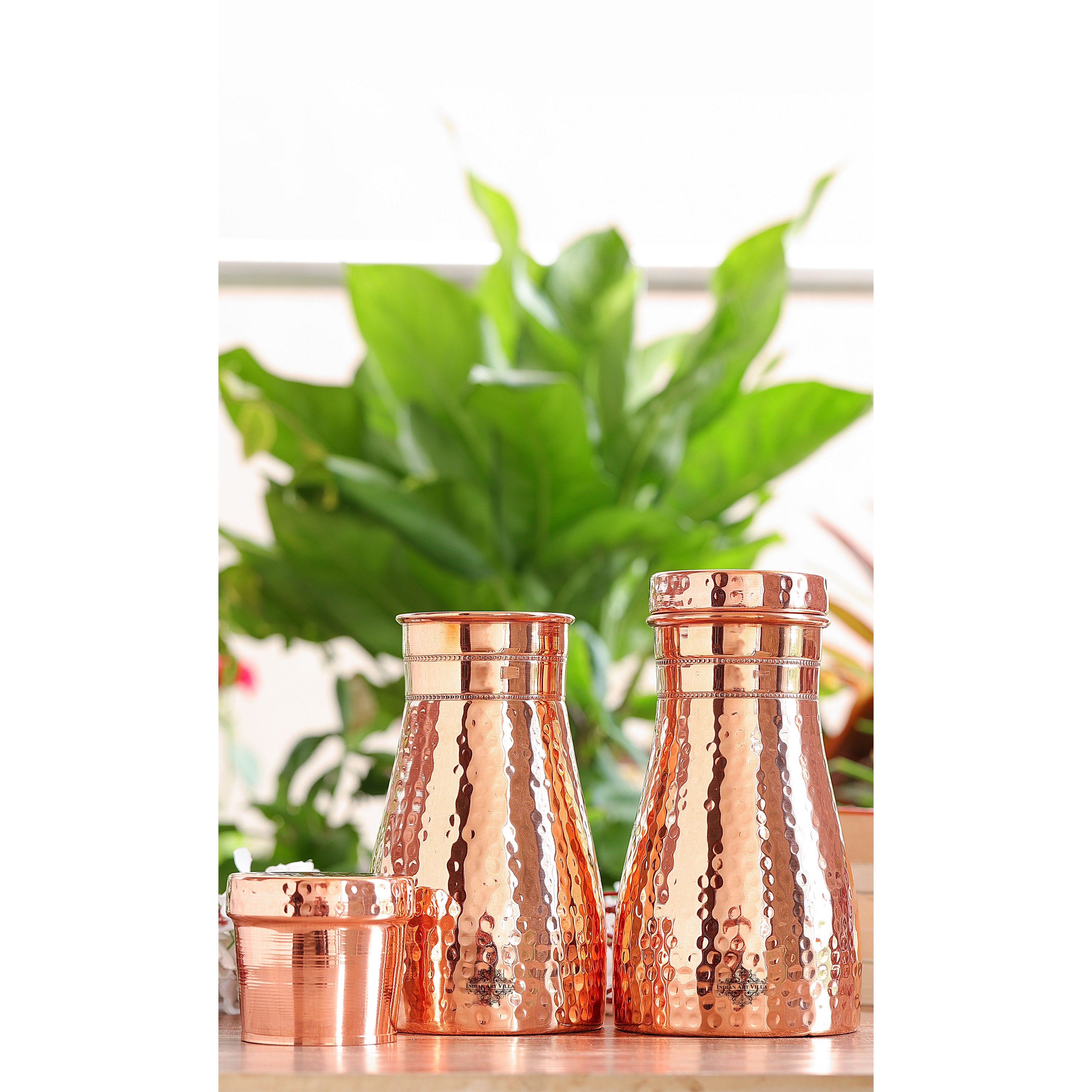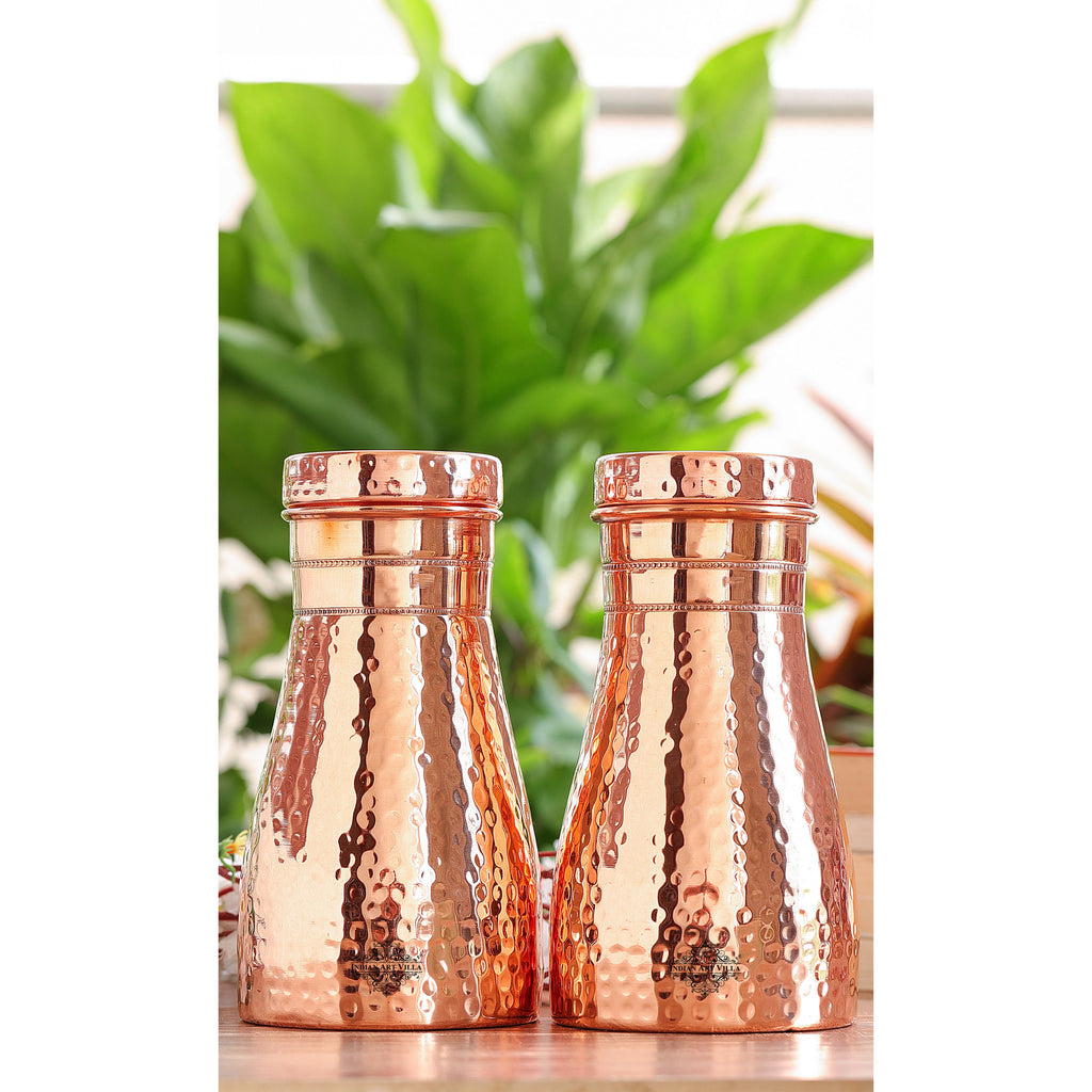 Experience convenience and tradition with the Indian Art Villa Pure Copper Bedroom Water Bottle with Inbuilt Glass. Beautifully handcrafted in a hammered finish, this premium copper bottle is designed for bedroom use and easy night-time hydration. The top lid doubles as a detachable copper glass, making it a practical, space-saving bedside companion.