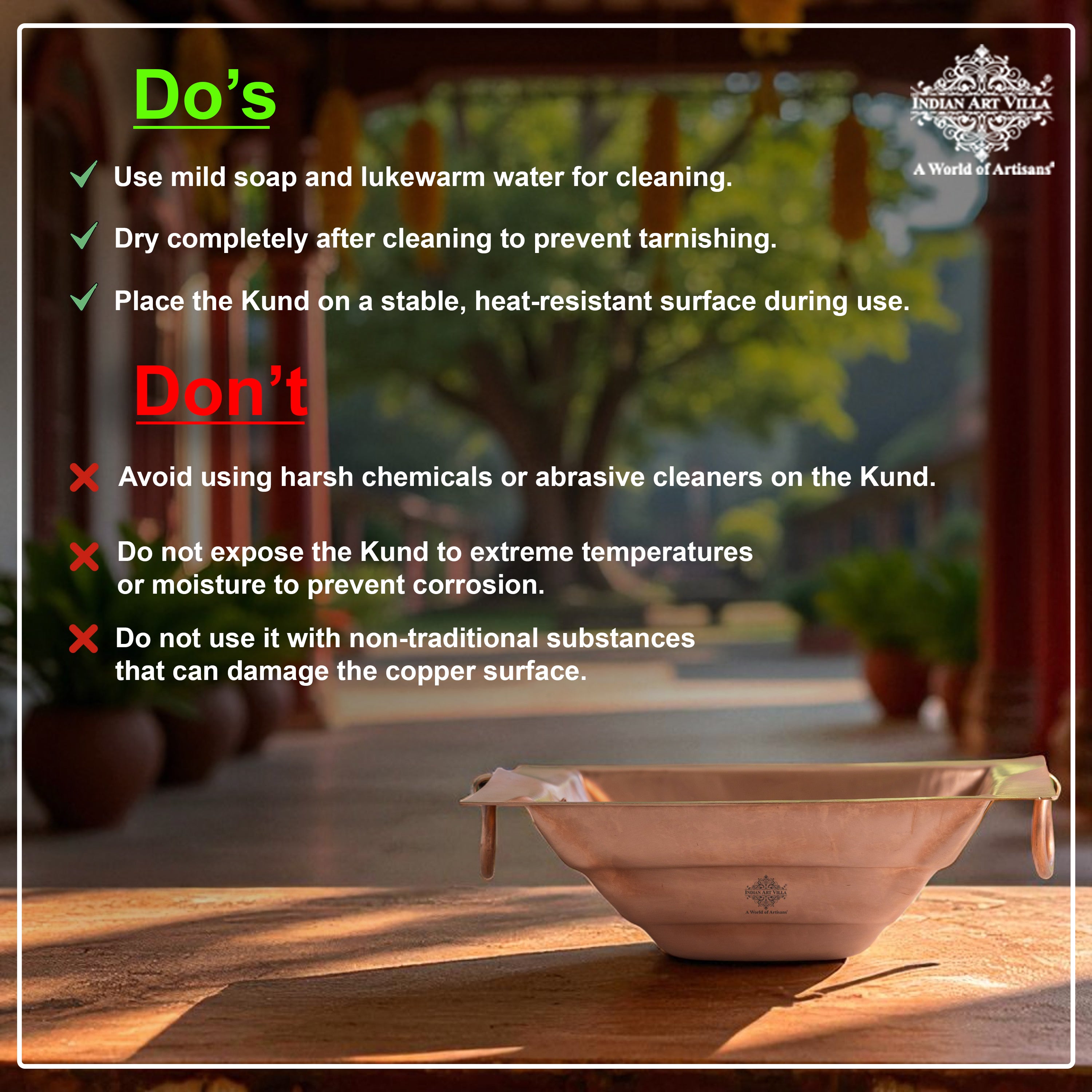 - Thoughtfully designed by Indian Art Villa, this Hawan Kund is given a refined touch and is of perfect size for Yagya. Thick copper ensures durability and has the strength to withstand high temperatures. The flat base ensures its stability on the surface where it is placed.