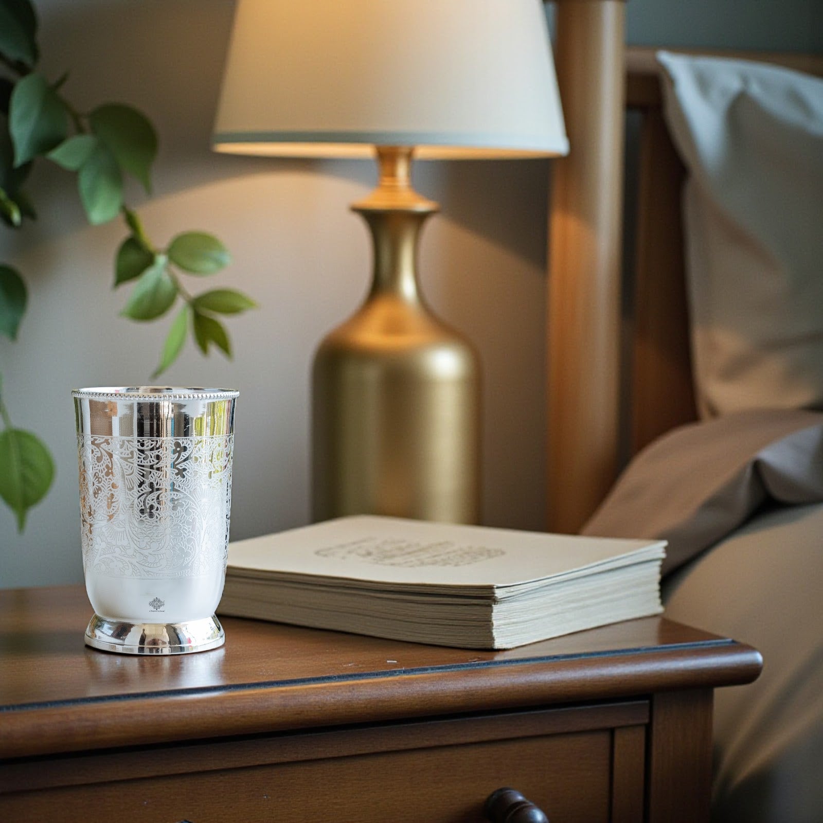 - These Pure Silver Plated Embossed Design Glass also have Trendy looks for better ergonomics. You can add Royal Vintage Look to your Kitchen & Dining by using these Set for your Drinkware/Storage purposes.