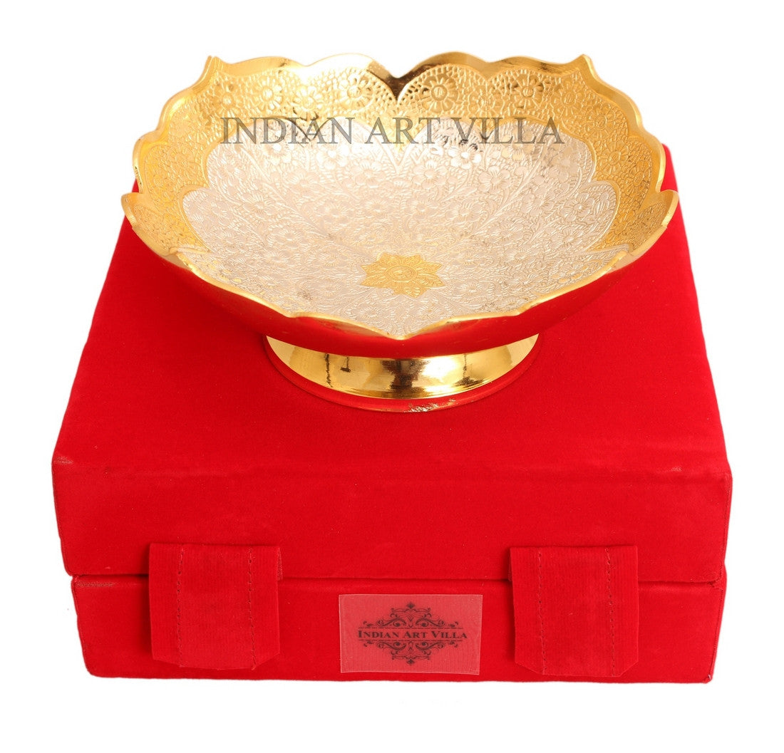 Indian Art Villa Silver Plated Gold Polished Designer Round Big Bowl, a stunning addition to your home or a perfect gift item for any occasion. This exquisite bowl showcases intricate craftsmanship and a captivating design. The silver plating and gold polish create a lustrous and elegant finish, making it a true centerpiece on any table. With its generous size, this bowl is ideal for serving a variety of items, from dry fruits to desserts. Its versatile nature makes it suitable for both home and hotel use, adding a touch of sophistication to any setting. The impeccable detailing and round shape further enhance its visual appeal, making it a decorative piece that effortlessly complements your interior decor. Crafted with utmost precision, this bowl from Indian Art Villa is a testament to fine artistry and timeless beauty. Elevate your tableware collection with this exquisite silver plated bowl that embodies luxury and grandeur in every detail.
