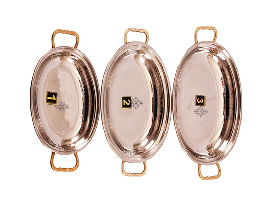 Indian Art Villa Steel Copper Set of 3 Oval Serving Platter Plates with Brass Handles combines traditional craftsmanship with modern functionality, making it a standout addition to any dining experience. Crafted with meticulous attention to detail, these plates showcase the rich cultural heritage of Indian copperware. Constructed from a blend of durable steel and high-quality copper, these oval-shaped serving platters offer an elegant and distinctive presentation for your culinary creations. The inclusion of brass handles not only adds a touch of sophistication but also ensures practicality in handling and serving. To maintain the beauty of these plates, periodic cleaning and care are recommended. The copper Nov. be polished to retain its shine and prevent tarnishing, ensuring that these serving platters remain a timeless addition to your tableware collection. Indian Art Villa Steel Copper Set of 3 Oval Serving Platter Plates with Brass Handles embodies the essence of Indian craftsmanship, bringing a touch of tradition and sophistication to your culinary experiences.