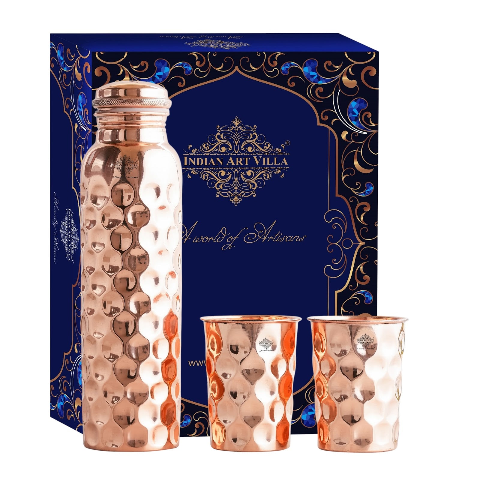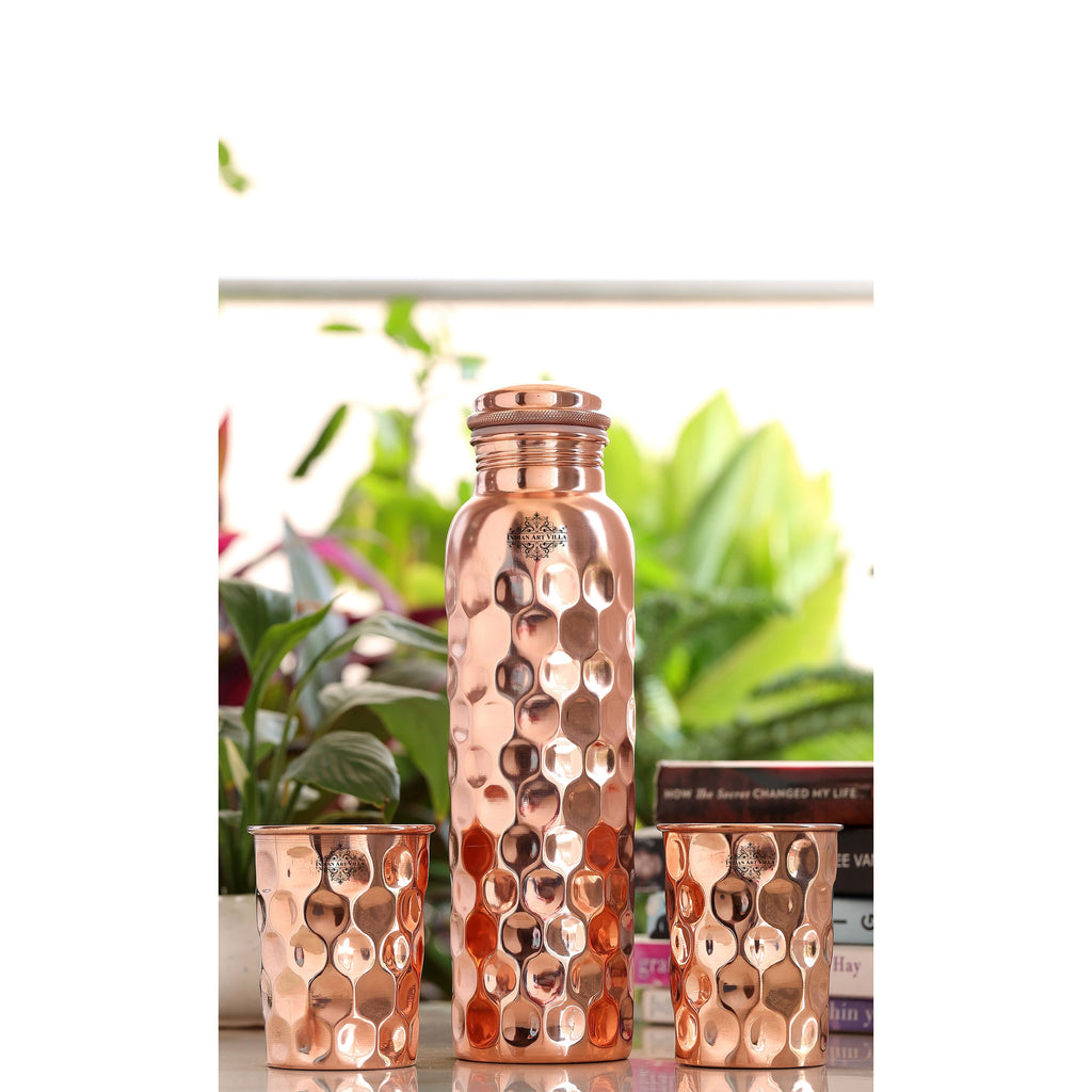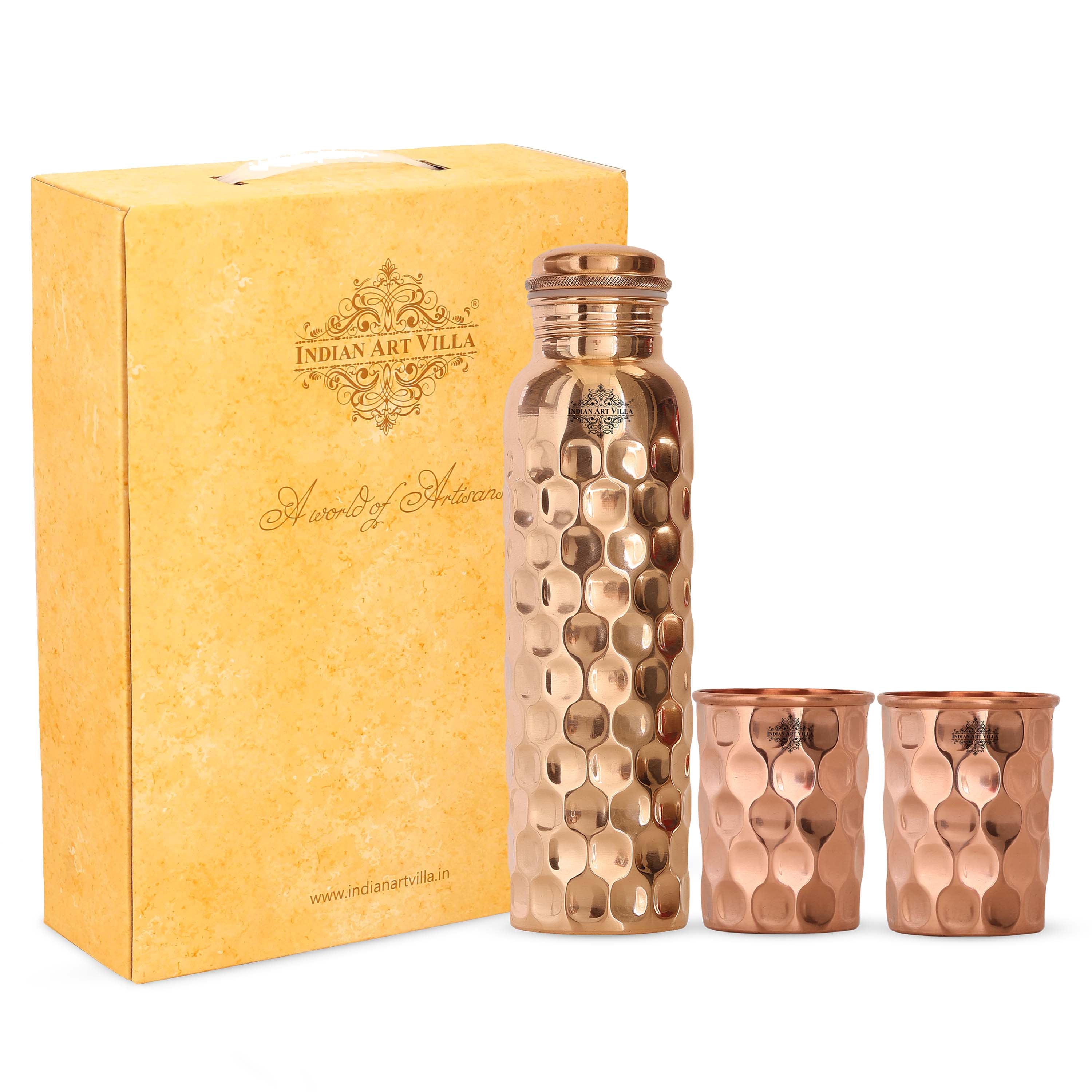 Indian Art Villa Brings Set of Pure Copper Diamond Hammered Leak Proof Water Bottle with designer cap & Two Glasses with a Gift Box, Drinkware. We offer best affordable prices & Free Shipping PAN India. We also offer Easy returns & exchanges. T&C Applied. Water stored overnight in copper utensil has innumerable health benefits. It has anti bacterial properties that helps purify water & remove toxins. It aids digestion & Weight loss. It protects us from diseases like arthritis, anemia, blood pressure, hyper thyroid, cancer and relieves us of joint pains. It has immense skin benefits too. Copper is an Antioxidant and anti-carcinogenic that prevents cell damage and slows aging. Copper is primary element to produce melanin (pigmentation of eyes, hair and skin) in human body. One should make it a habit of drinking water stored in copper utensils so as to keep themselves healthy. Storing water in copper bottles is eco-friendly and hygienic. It maintains the temperature of water Longer than usual.