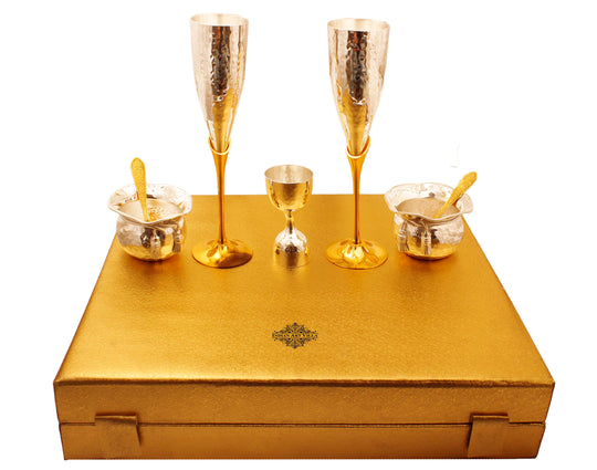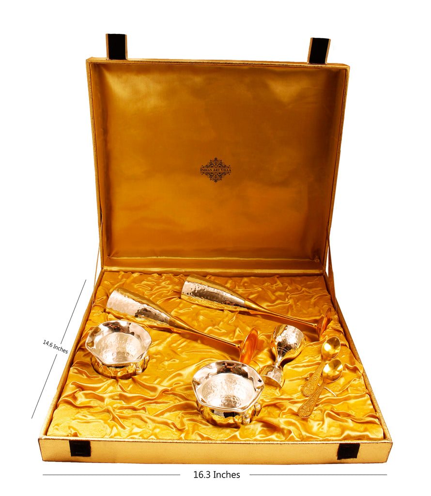 Indian Art Villa Silver & Gold Plated Barware Set, a truly precious gift set that exudes elegance and sophistication. This set includes two beautifully crafted bowls, two spoons, one peg measure, and two wing glasses, all exquisitely plated with silver and gold. The intricate detailing and stunning design of this barware set make it a standout addition to any home bar or dining setting. Whether you're entertaining guests or simply indulging in a personal treat, these luxurious pieces are sure to elevate your drinking experience. Crafted with utmost precision and attention to detail, this set showcases the fine craftsmanship that Indian Art Villa is renowned for. It makes for a perfect gift for special occasions, allowing the recipient to indulge in a touch of opulence. Add a touch of glamour and luxury to your barware collection or surprise someone with this remarkable gift set. Indian Art Villa Silver & Gold Plated Barware Set is a true statement piece that embodies beauty and sophistication.