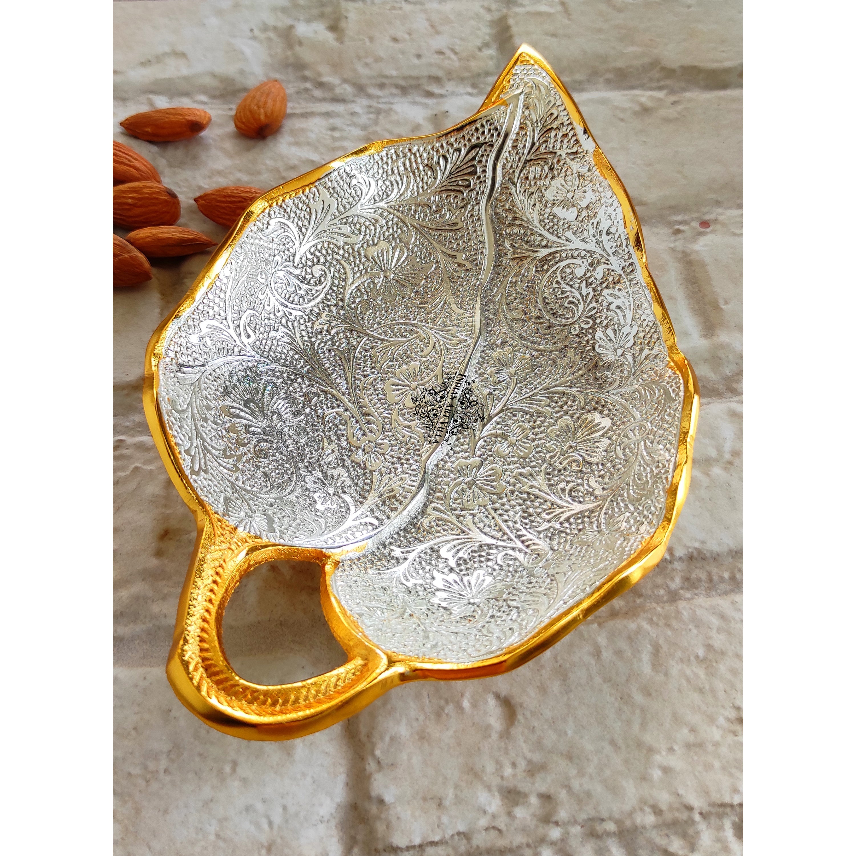 Indian Art Villa Presents Silver-plated gold Polished Aluminum Flower Engraved paan leaf Design Decorative Platter which is widely used for storing, serving and carrying food items. Praised among clients for its varied features, such as eye catching looks, excellent finishing and superb shine, the offered Decorative Platter is manufactured by our craftsmen using high grade raw material. Silver Decorative Platter along with Royal Velvet box to ensure royal look for your dining table. It can be considered as a beautiful and elegant gift for all occasions. This decorative bowl has been diligently handcrafted by skilled artisans. Serve your Royal Style with these Stylish Decorative Platter. Be it any occasion, it will only add to the elegance and royalty to your serving. Serve with love, serve in Royal Style.