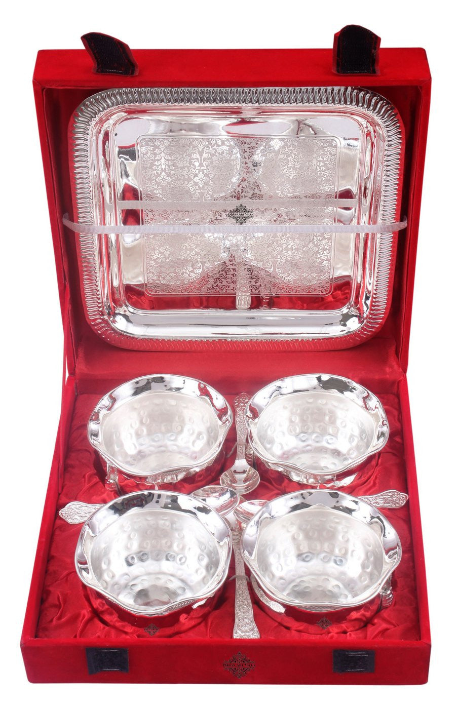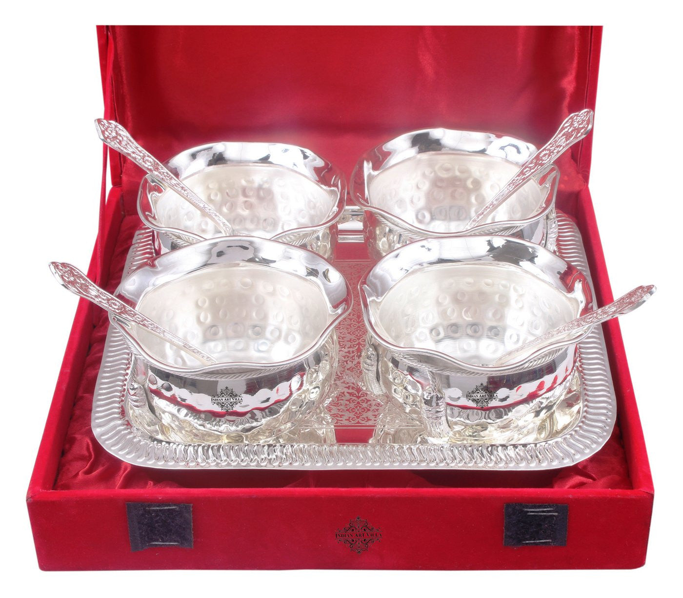 - Indian Art Villa Silver Plated Hammer Bowl with 4 Spoon & Embossed Design 1 Tray, it was almost impossible to find one that came in a design other than the plain one. Indian Art Villa Provide You with different designs to choose from, allowing you to pick your favorite design or collect them all for those who want a variety of options.