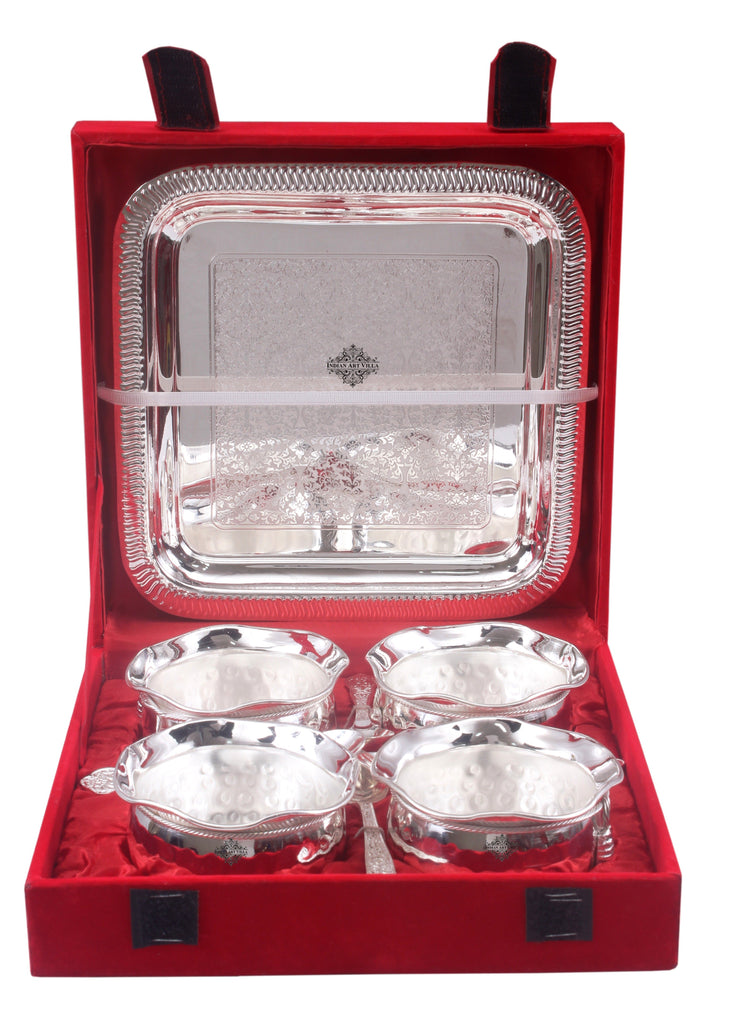 Indian Art Villa Set of 4 Silver Plated Designer Bowl with 4 Spoon & 1 Tray! This exquisite serving set is a perfect blend of elegance and functionality. Crafted with attention to detail, each bowl and spoon is beautifully silver plated, adding a touch of luxury to your dining experience. The set includes four bowls, each with its own spoon, allowing you to serve a variety of snacks, desserts, or condiments. The accompanying tray provides a stylish and convenient way to display and serve your culinary creations. Whether you're hosting a dinner party or simply enjoying a cozy family meal, this set is sure to impress your guests. With its deep dish design and intricate detailing, this serving set doubles as a decorative gift item. It can be a delightful addition to any home decor, adding a touch of sophistication to your dining table or kitchen countertop. Elevate your dining experience and showcase your impeccable taste with the Indian Art Villa Set of 4 Silver Plated Designer Bowl with 4 Spoon & 1 Tray.