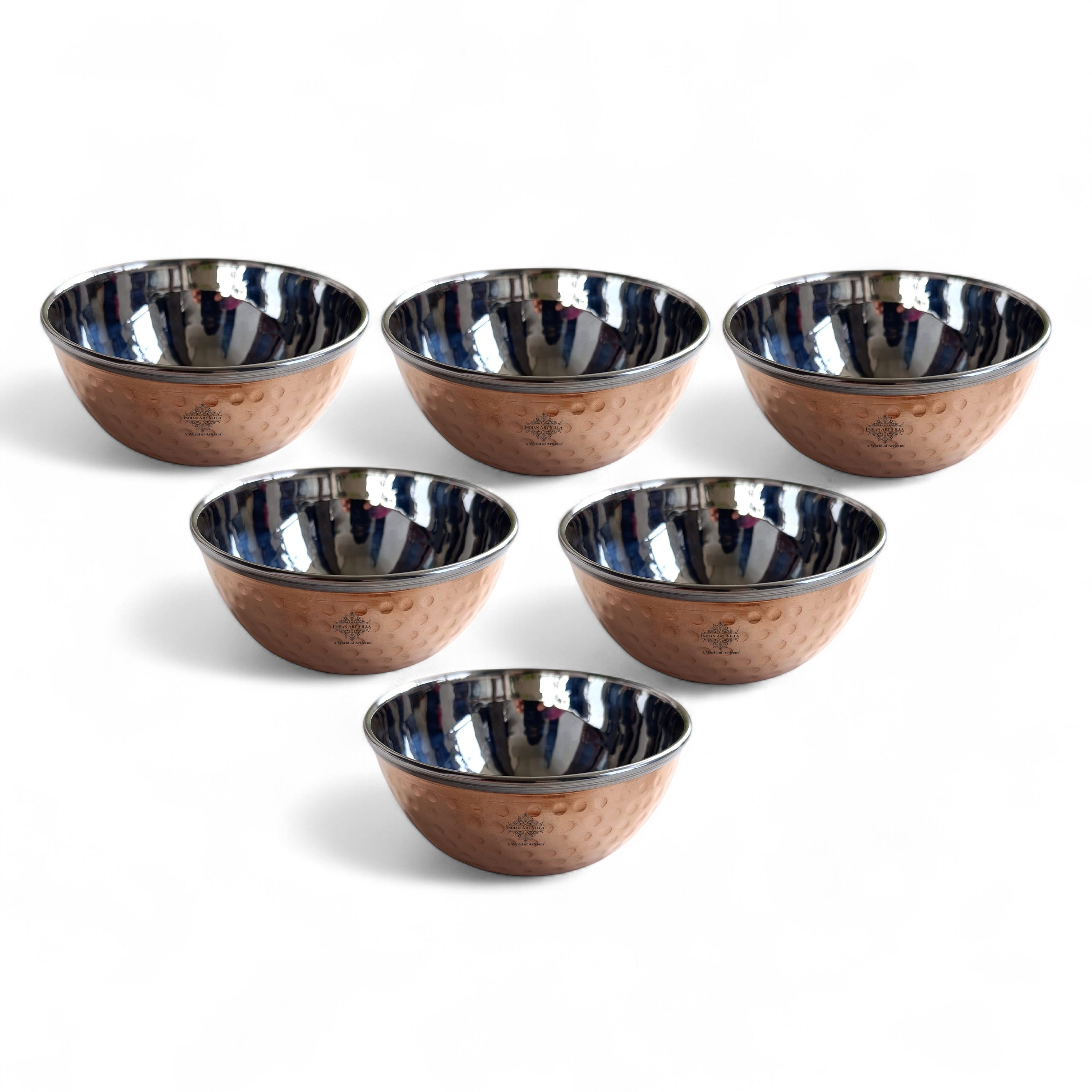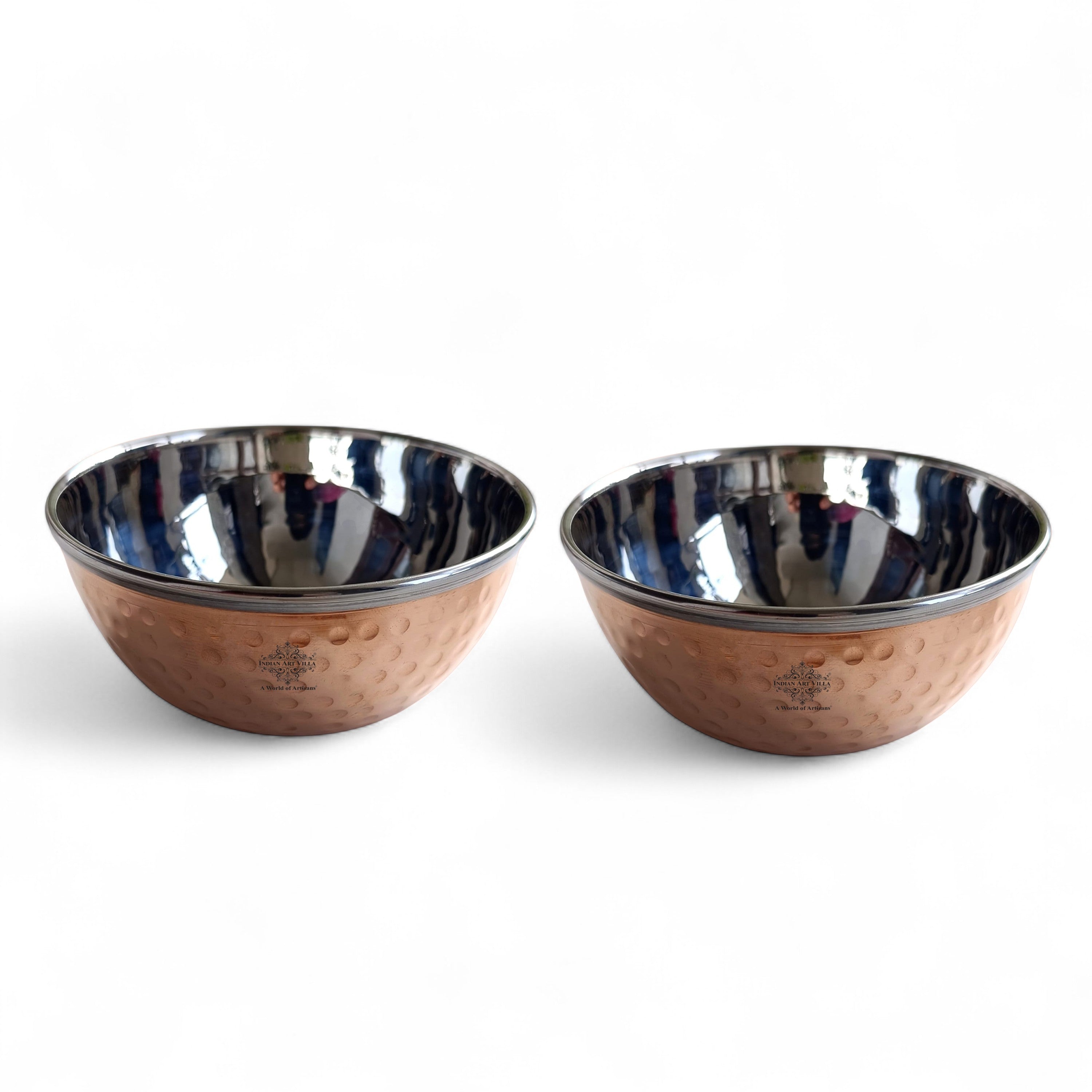 Designed with a food-safe, stainless-steel interior. The hammered copper finish gives it a vintage look, while the lacquer coating ensures easy maintenance and lasting shine, this bowl ensures hygiene, durability, and compatibility with all types of foods. Whether you're serving hot dal, savory curries, vegetables, desserts. the stainless-steel lining prevents any reaction with food and retains its natural flavors. Its robust dual-metal construction offers the perfect balance of style and strength.