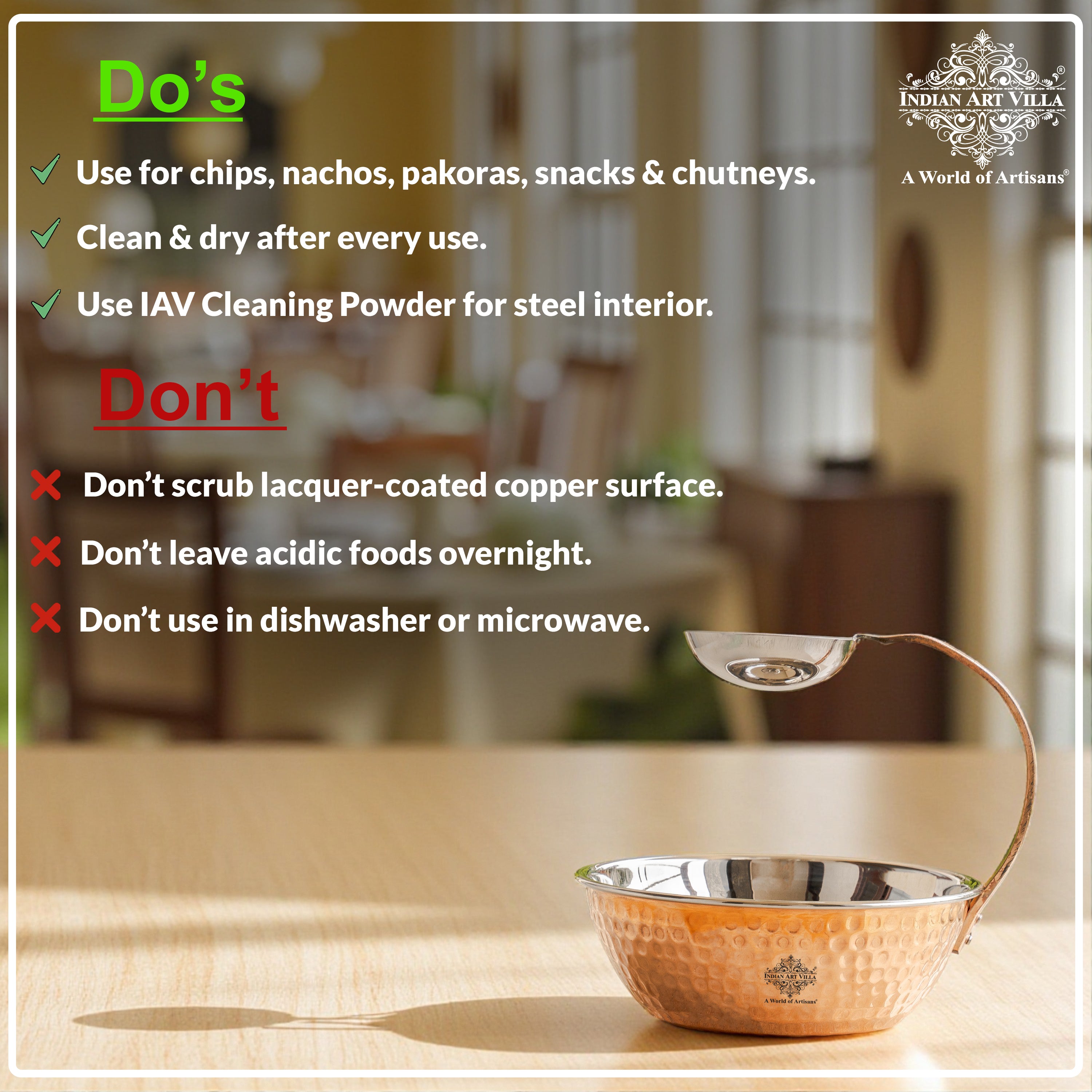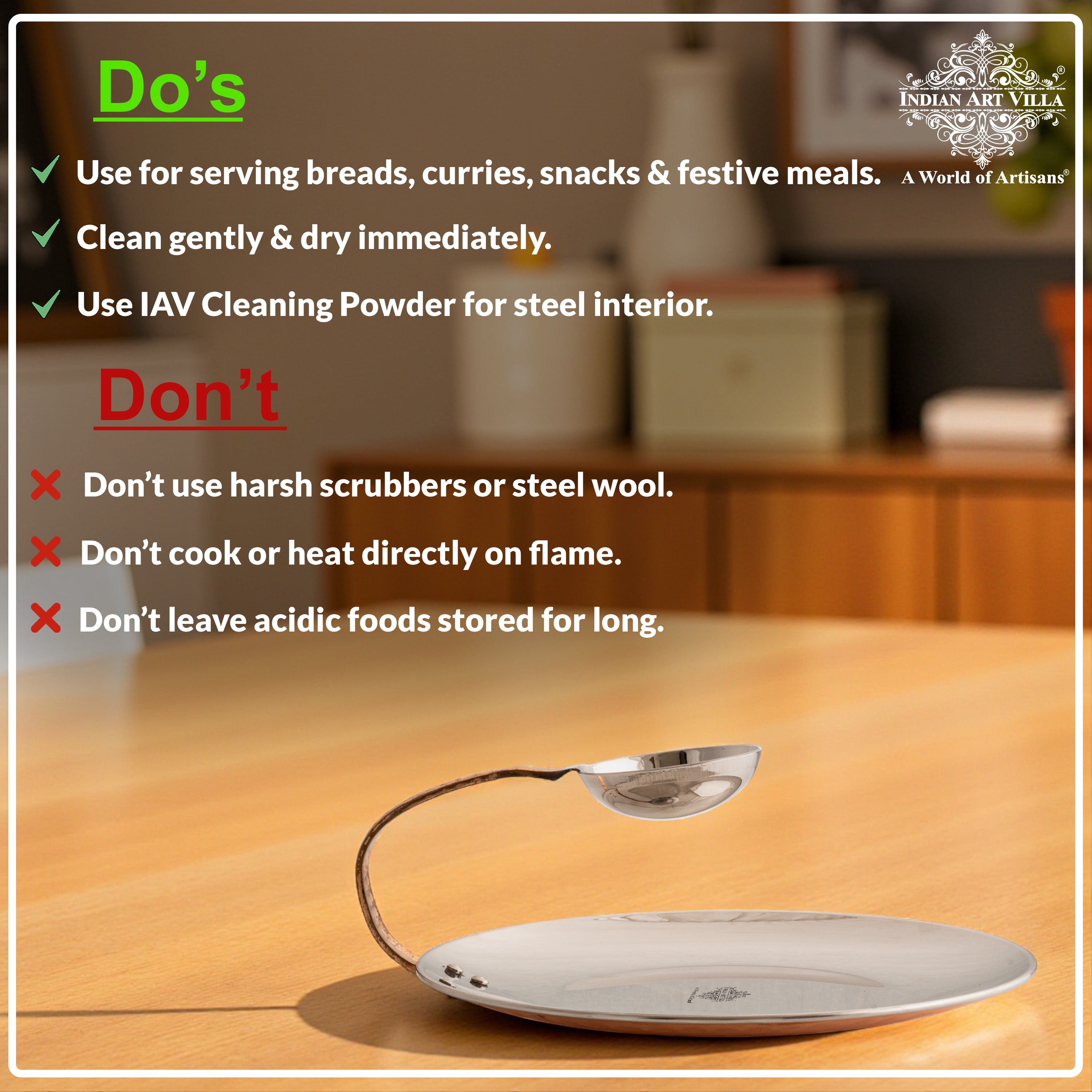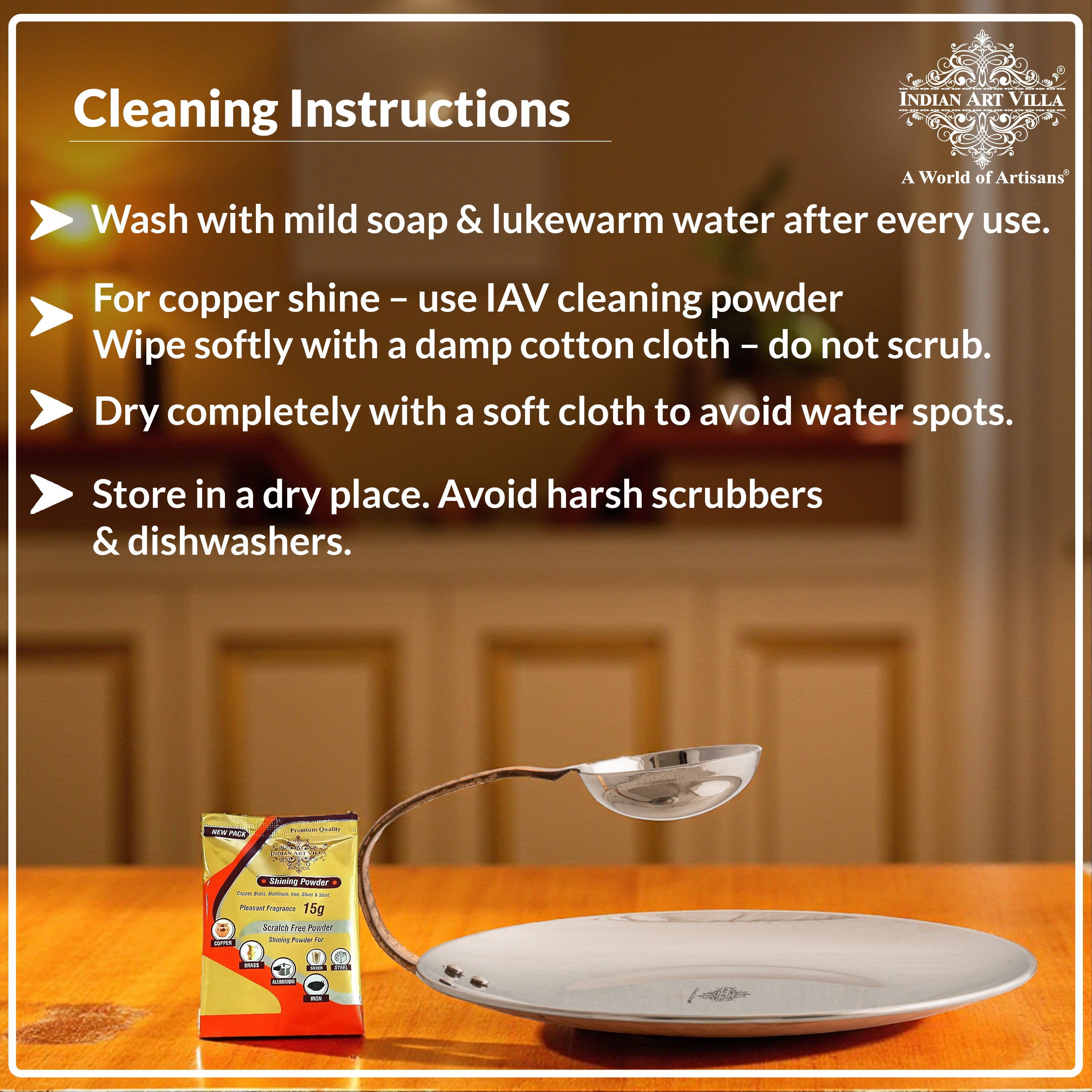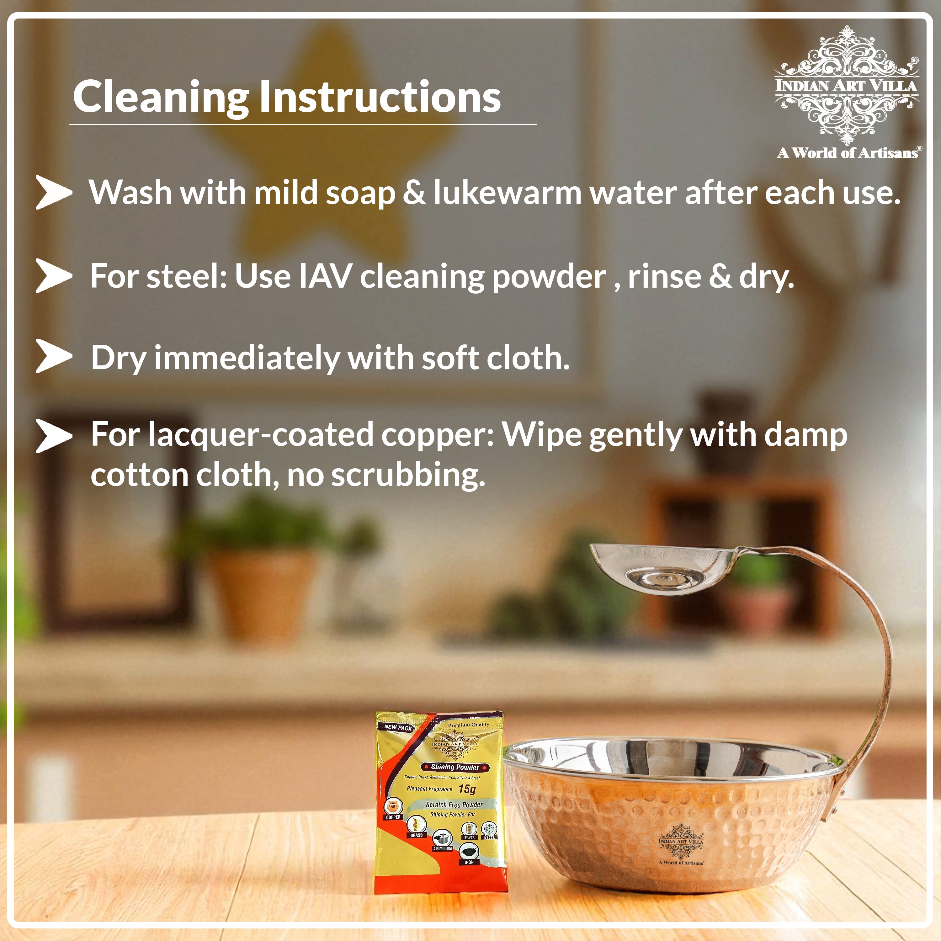 - Our Products come with INDIAN ART VILLA Care instruction Booklet & Sample Cleaning Powder, so our customer cum family faces no problem while using the product.